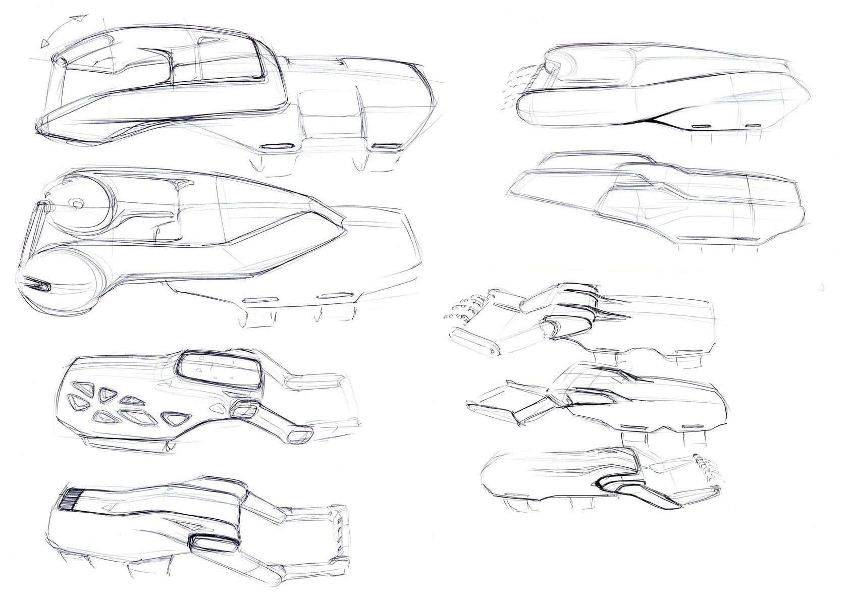 Рисовать эскизы пришлось практически наугад — ни одного «живого» тренажёра, чтобы посмотреть, как там всё устроено, нам не дали. Так что к началу работы у нас в активе имелось только несколько просмотренных видеороликов, на которых было снято, как такие устройства работают.
