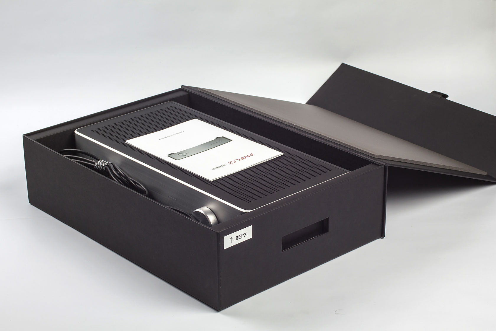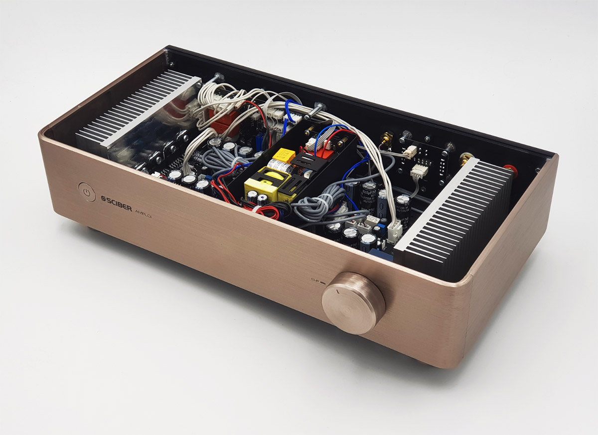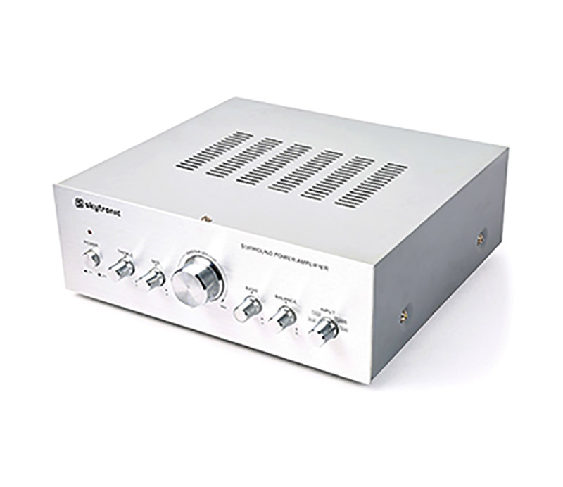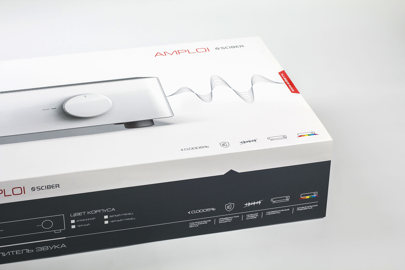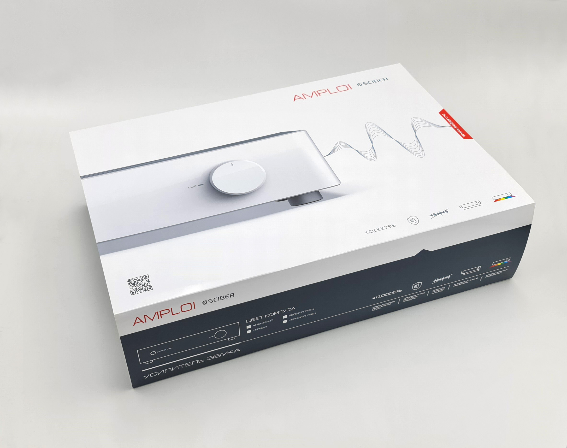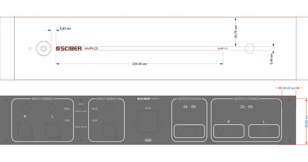 Внешние элементы корпуса — лицевая панель, кнопка включения и светодиод, светодиод «клиппинг», регулятор громкости. Опционально — ИК-ресивер для усилителя с пультом ДУ.