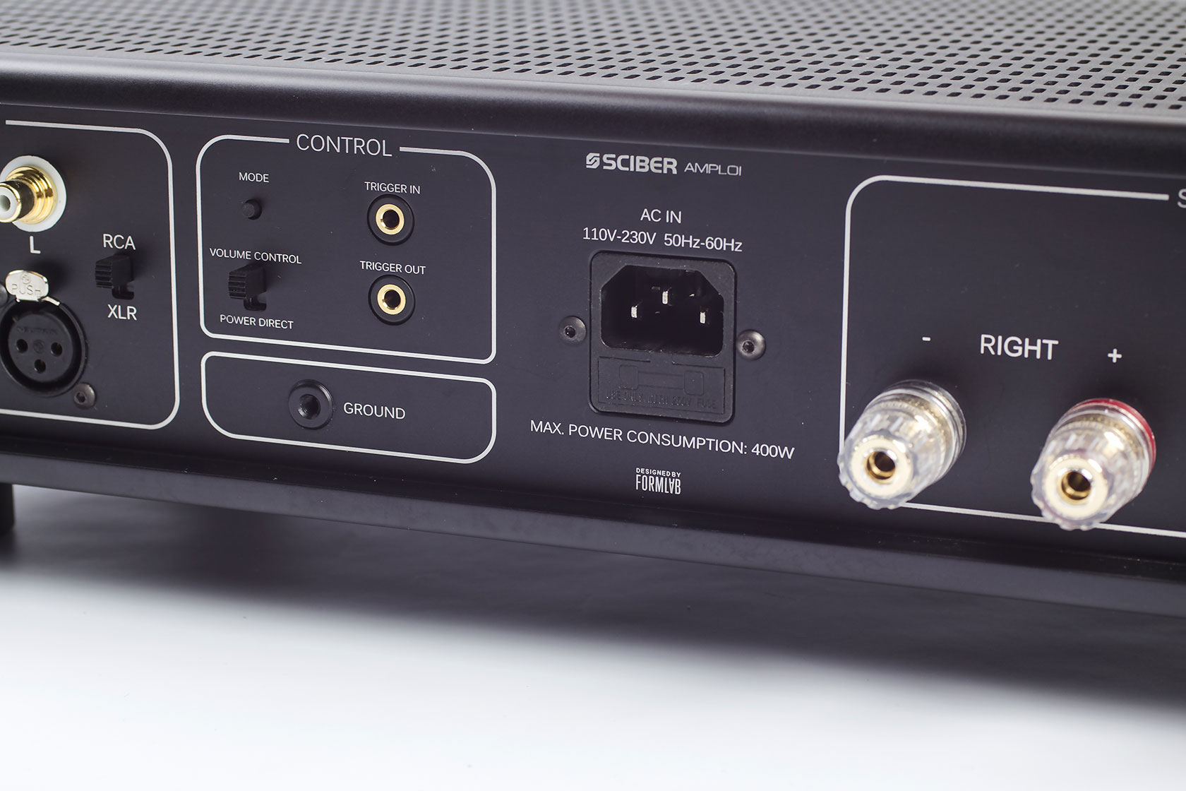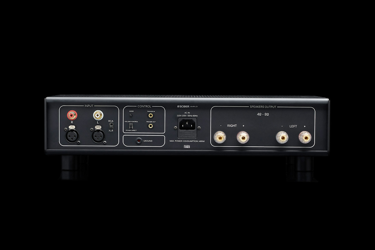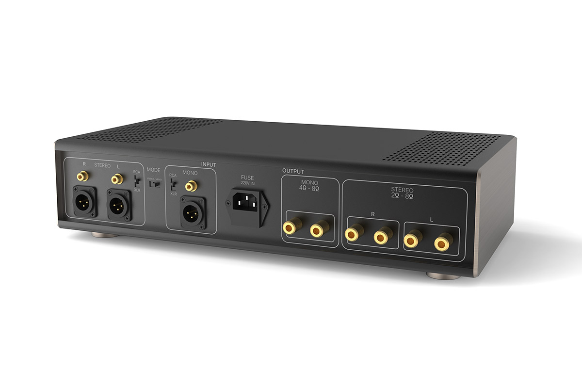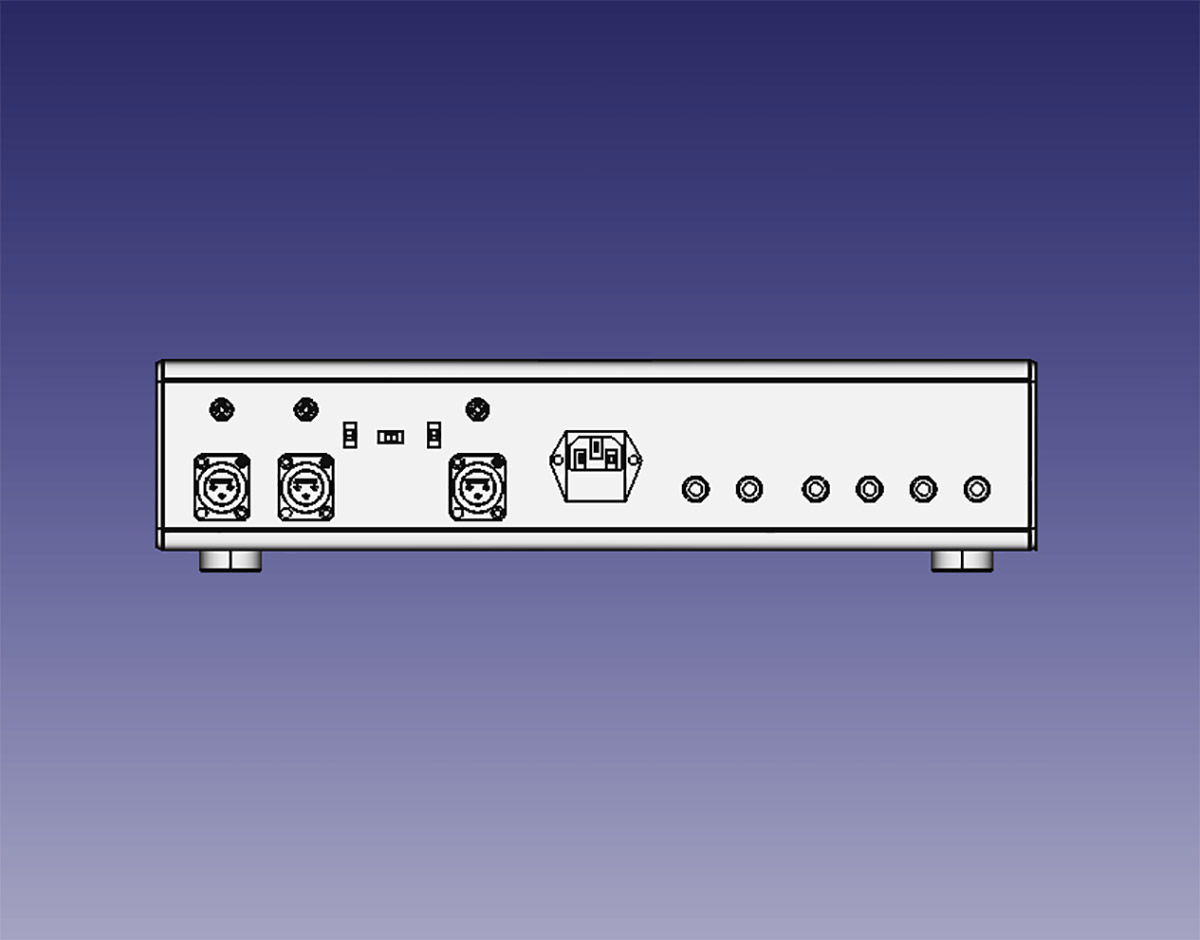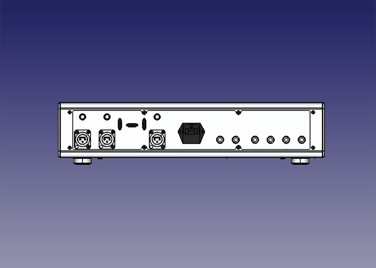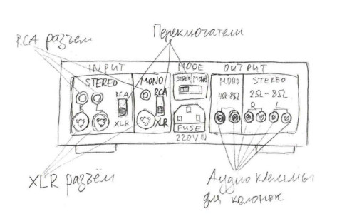 На задней панели будут расположены разъёмы — питания, по два входа RCA и XLR для режима «стерео», по одному RCA XLR для режима «моно», четыре выхода типа banana для режима стерео и два — для моно; переключатели: режима Stereo/Mono, переключатели RCA/XLR, а также два разъёма 3,5 jack — IN/OUT.