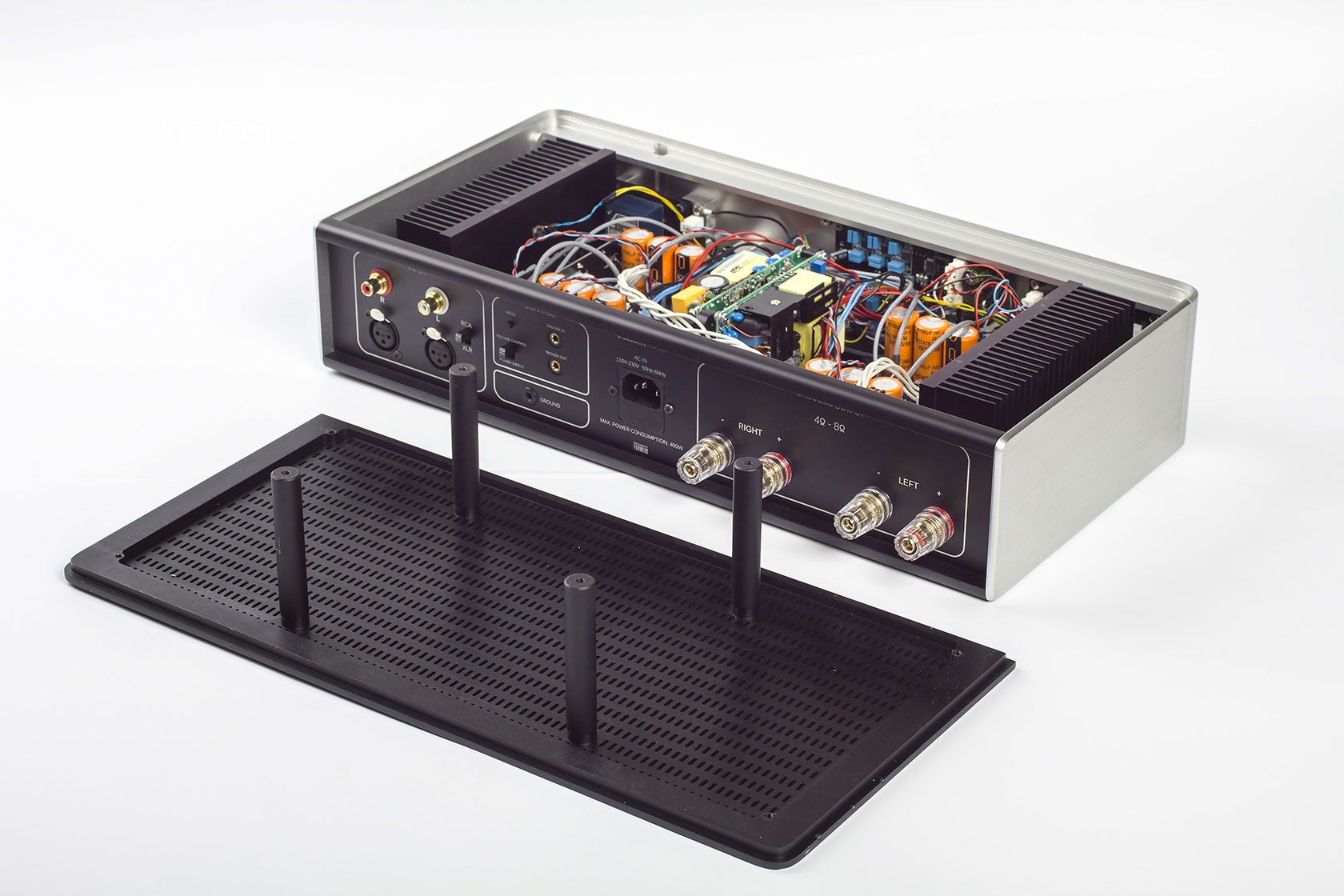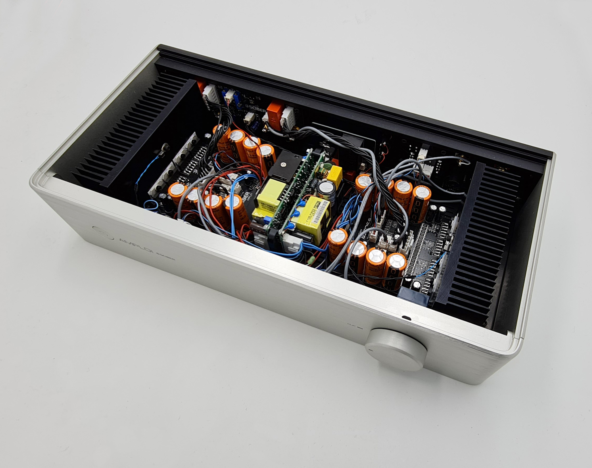На словах: усилитель состоит из корпуса, двух электронных плат, к которым прикреплены два радиатора (по одному на каждую), двух же блоков питания, платы защиты и коммутации и (опционально) платы для пульта ДУ.