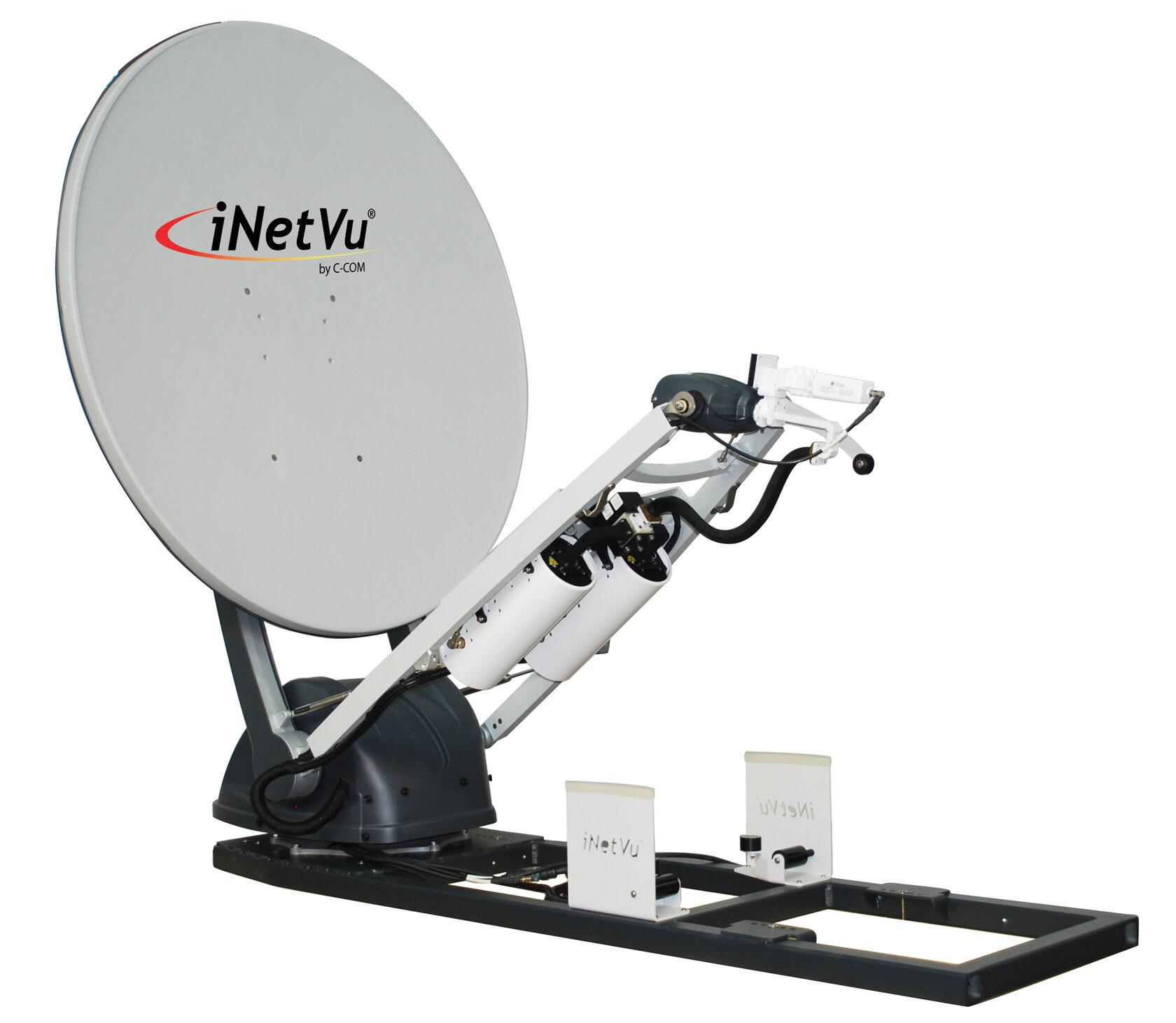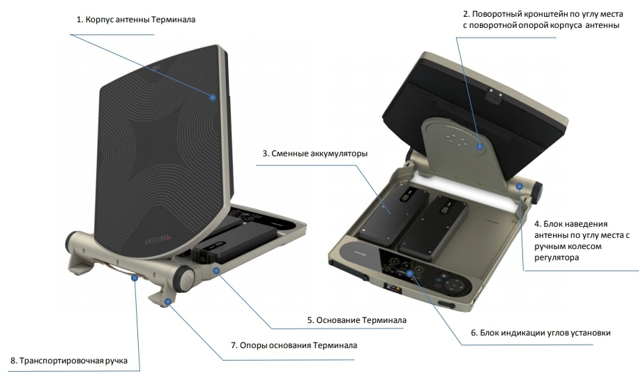 Терминал спутниковой связи состоит из корпуса антенны (лицевая часть сделана из радиопрозрачного материала), поворотного кронштейна по углу места с поворотной опорой корпуса антенны (настройка поляризации), сменных аккумуляторов, поддерживающих «горячую» замену, блока наведения антенны и блока индикации углов установки, основания терминала, опоры основания и транспортировочной ручки.