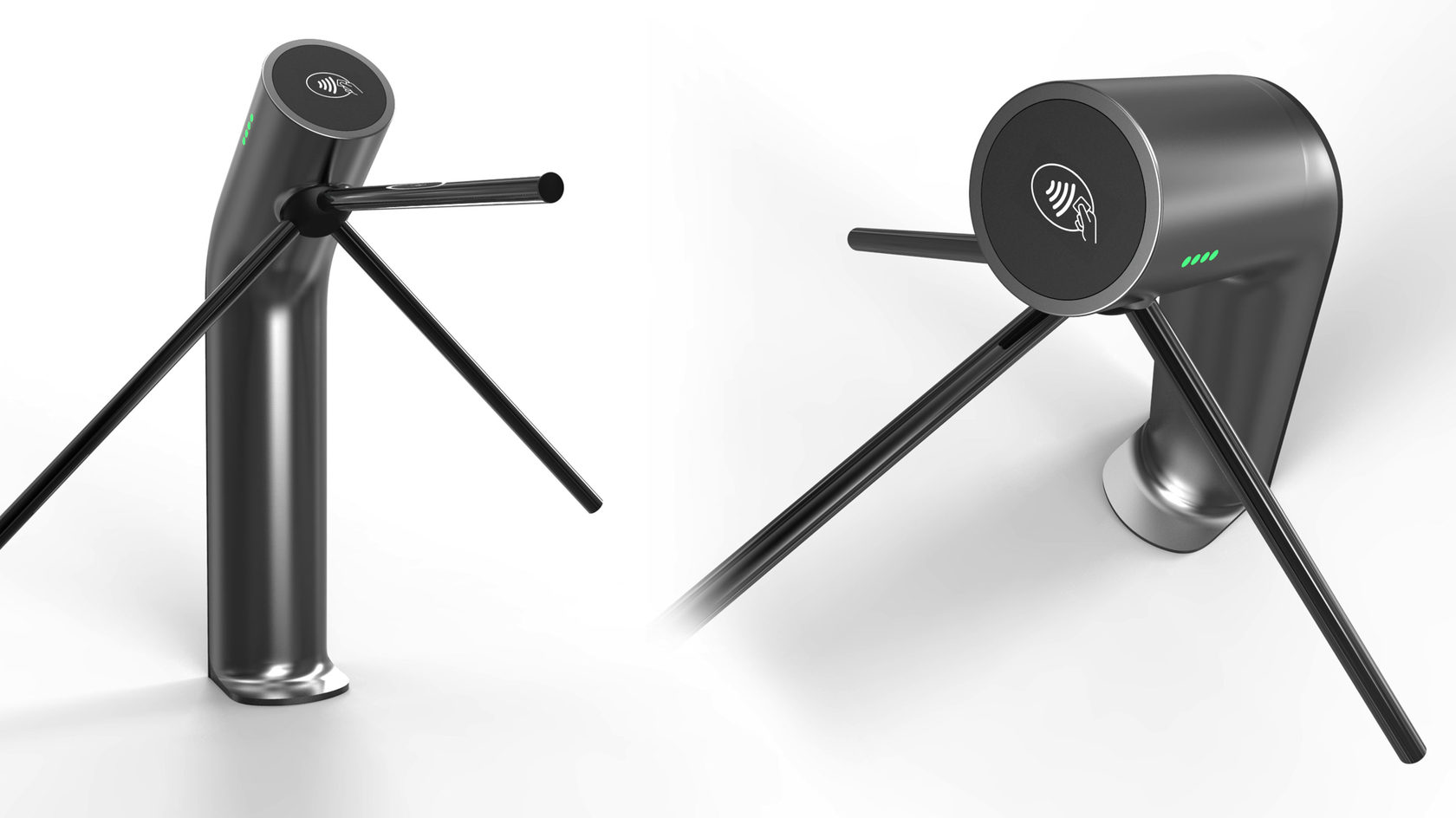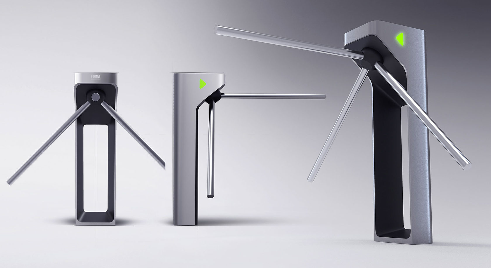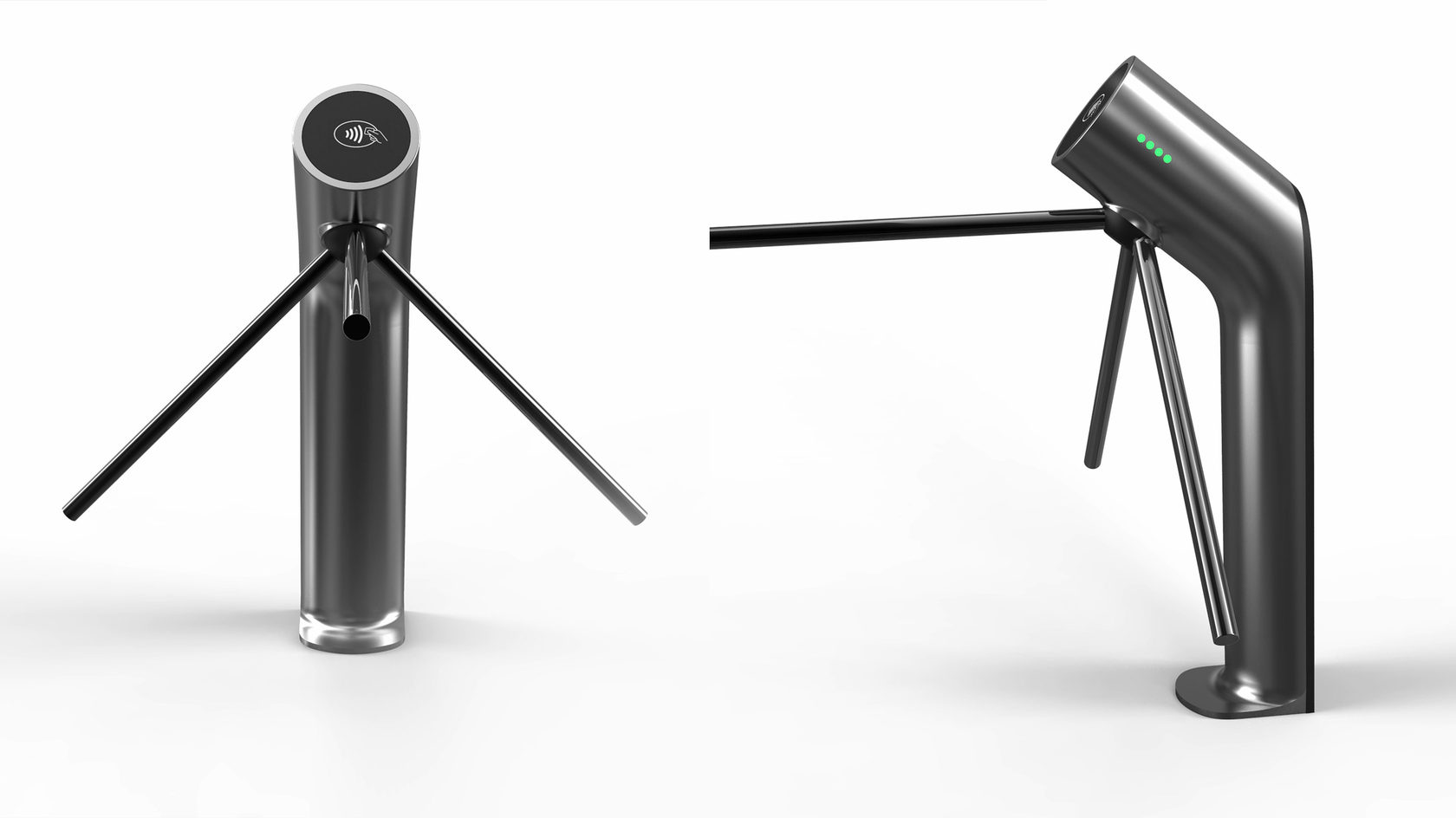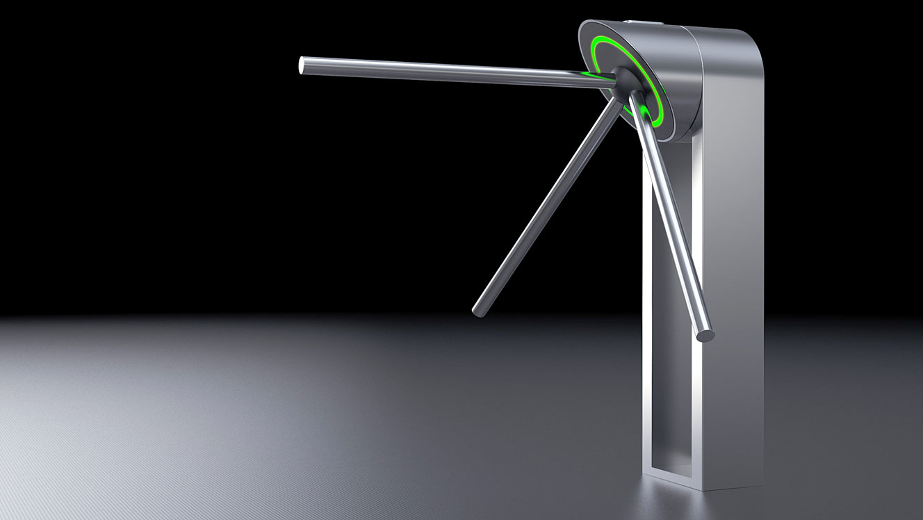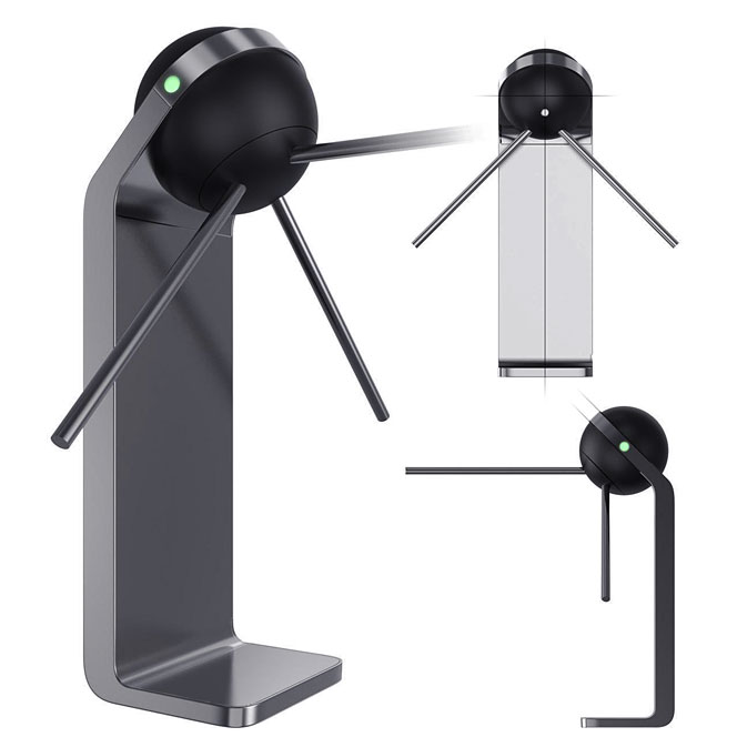 Знакомый всем турникет: простой, железный, унылый — с угловатыми формами. Используется для обеспечения пропускного режима. Конструкция проста: в стойке сосредоточена вся электроника, верхняя часть — картридер и механическая часть, опускающиеся и поднимающиеся металлические планки (тренога). Есть пульт управления.