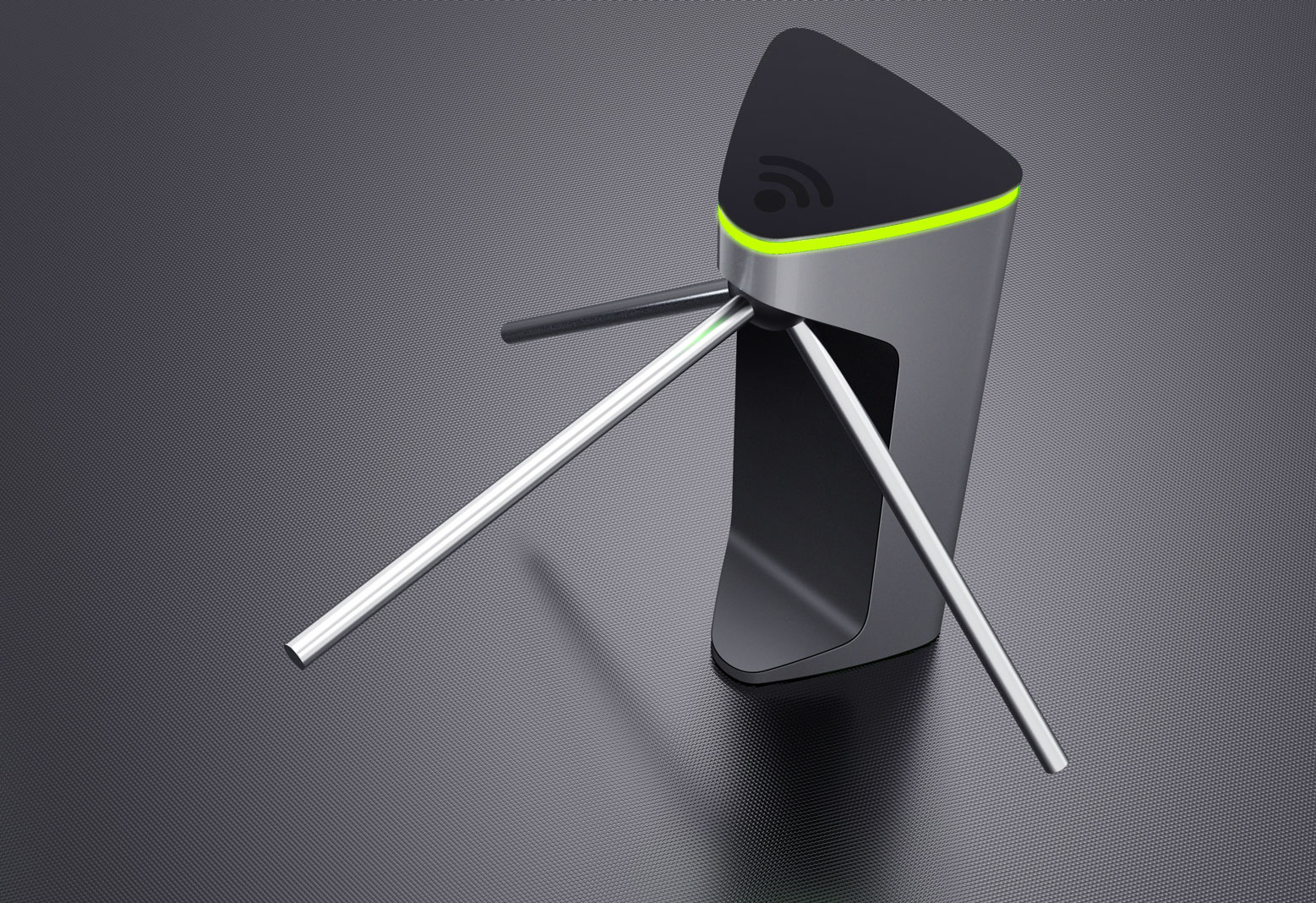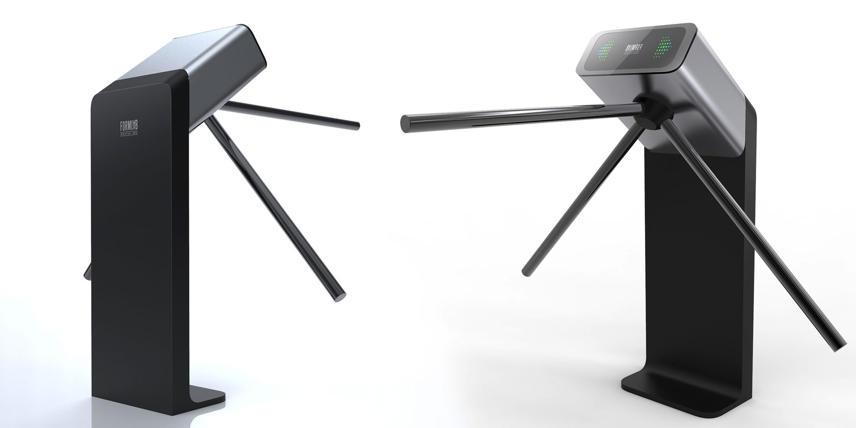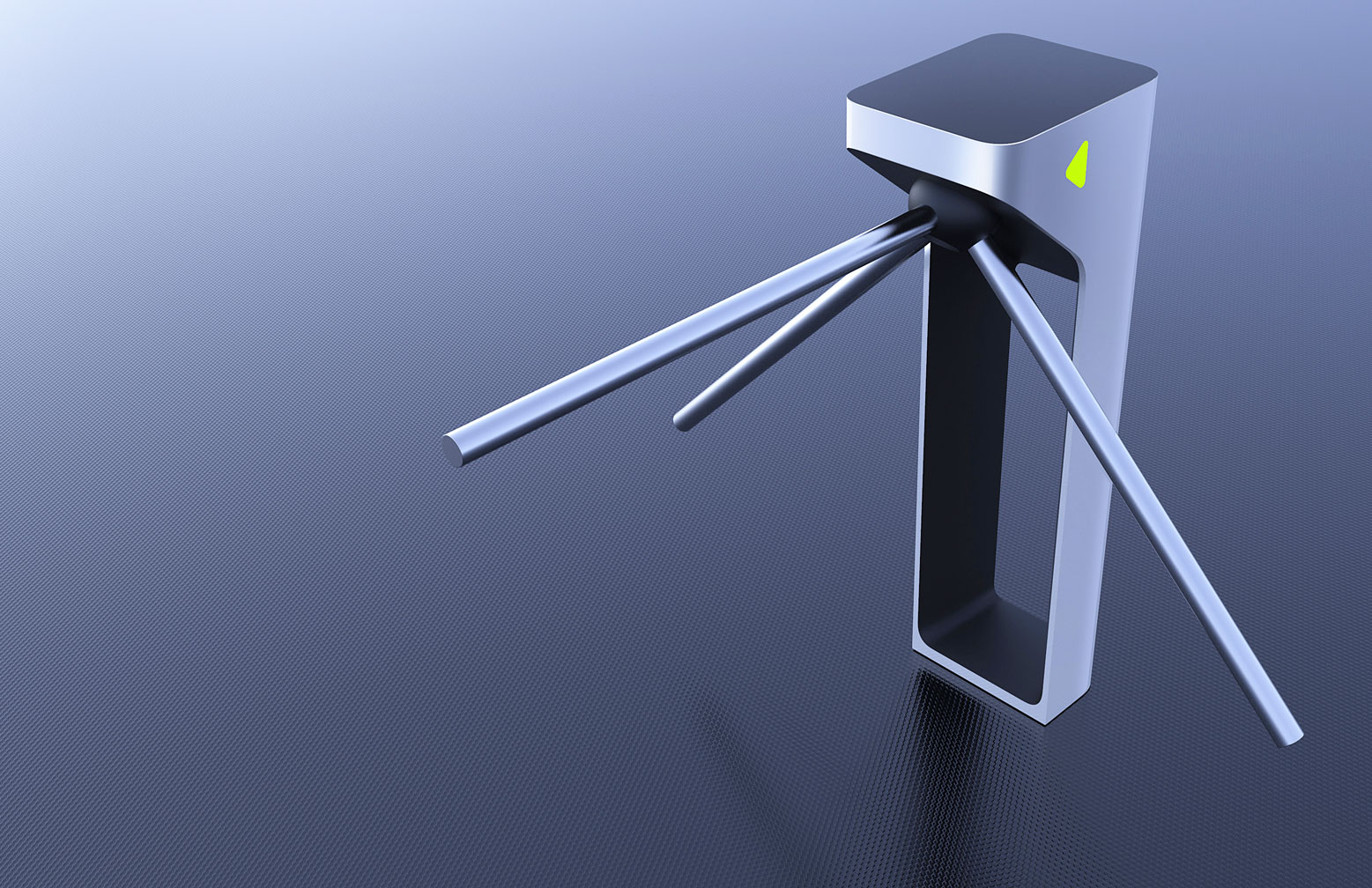 Знакомый всем турникет: простой, железный, унылый — с угловатыми формами. Используется для обеспечения пропускного режима. Конструкция проста: в стойке сосредоточена вся электроника, верхняя часть — картридер и механическая часть, опускающиеся и поднимающиеся металлические планки (тренога). Есть пульт управления.