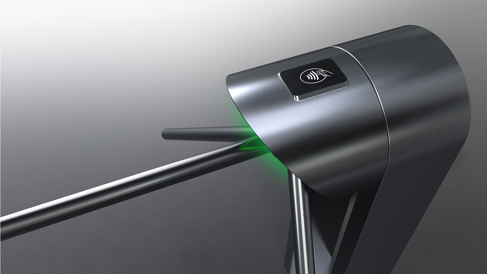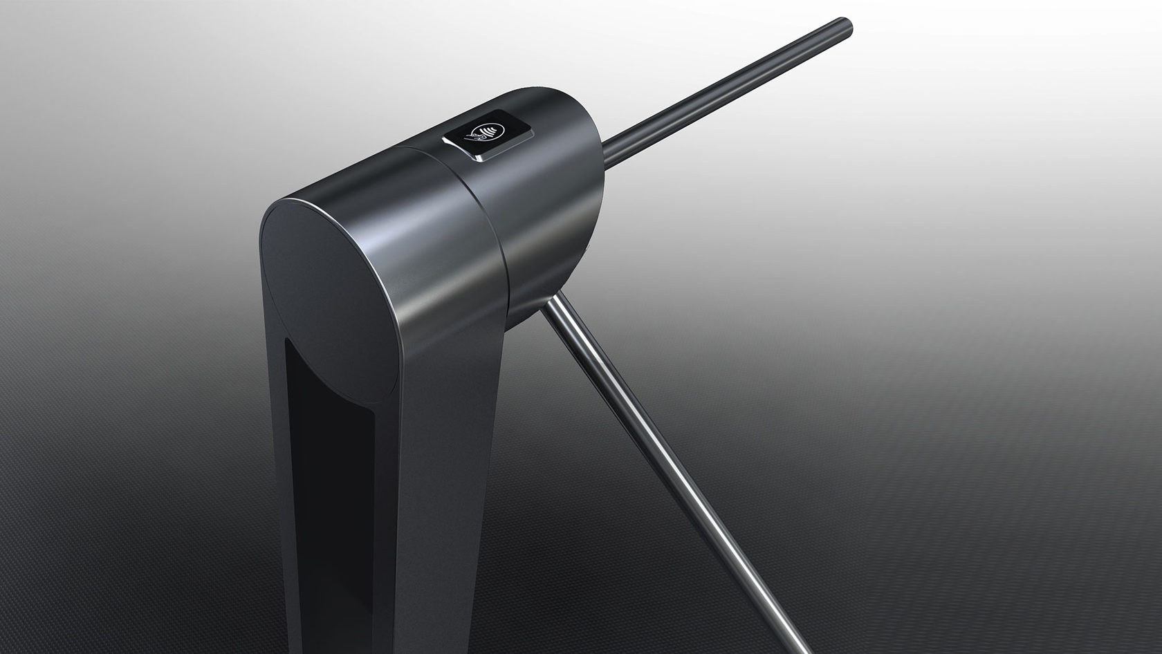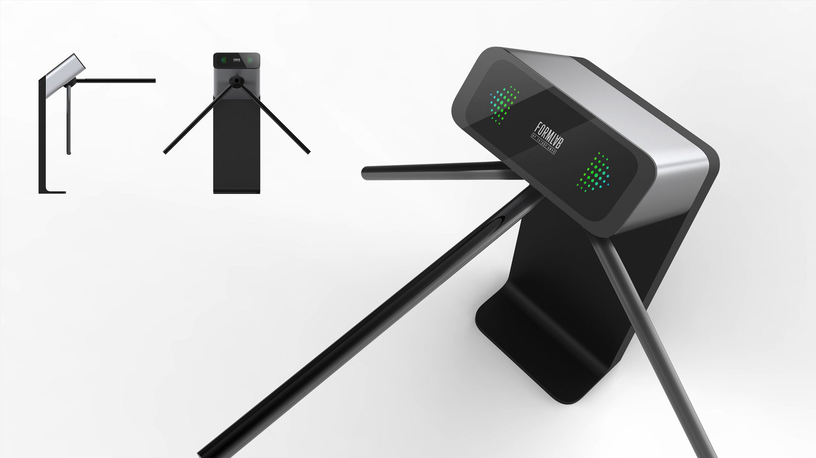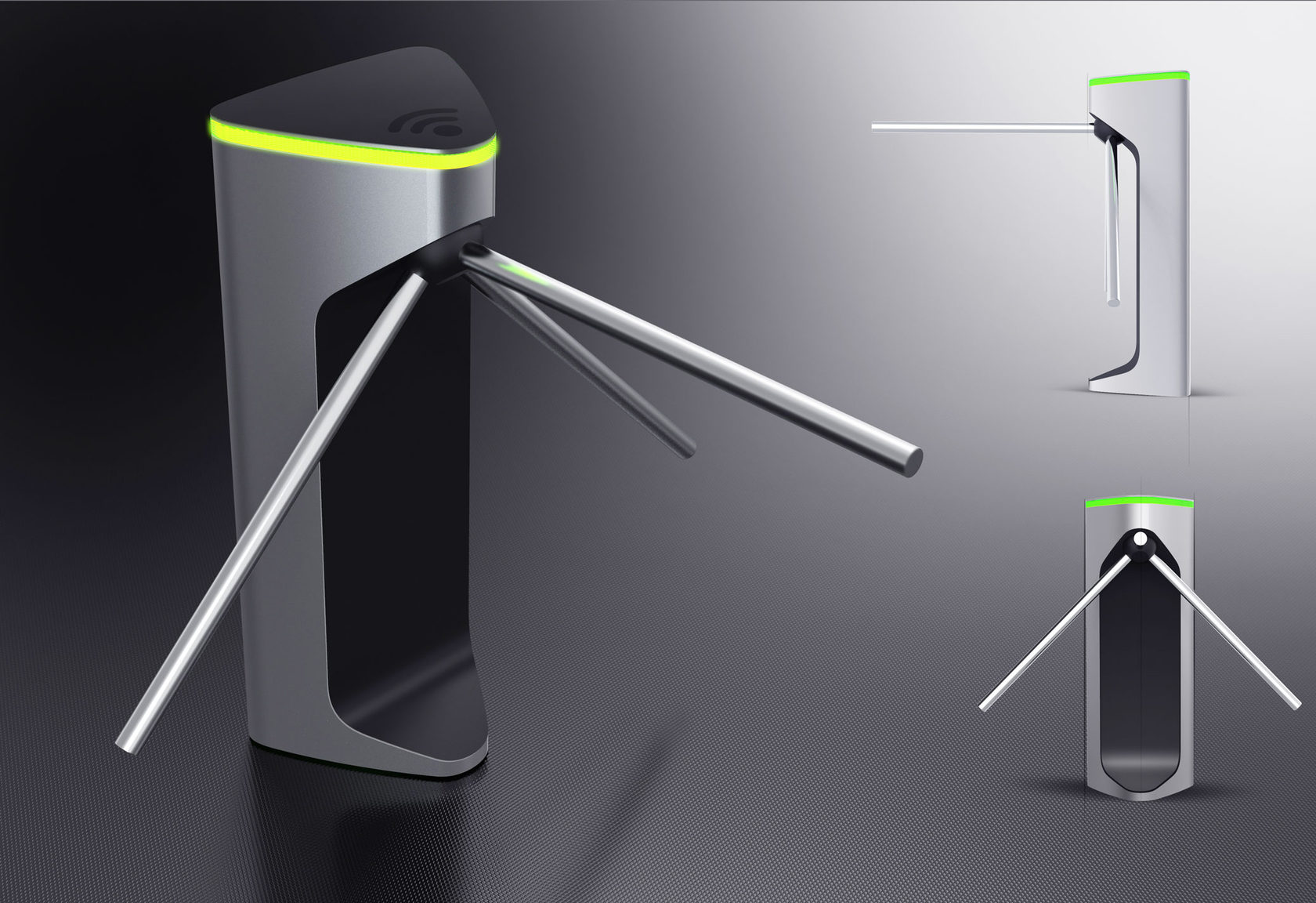 Знакомый всем турникет: простой, железный, унылый — с угловатыми формами. Используется для обеспечения пропускного режима. Конструкция проста: в стойке сосредоточена вся электроника, верхняя часть — картридер и механическая часть, опускающиеся и поднимающиеся металлические планки (тренога). Есть пульт управления.