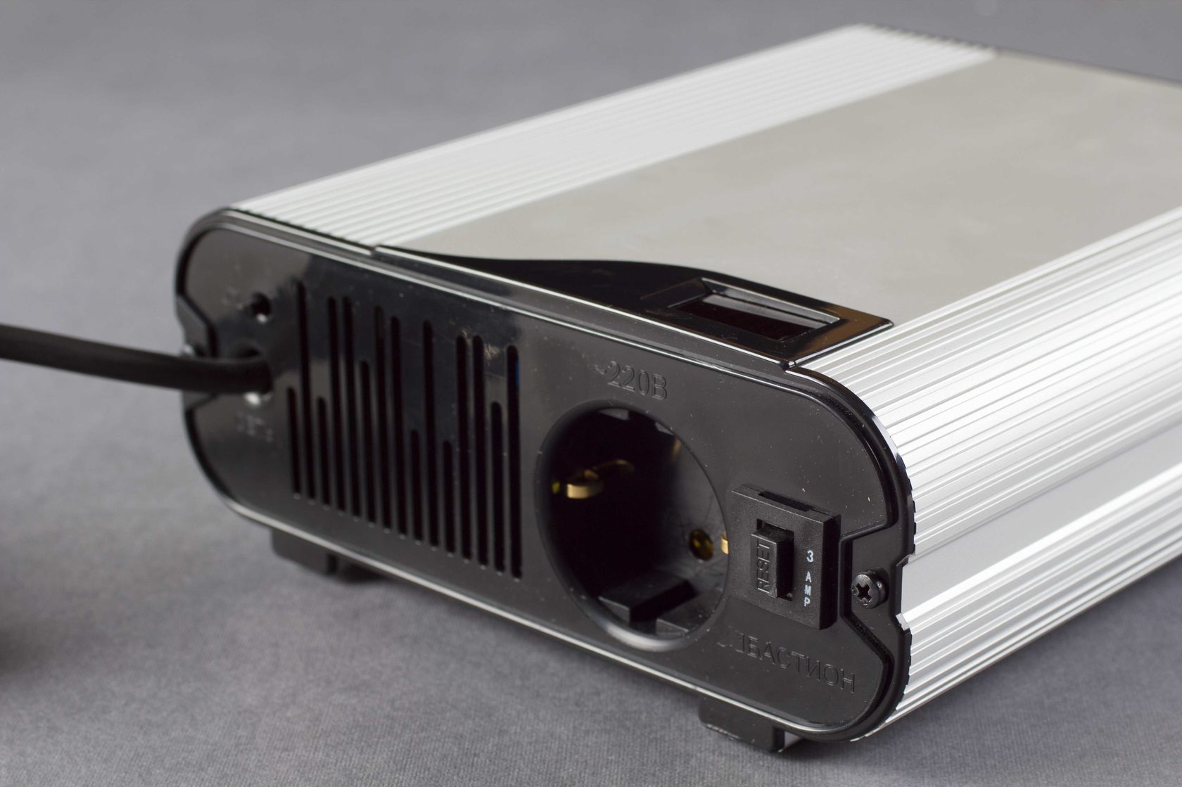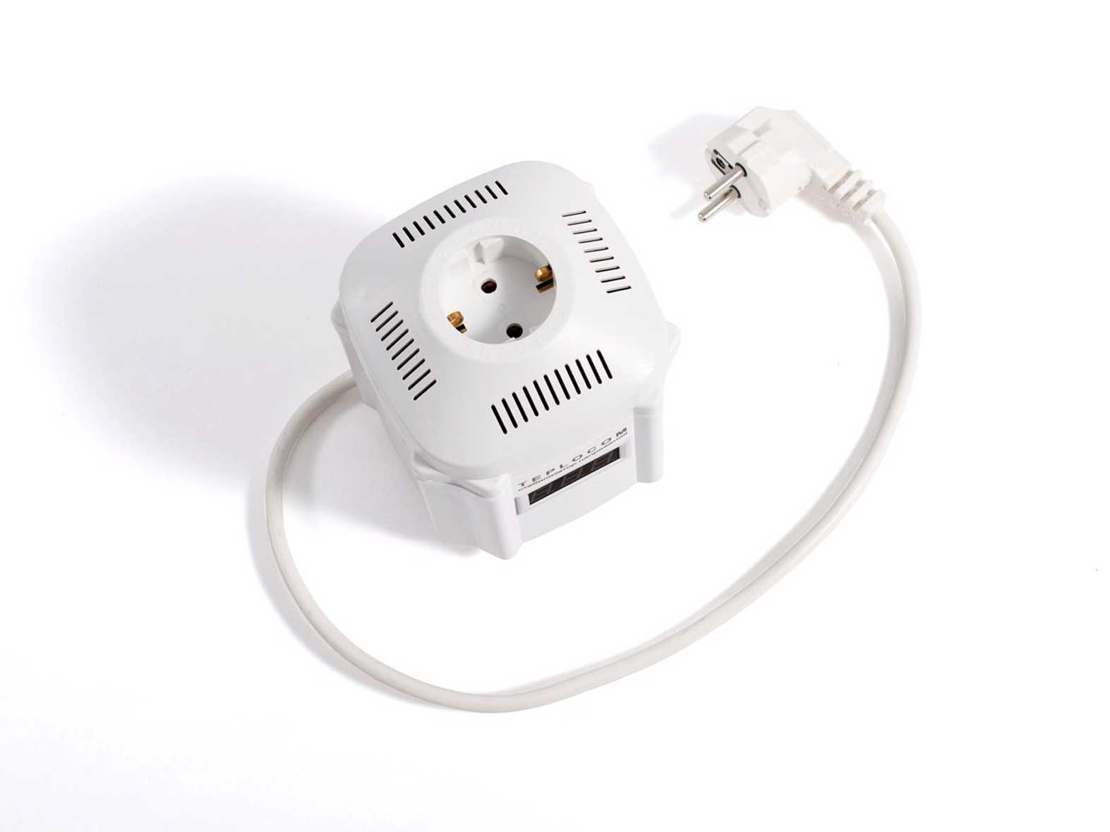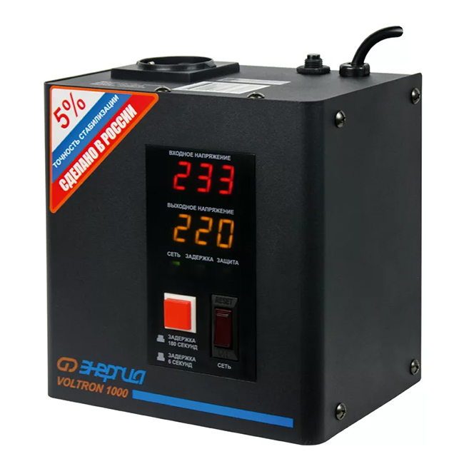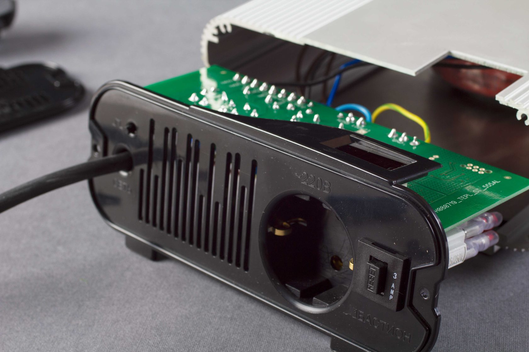 Стабилизатор состоит из корпуса, платы управления, тороидального трансформатора на 220 или 555 ВА (именно его габариты меняются), интегрированной в корпус розетки и сетевого шнура. Из внешних компонентов — экран, на котором отображается напряжение в сети, а также обязательные вентиляционные отверстия в корпусе — для охлаждения электроники.