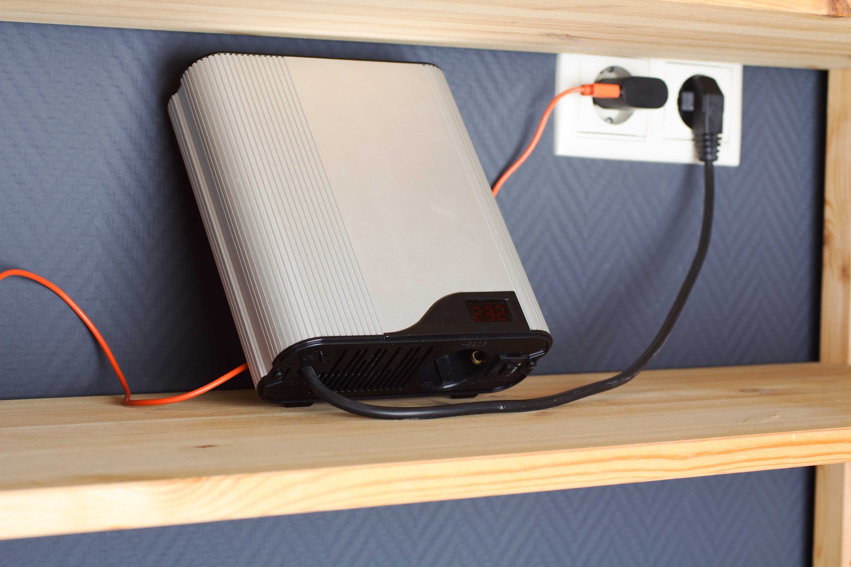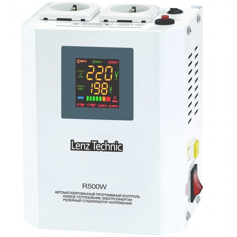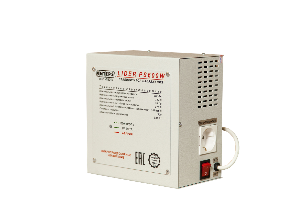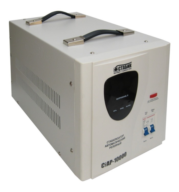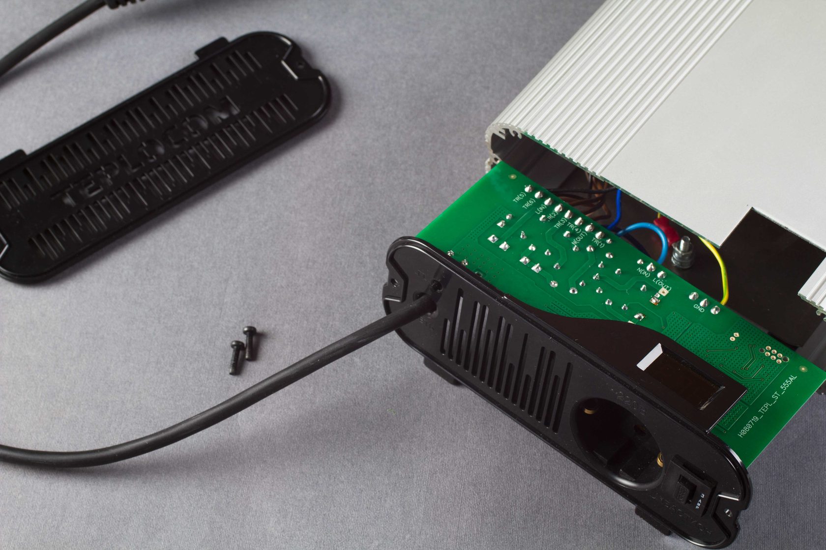 Стабилизатор состоит из корпуса, платы управления, тороидального трансформатора на 220 или 555 ВА (именно его габариты меняются), интегрированной в корпус розетки и сетевого шнура. Из внешних компонентов — экран, на котором отображается напряжение в сети, а также обязательные вентиляционные отверстия в корпусе — для охлаждения электроники.