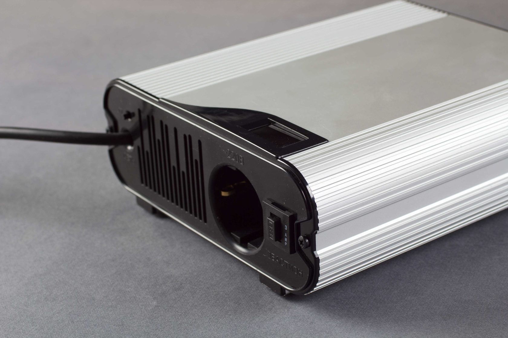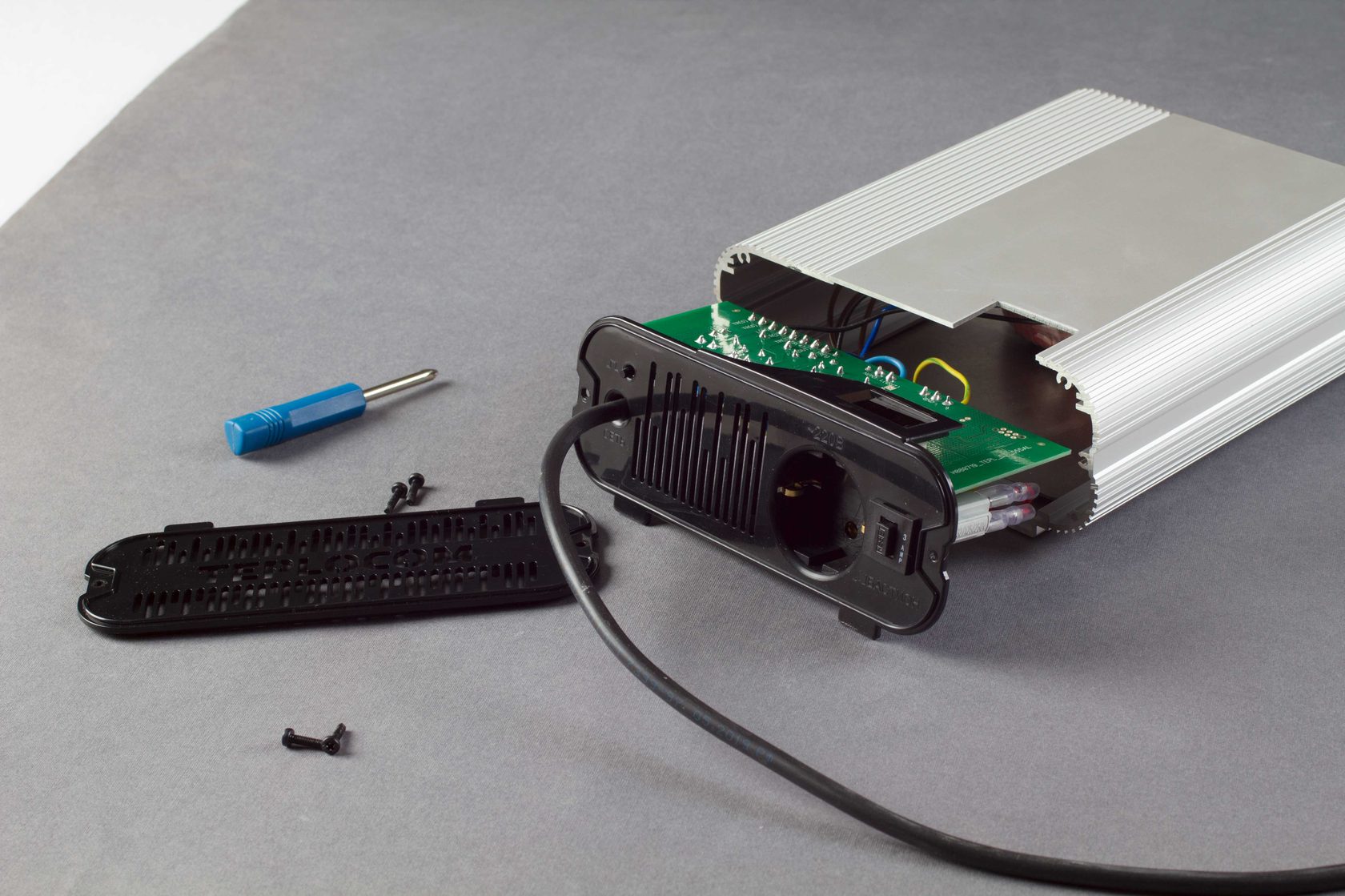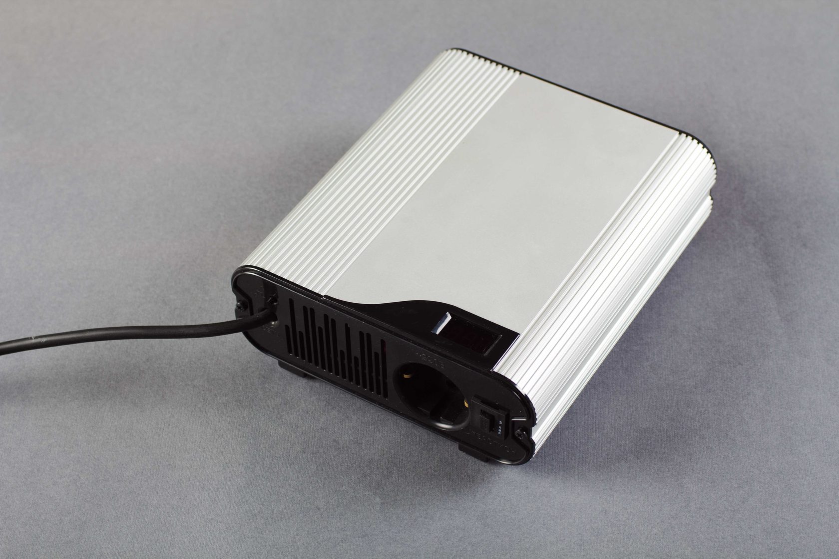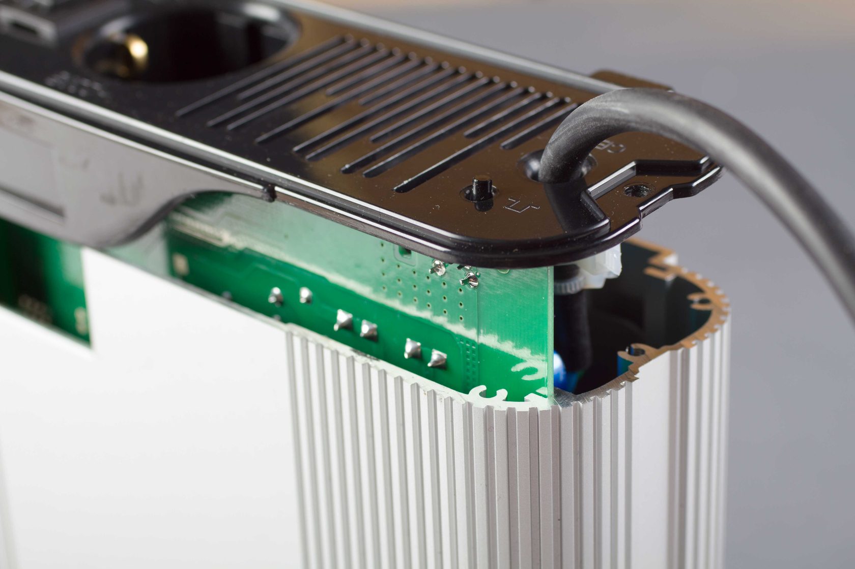 Стабилизатор состоит из корпуса, платы управления, тороидального трансформатора на 220 или 555 ВА (именно его габариты меняются), интегрированной в корпус розетки и сетевого шнура. Из внешних компонентов — экран, на котором отображается напряжение в сети, а также обязательные вентиляционные отверстия в корпусе — для охлаждения электроники.