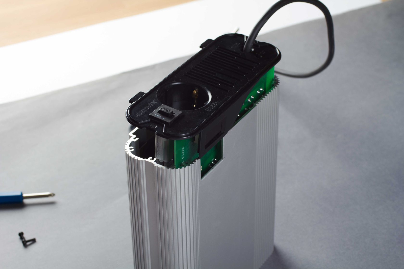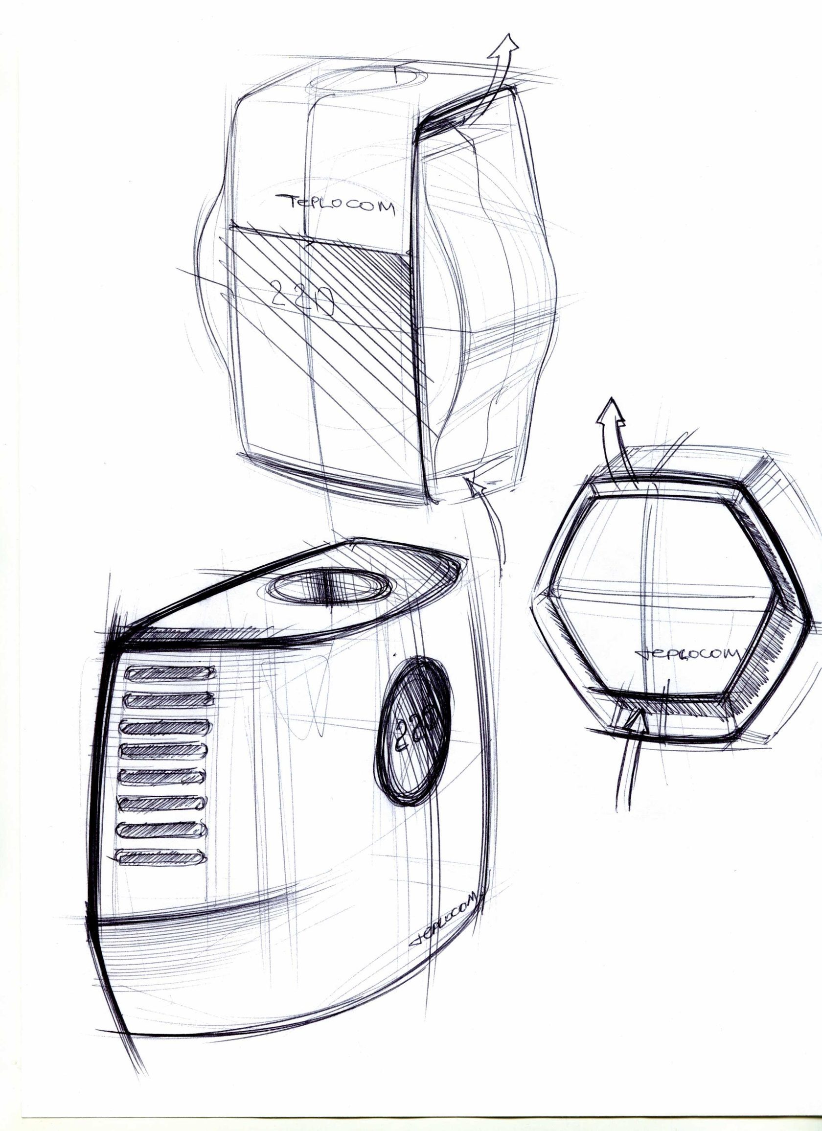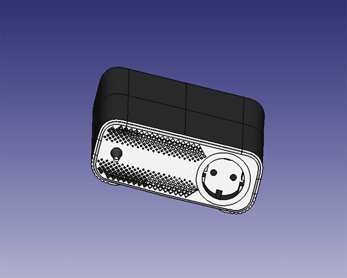 Итак, берём за основу первый эскиз, убираем розетку с верхней грани и устанавливаем на нижнюю (ничего сверху на неё не упадет и в неё не накапает), на верхней панели делаем красивые просечки, индикатор работы переносим вниз.