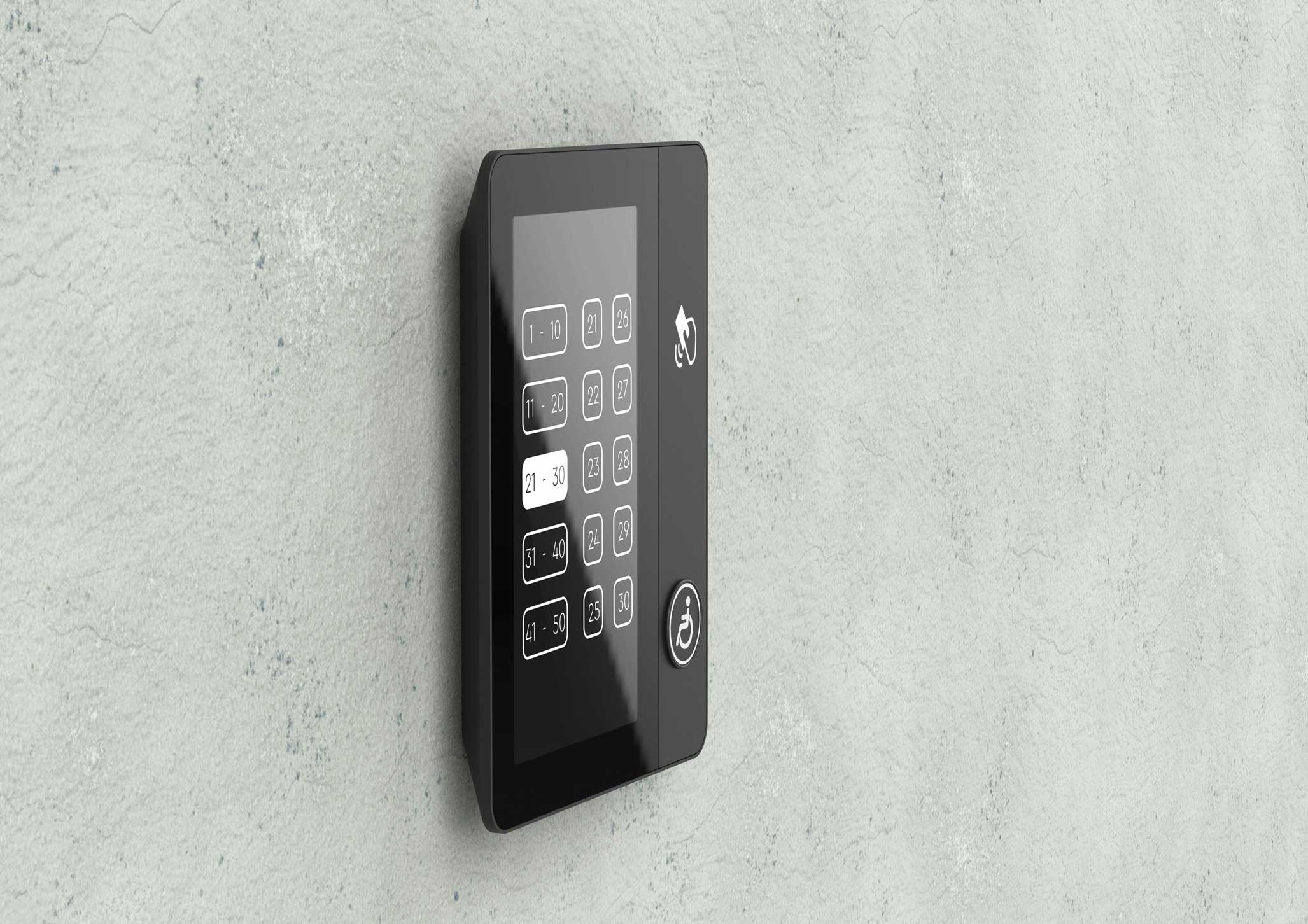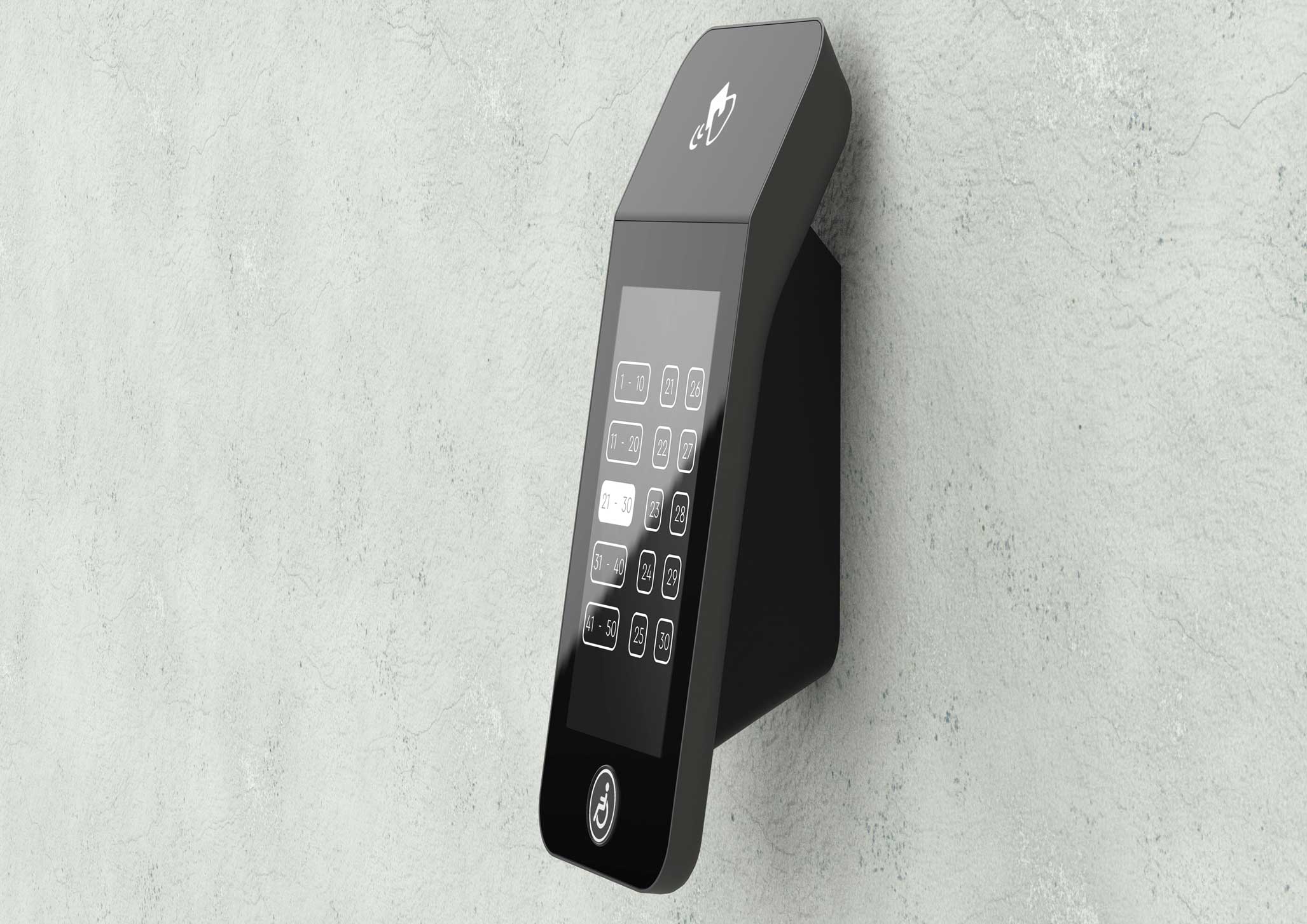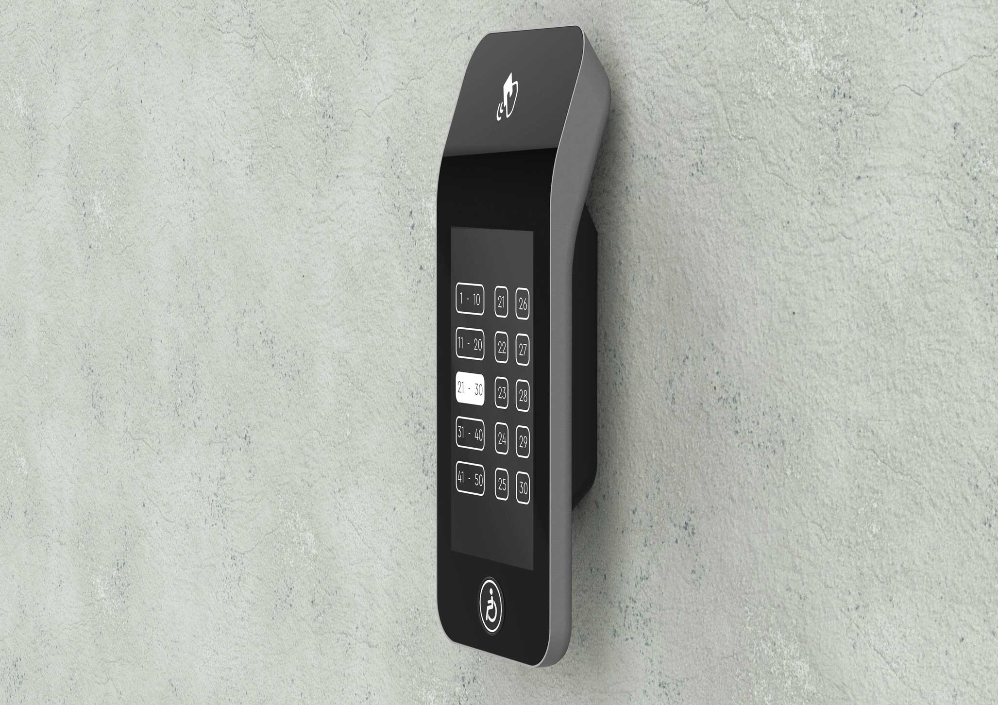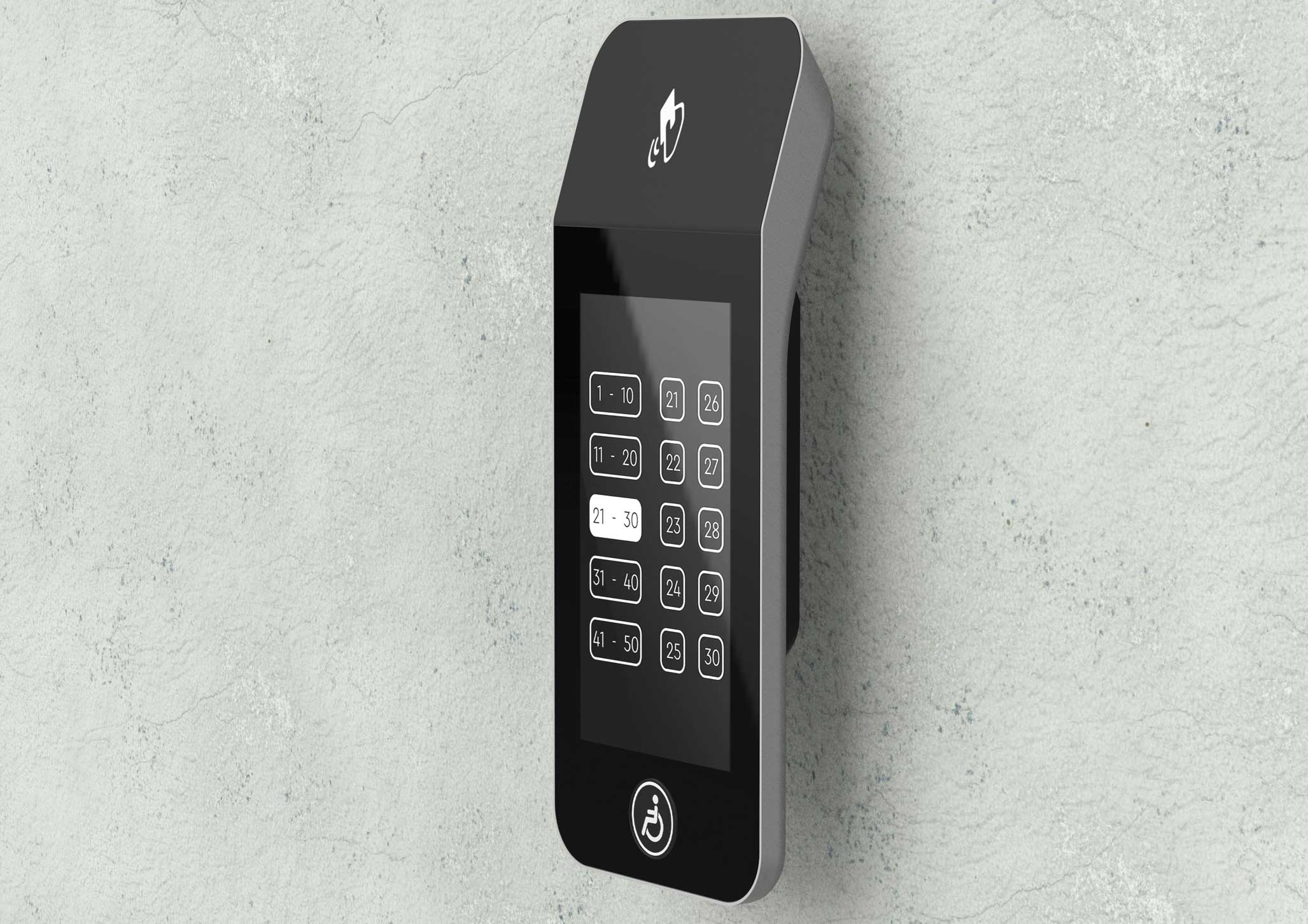 | Что нужно сделать? Задачи | 1. Терминал состоит из корпуса с отдельным кронштейном для крепления к стене (чтобы панель можно было снимать без разборки), сенсорного дисплея, платы управления, динамика для воспроизведения звука, считывателя СКУД и кнопки с пиктограммой «инвалид». 2. На лицевой панели есть отверстия для экрана; выхода звука динамиков, окно для считывателя СКУД. На боковой или нижней панели — слот SD-карты с доступом для обновления ПО. 3. Корпус должен собираться на винтах. Это нужно для легкого монтажа и дальнейшего обслуживания. 4. Универсальный дизайн, который сочетается с разной стилистикой отделки лифтовых холлов. Терминал должен одинаково хорошо смотреться и в премиум-апартаментах, и в обычном бизнес-центре. 5. Терминал нужно сделать удобным и для пользователей, и для монтажников. 6. Предпочтительны матовые текстуры и монохромная цветовая гамма, например, черный, серый и белый. Небольшие яркие вставки не возбраняются. 7. Есть особые требования по размерам и дизайну к кнопке для маломобильных групп населения |