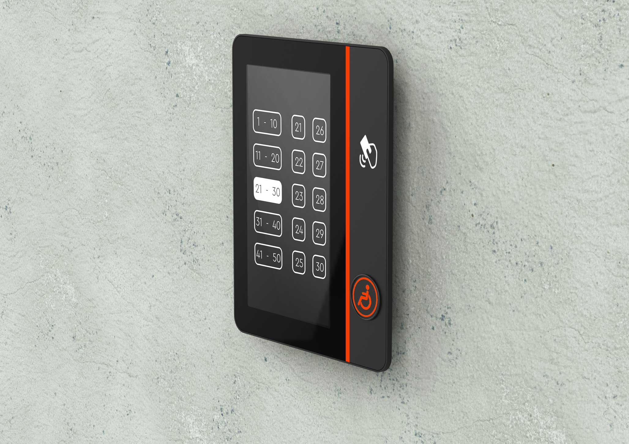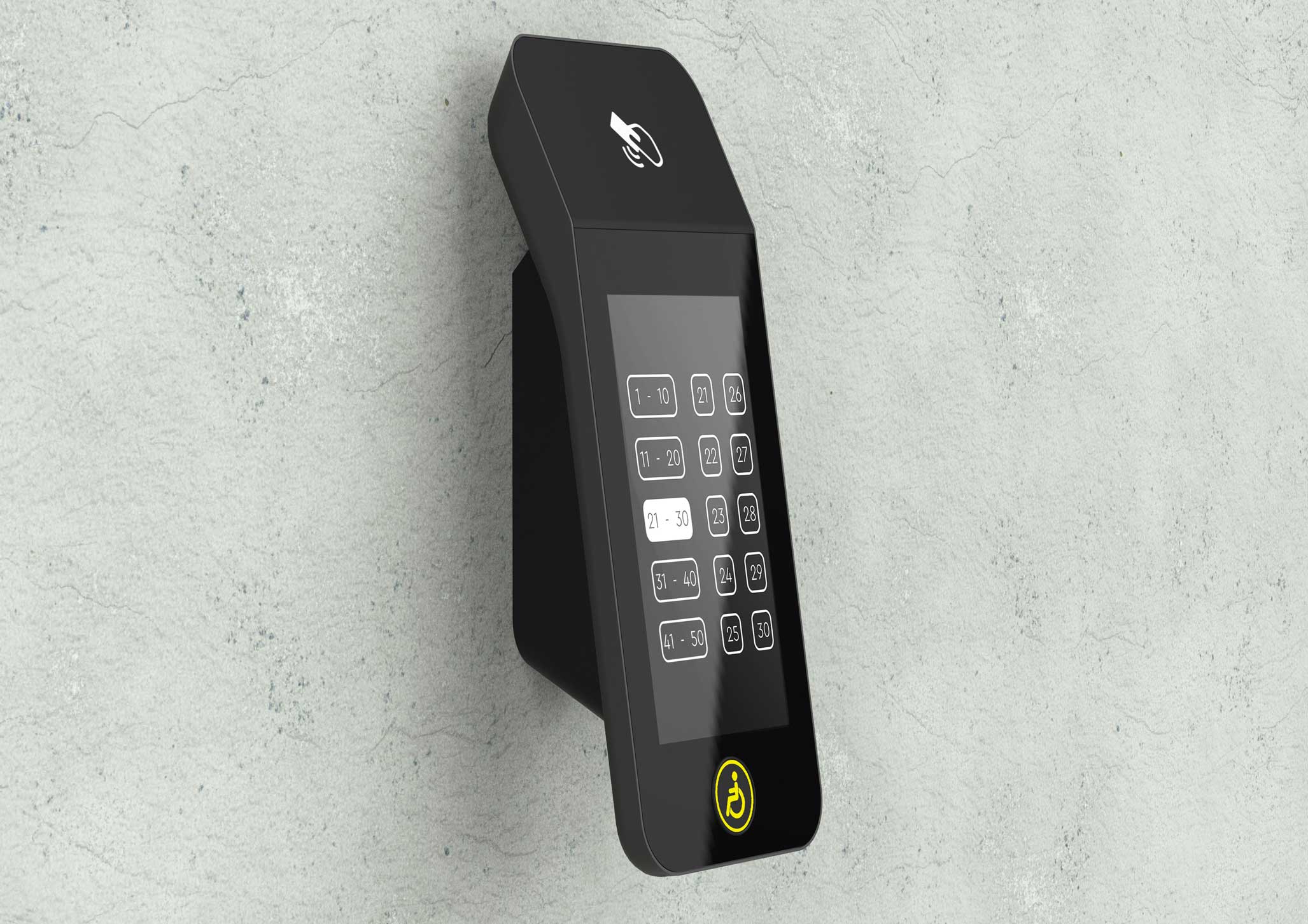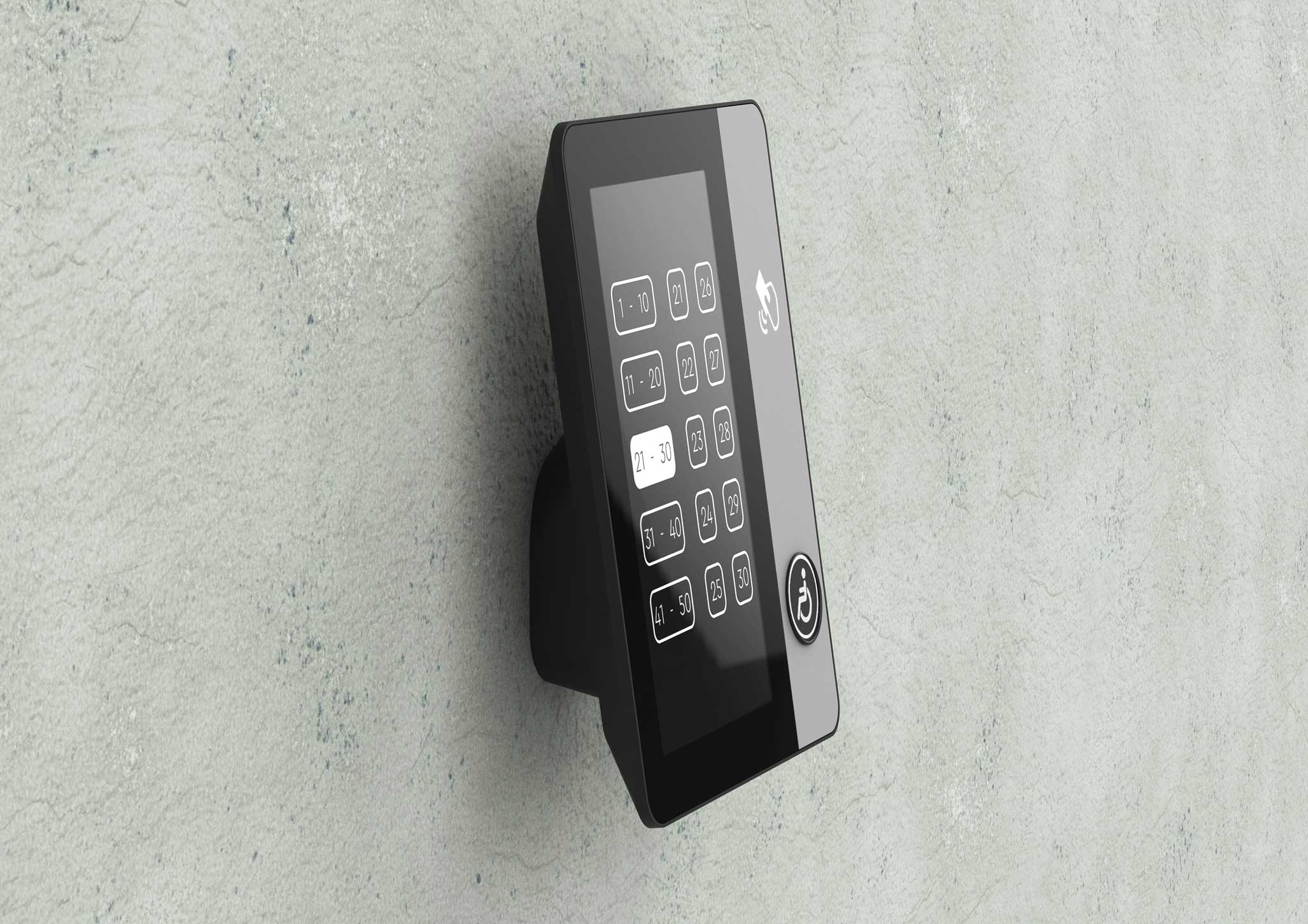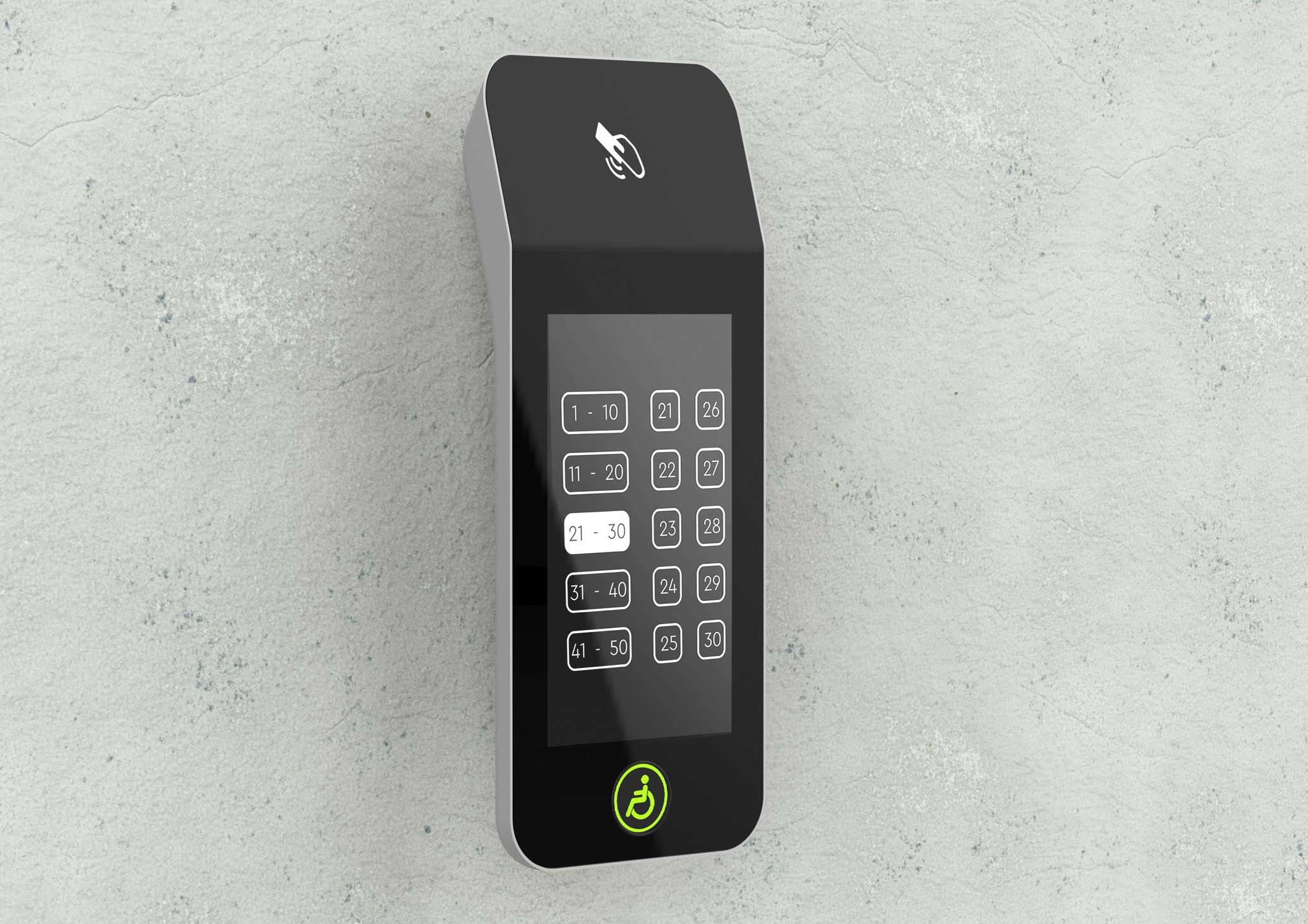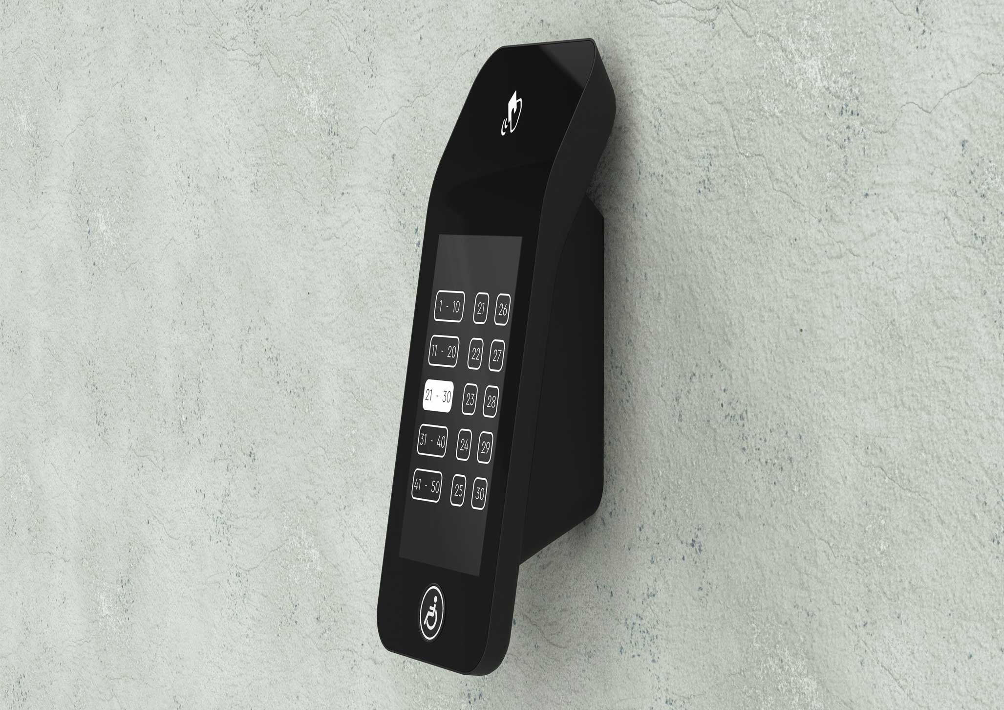 | Что нужно сделать? Задачи | 1. Терминал состоит из корпуса с отдельным кронштейном для крепления к стене (чтобы панель можно было снимать без разборки), сенсорного дисплея, платы управления, динамика для воспроизведения звука, считывателя СКУД и кнопки с пиктограммой «инвалид». 2. На лицевой панели есть отверстия для экрана; выхода звука динамиков, окно для считывателя СКУД. На боковой или нижней панели — слот SD-карты с доступом для обновления ПО. 3. Корпус должен собираться на винтах. Это нужно для легкого монтажа и дальнейшего обслуживания. 4. Универсальный дизайн, который сочетается с разной стилистикой отделки лифтовых холлов. Терминал должен одинаково хорошо смотреться и в премиум-апартаментах, и в обычном бизнес-центре. 5. Терминал нужно сделать удобным и для пользователей, и для монтажников. 6. Предпочтительны матовые текстуры и монохромная цветовая гамма, например, черный, серый и белый. Небольшие яркие вставки не возбраняются. 7. Есть особые требования по размерам и дизайну к кнопке для маломобильных групп населения |