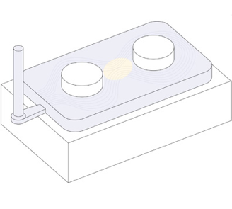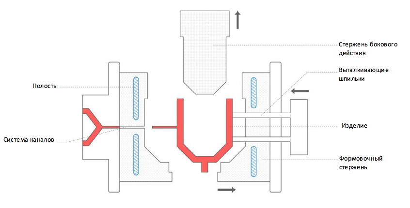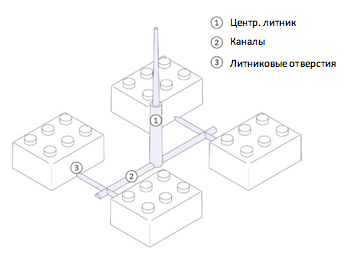 Расплавленный пластик поступает в форму через систему каналов. Система каналов, как правило, состоит из трёх основных частей: центральный литник (главный канал), каналы (направляющие каналы), литниковые отверстия (точки входа).