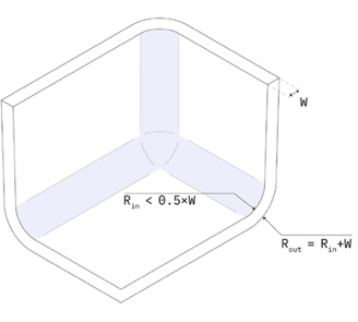 Правило постоянной толщины также применяется к углам изделия. Добавление буртика с максимально большим радиусом ко всем внутренним и внешним граням решает данный вопрос.