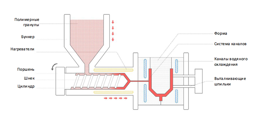 Литьё под давлением — это технология формовочного производства: для создания изделия пластик расплавляется и подаётся под давлением в полость формы. При охлаждении материал застывает и принимает геометрию формы. После этого изделие извлекается из формы и процесс начинается заново.