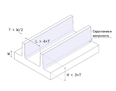При необходимости изготовления более толстых элементов рекомендуется делать их полыми и использовать рёбра жёсткости. Имейте в виду, что каждые 10% увеличения толщины стенок ведут к росту жёсткости примерно на 30%.