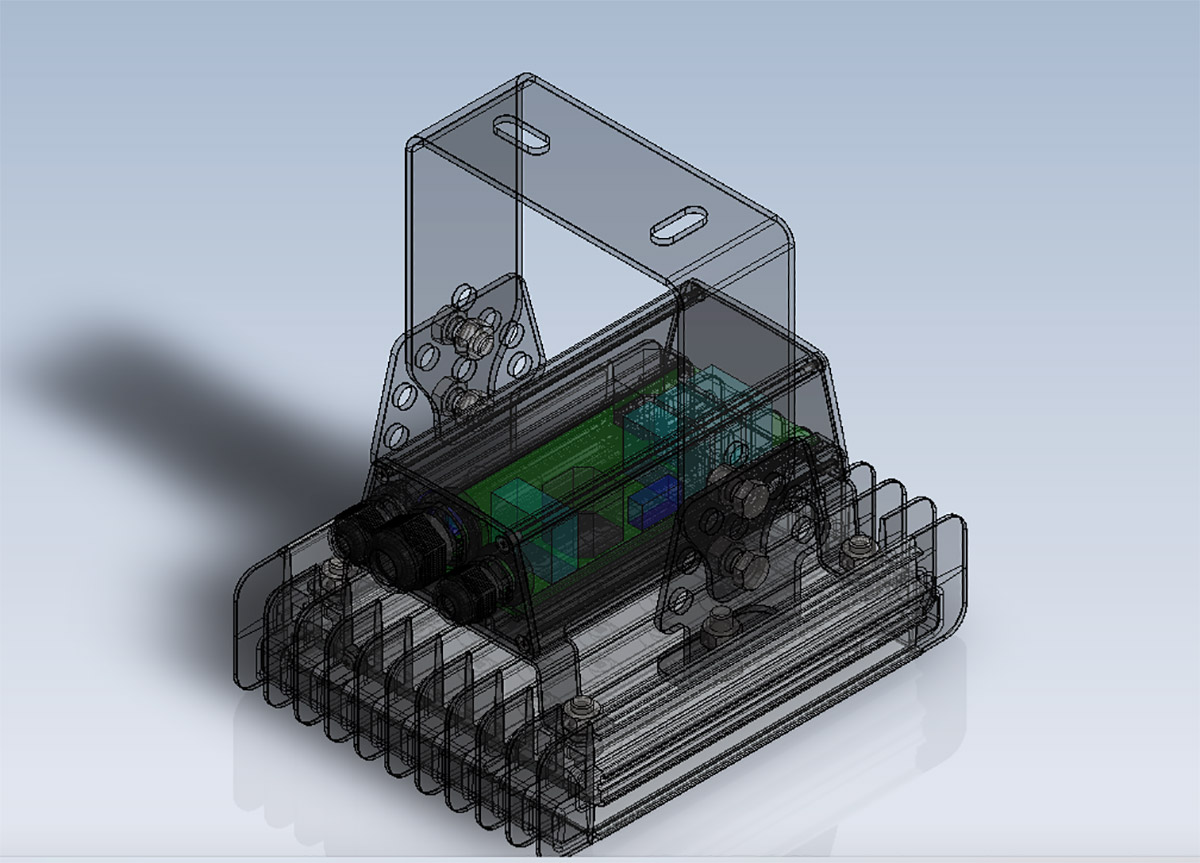 После борьбы за хорошую теплоотдачу, надёжные и удобные пазы для креплений, размещение гермовводов и прочее получается вот такая модель (заодно попросили добавить и скобу для крепления):