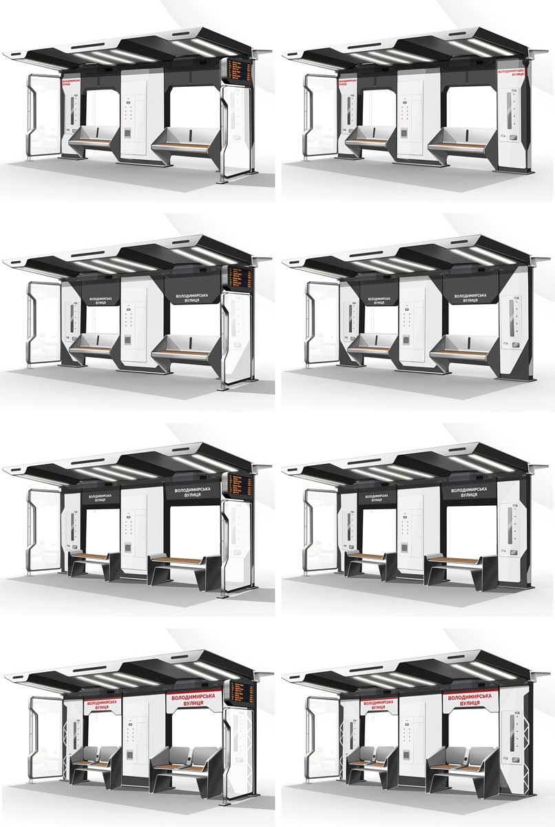Каркас остановки — из нержавеющей стали. В оформлении почти никаких ограничений — можно использовать и стекло, и дерево, и окрашенные поверхности. Требования к дизайну — урбанистический стиль, но в то же время остановка не должна выглядеть инородным элементом в исторических центрах города. Черновики: