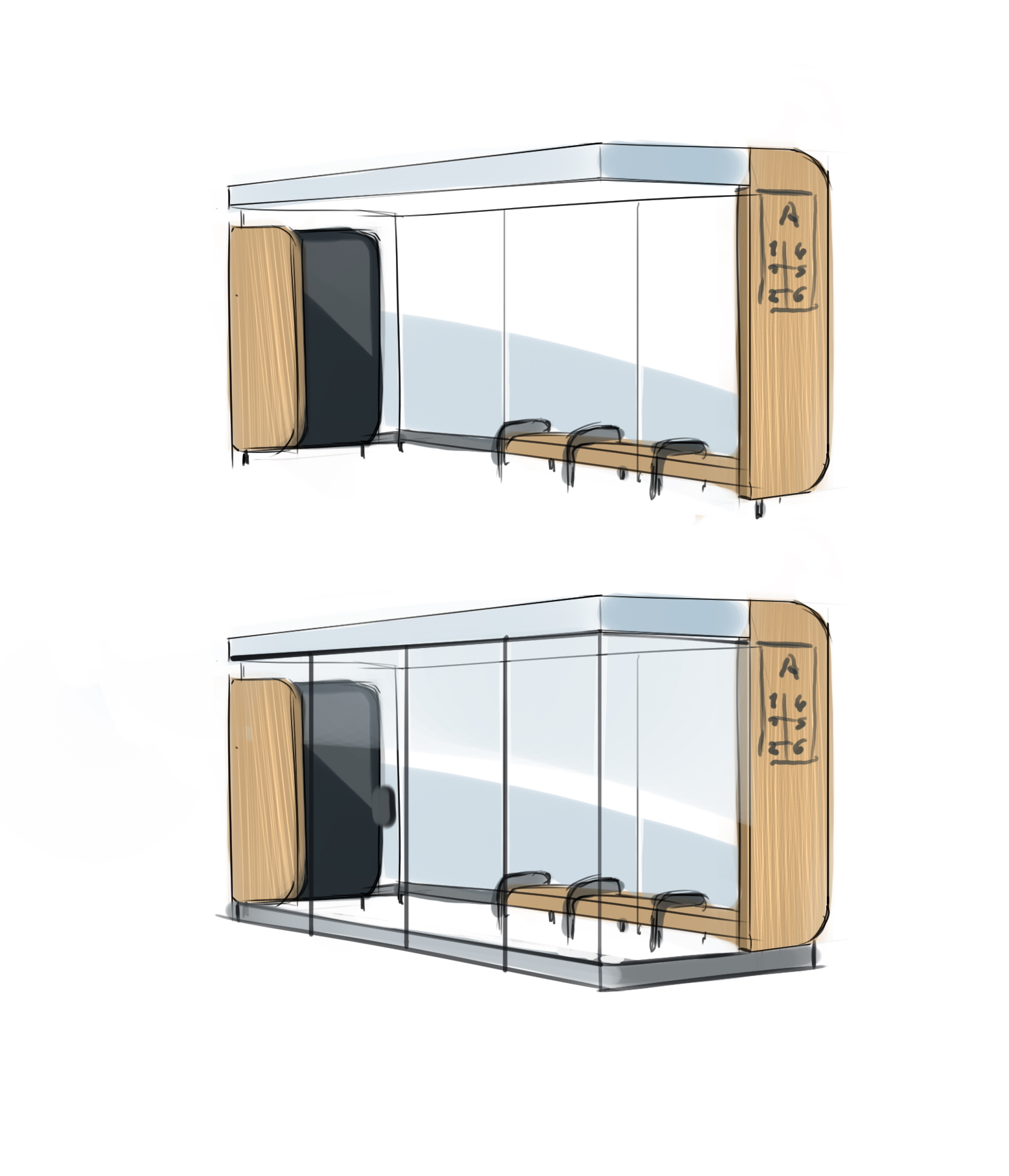 Будем разрабатывать две версии: с отапливаемой секцией и без нее. Но и помимо этого необходимо учесть, что павильон будет устанавливаться в разных регионах, а везде погодные условия свои, поэтому как-то нужно предусмотреть возможное изменение конструкции в зависимости от ветрозащиты, например. Обязательны система водостока, возможность очистки кровли, техотсеки для электрооборудования, всяческих терминалов и пунктов зарядки.