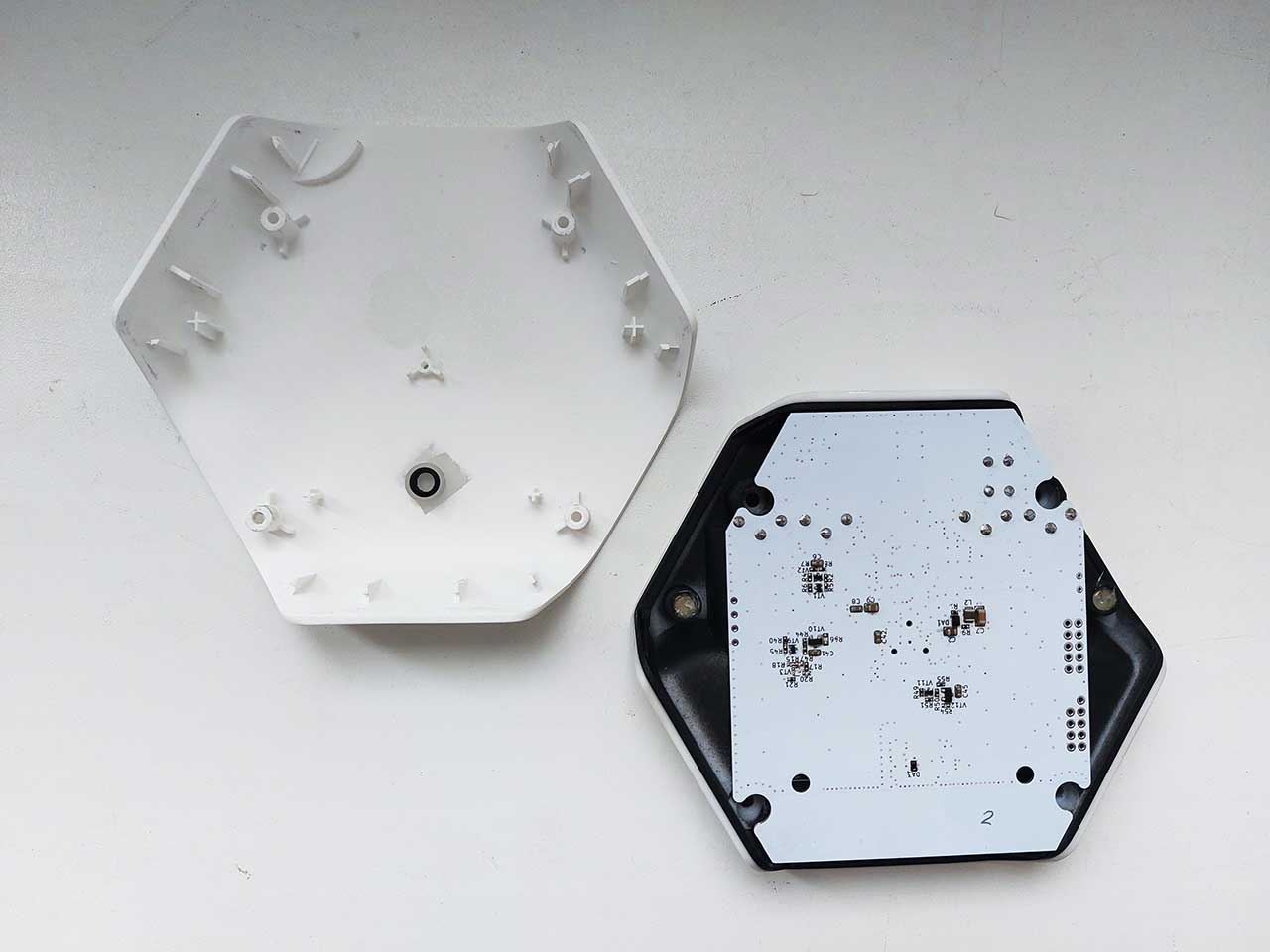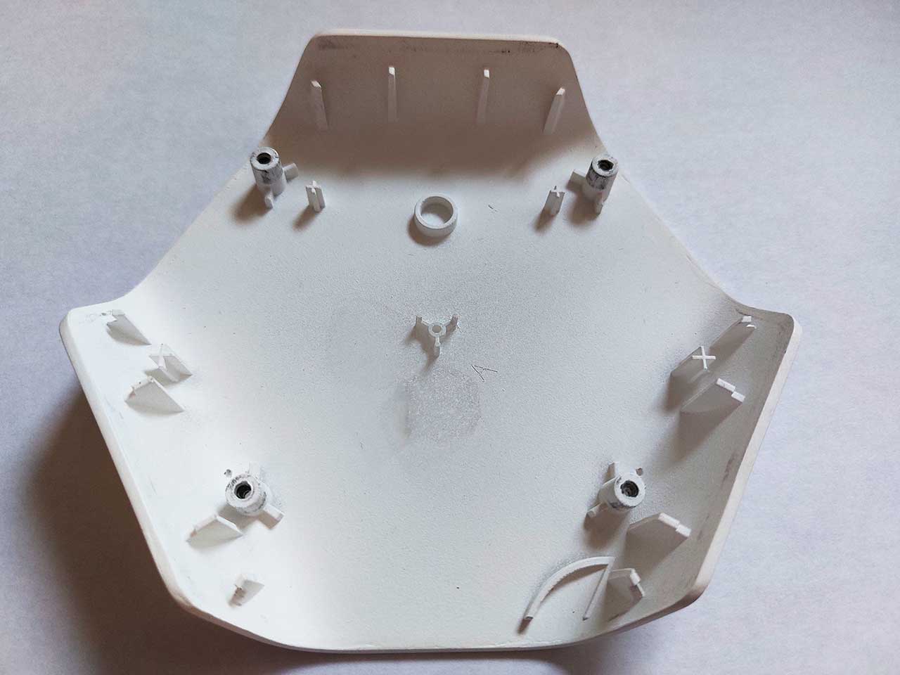 | Что нужно сделать? Задачи | 1. Состав корпуса: лицевая крышка и две задние стенки (внутренняя и стенка-основание для крепления к стене). 2. От отдельного отсека для элементов питания отказались (сильно увеличится толщина корпуса). Но доступ к расположенным на плате батарейкам у пользователя все равно должен быть. А вот к остальной начинке — ни в коем случае. 3. На задней стенке нужно предусмотреть разные варианты крепления: проушина/ на прорез, петельки, скотч двухсторонний/велкро. 4. Передняя стенка для устройства с датчиками шума и света играет роль отражателя, рассеиватель выполняется из пластика молочного оттенка, — нужно подобрать материал. 5. В корпусе должна быть перфорация. Чем больше, тем лучше: воздуху нужно свободно проходить через всё устройство. Однако перфорацию придется как-то закамуфлировать или вообще скрыть от пользователя. 6. Хитрая маркировка, незаметная снаружи. Дело в том, что в «изначальной» версии датчика наклейка часто оказывалась мокрой (даже несмотря на то, что в руководстве по эксплуатации устройства не рекомендовалось использовать его в условиях повышенной влажности). Поэтому сейчас ее придется прятать подальше. 7. Нужна ненавязчивая индикация — индикатор будет светиться только при первичной настройке датчика. 8. Разумеется, требуется кнопка включения/выключения. 9. Предстоит определить, как будет реализован батарейный отсек на 4 щелочных батарейки. 10. В составе прибора — антенна и разнообразные датчики. Для каждого элемента есть свои требования и ограничения по размещению. 11. Сборка — на многоразовых защелках (спойлер: в процессе разработки все немного изменилось). 12. Можно немного увеличить корпус. Но — в рамках дизайна, и чем меньше будут его габариты, тем лучше |