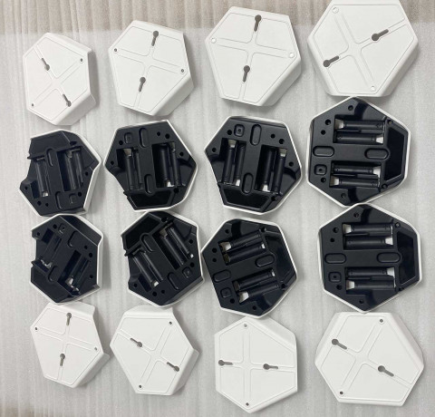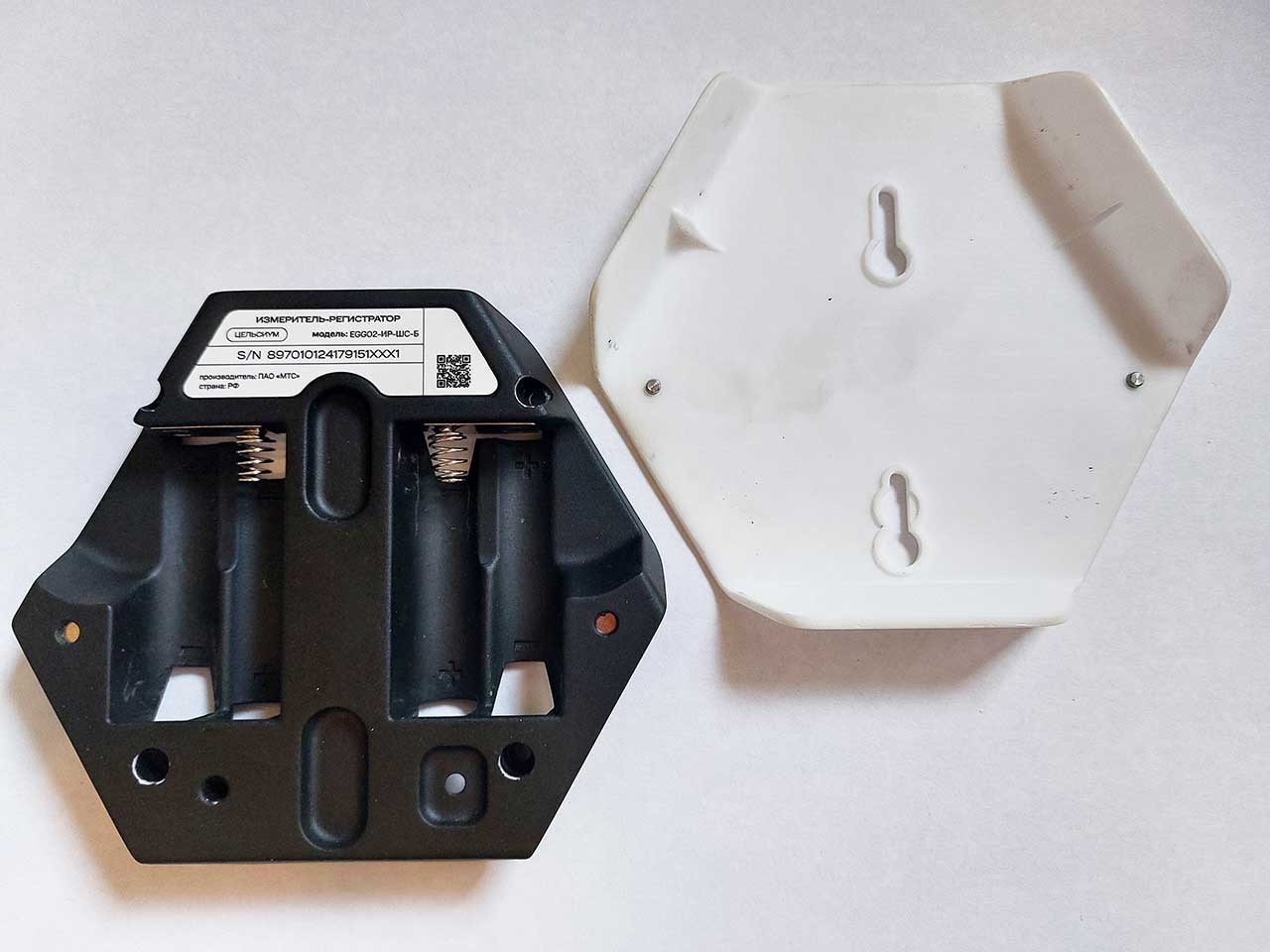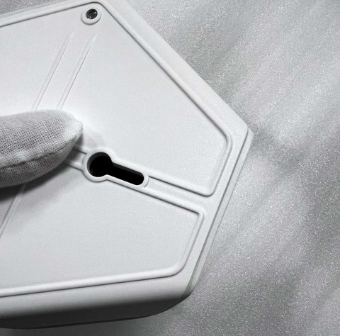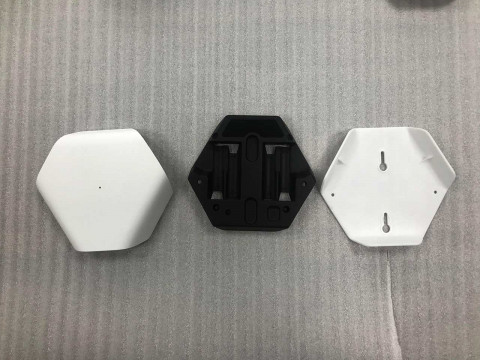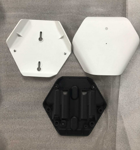 | Решения и объем работ | 1. Разработали два варианта конструкции. 2. Работали в связке с разработчиками платы (точнее, двух плат — для двух устройств). 3. Сделали прототип и организовали производство предсерийных образцов и установочной партии. 4. Как итог: выполнили все требования, придумали, как изолировать батарейный отсек от электронных компонентов, нашли хорошее место для наклейки, реализовали магнитное крепление основного корпуса датчика к стене. Оценили серийное производство с тиражом в несколько тысяч штук — уже по другой технологии. |