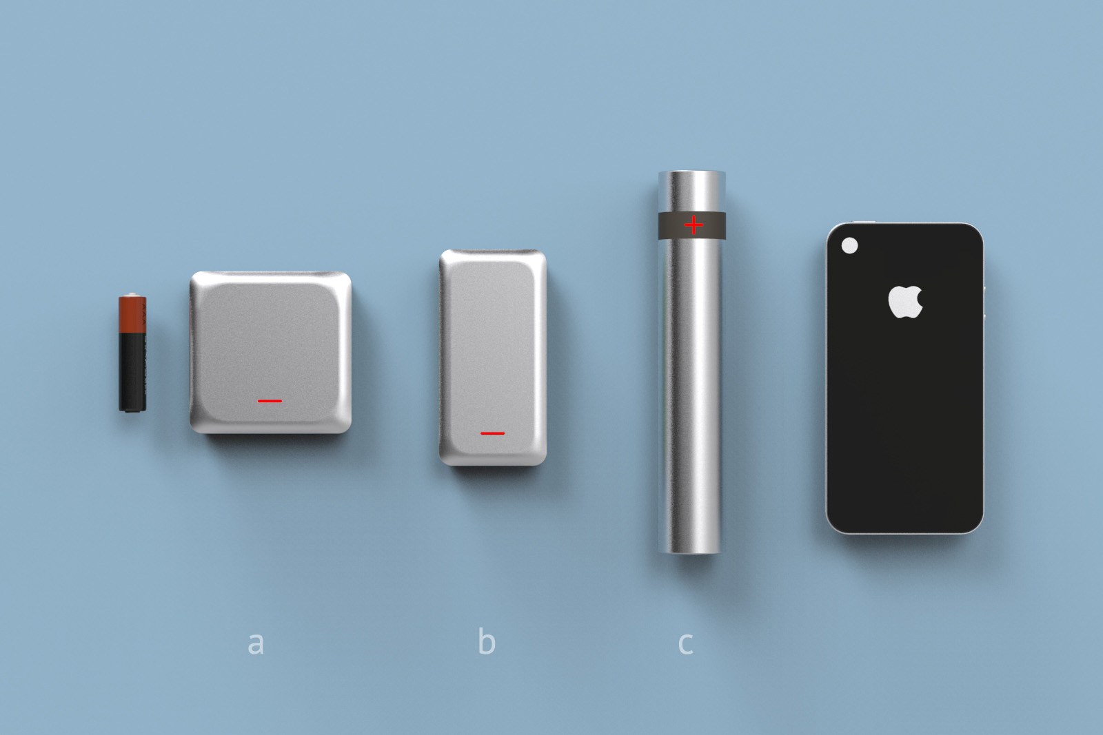 Варианты дизайна корпуса коннектора. Он небольшой — это видно в сравнении с iPhone и батарейкой.