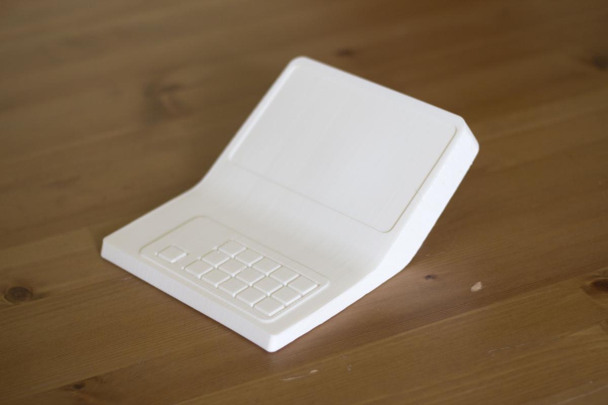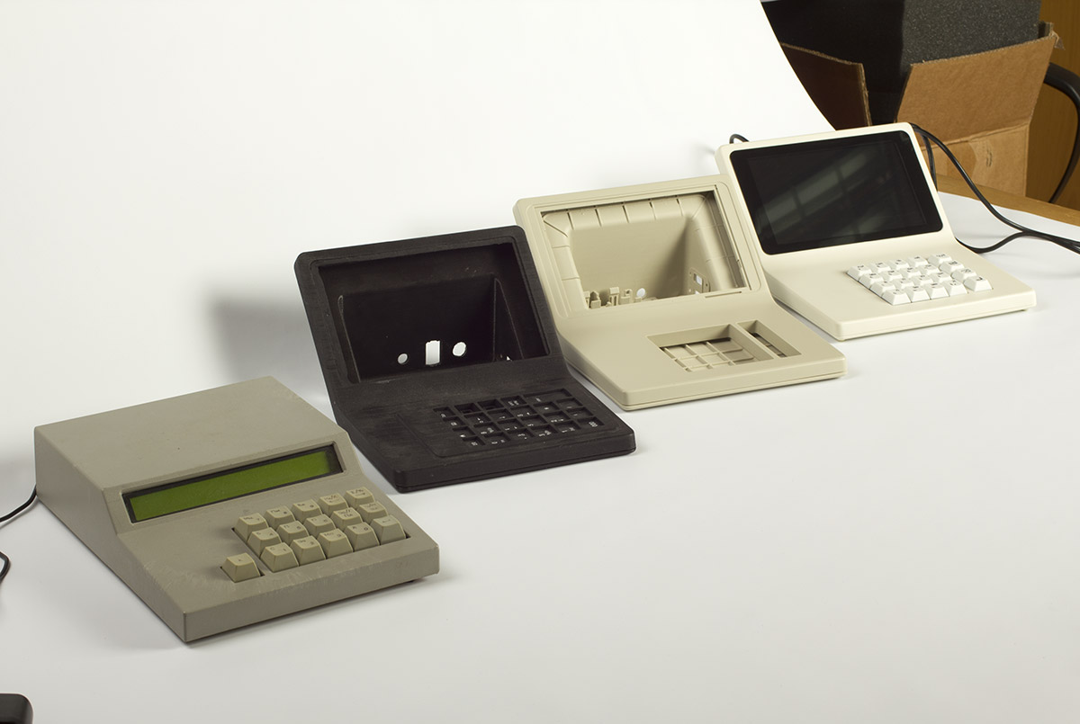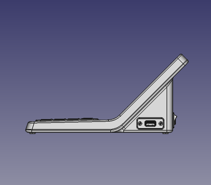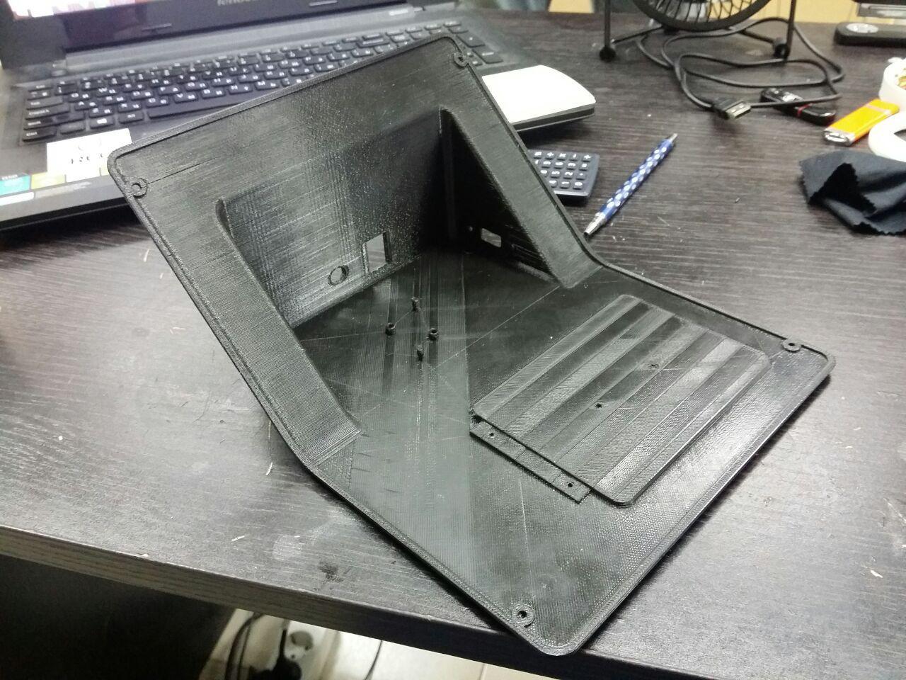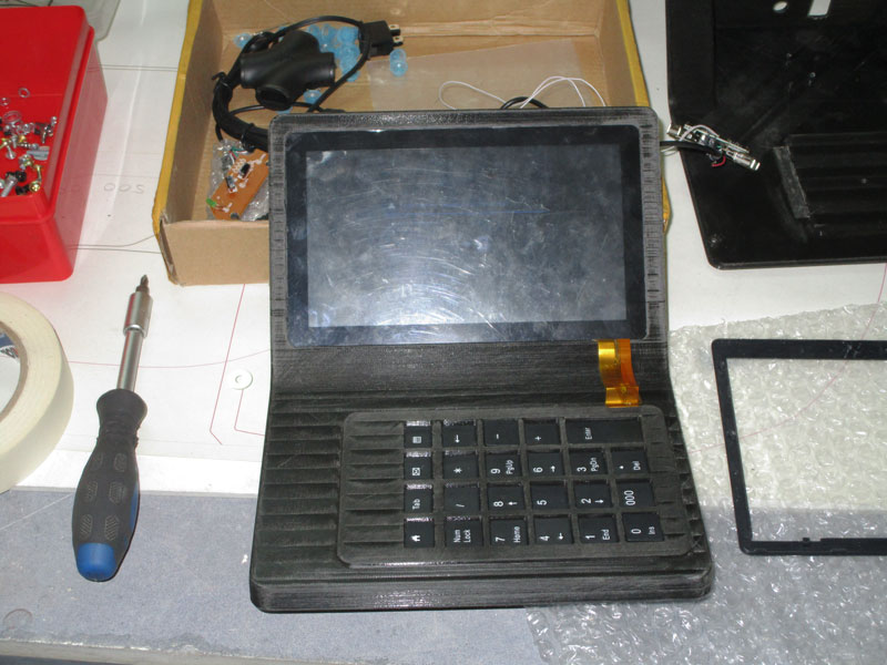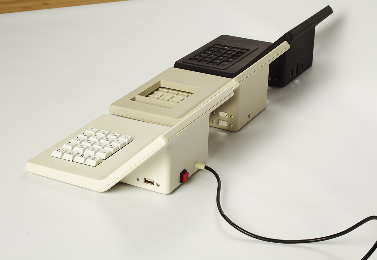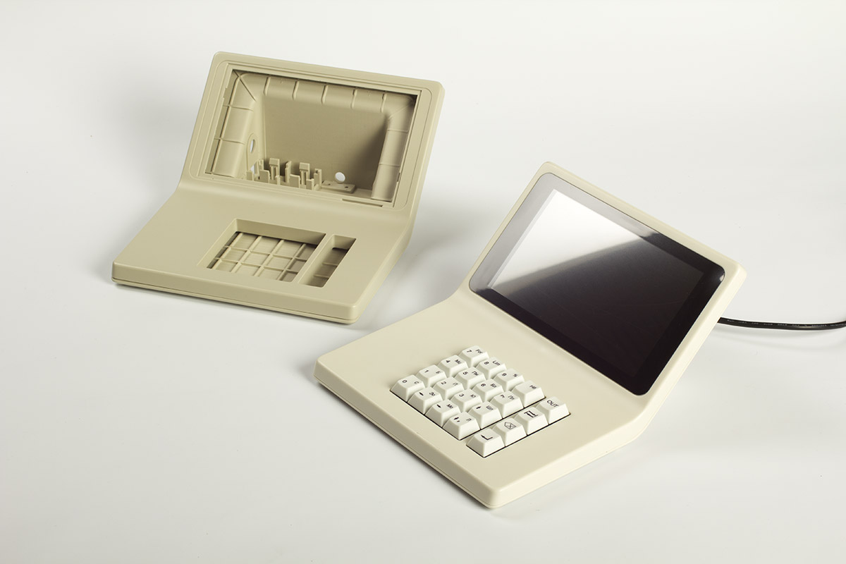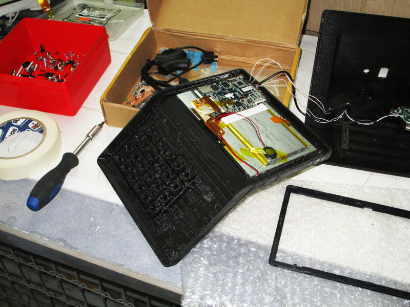 В новый корпус вместо дисплея ставится готовый планшет с диагональю дисплея 7 дюймов. Плюс модули Wi-Fi и USB, динамик, клавиатура (её нам нужно разработать или предложить готовое решение), плата. К ним — готовый блок питания. Корпус состоит из двух половинок, верхней и нижней. Желательно (насколько возможно) сохранить эргономику старой версии, — по крайней мере, высоту клавиатуры.