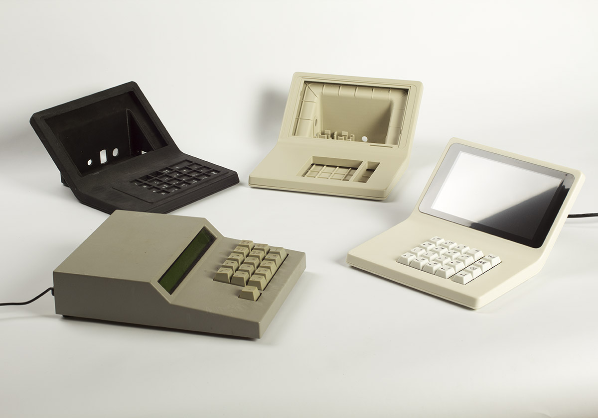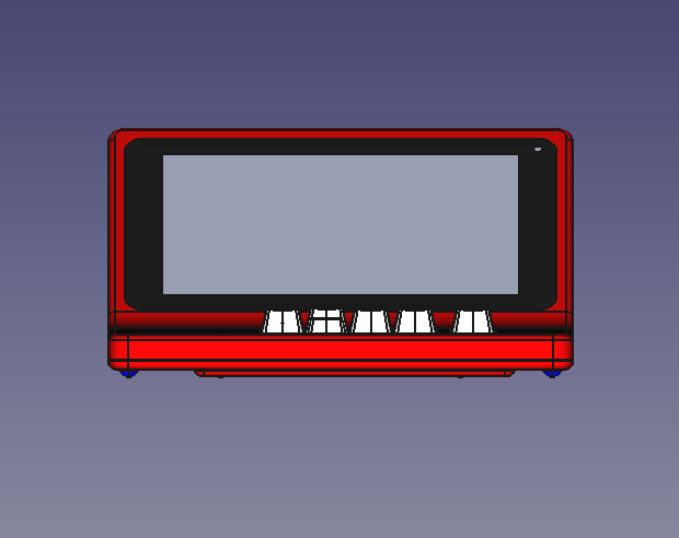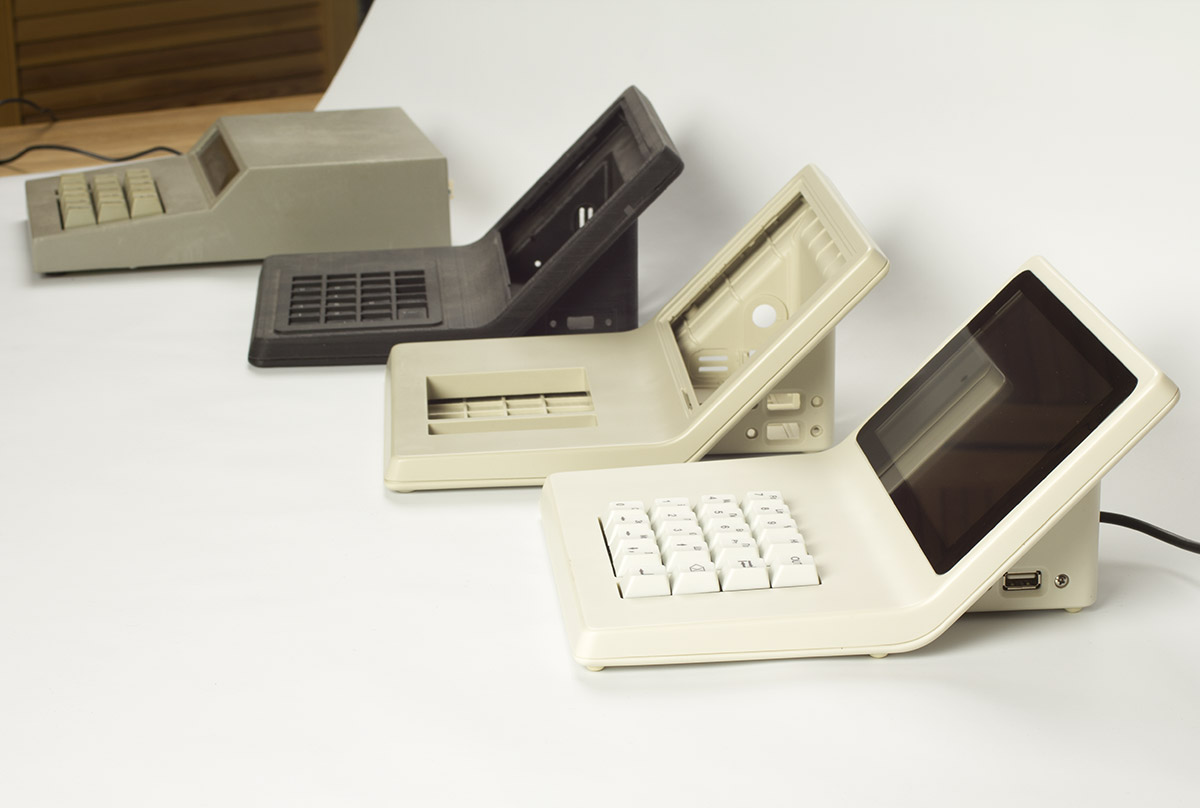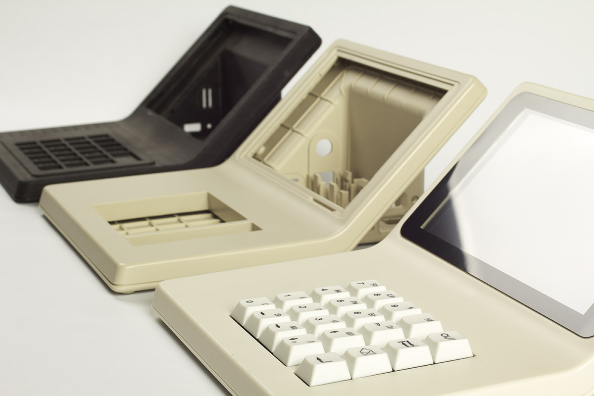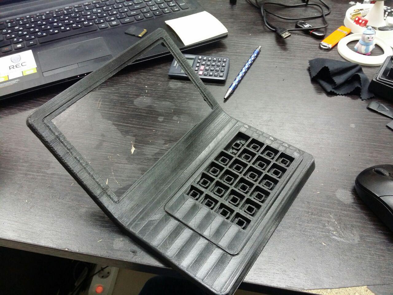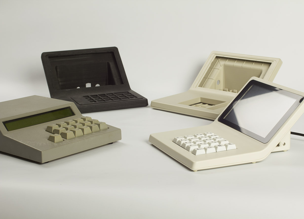 В новый корпус вместо дисплея ставится готовый планшет с диагональю дисплея 7 дюймов. Плюс модули Wi-Fi и USB, динамик, клавиатура (её нам нужно разработать или предложить готовое решение), плата. К ним — готовый блок питания. Корпус состоит из двух половинок, верхней и нижней. Желательно (насколько возможно) сохранить эргономику старой версии, — по крайней мере, высоту клавиатуры.