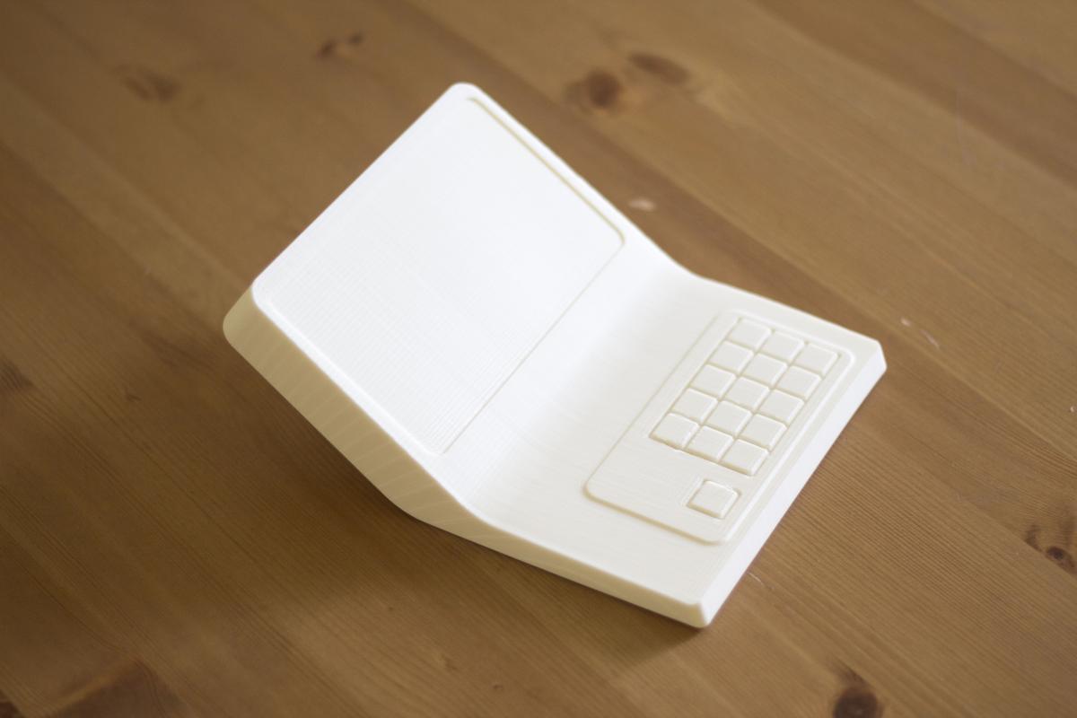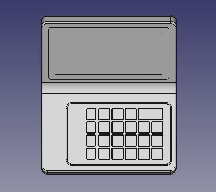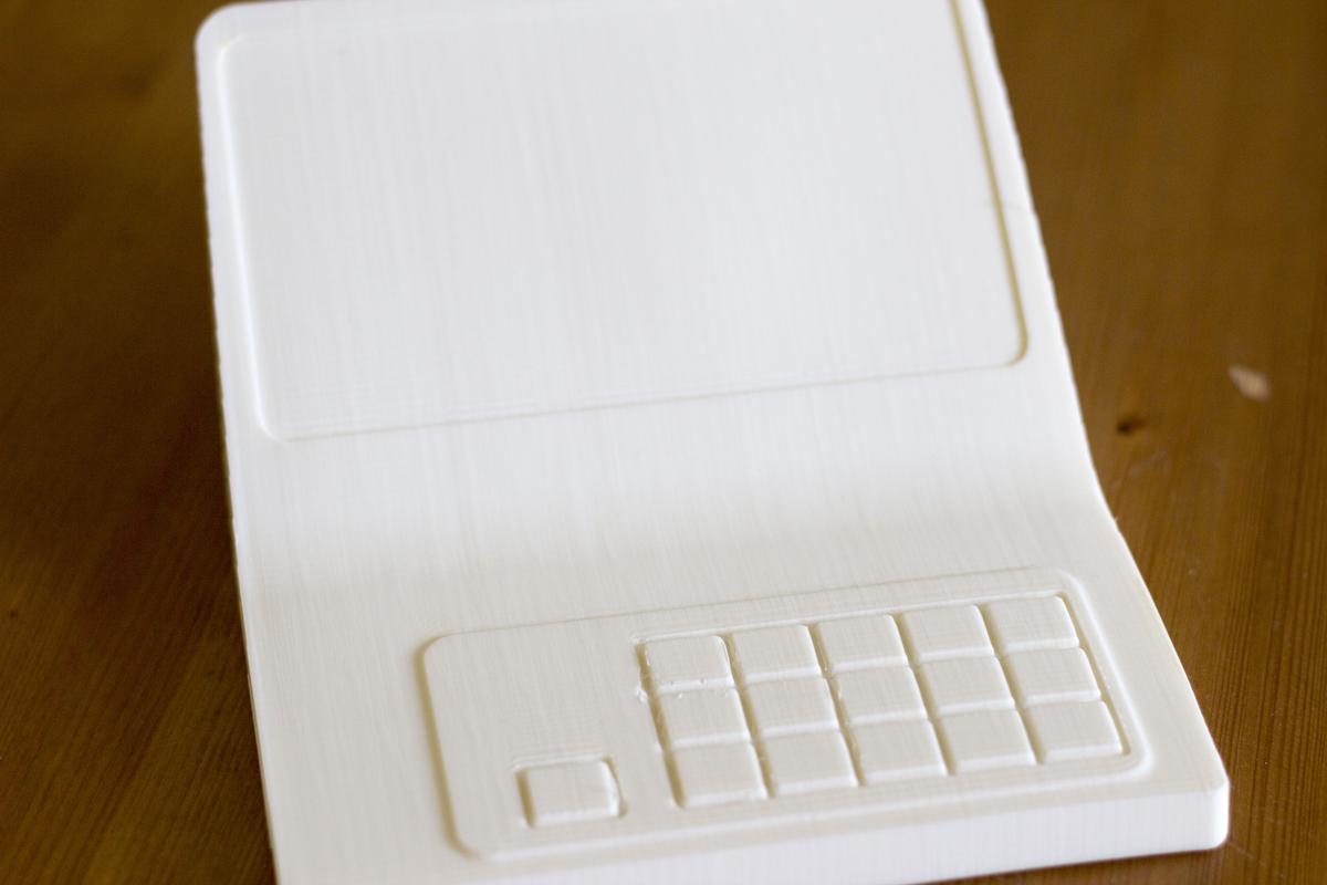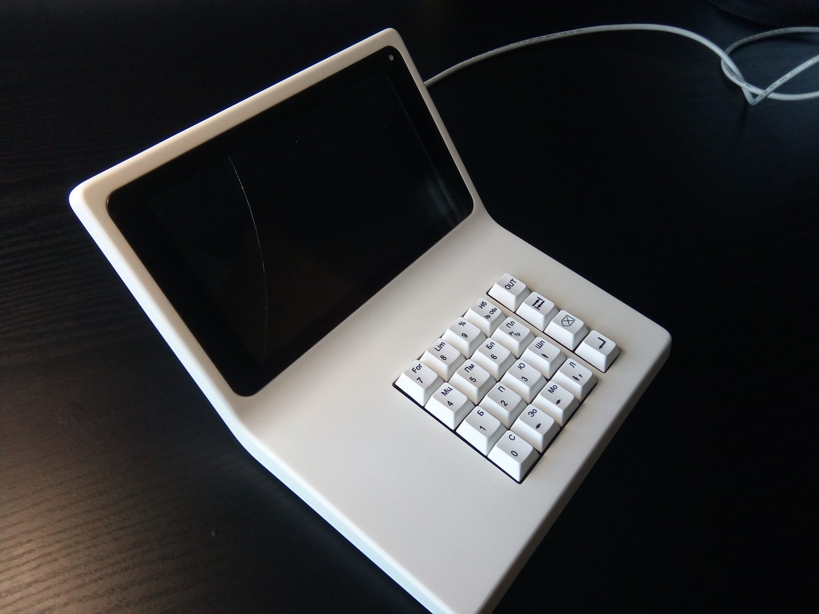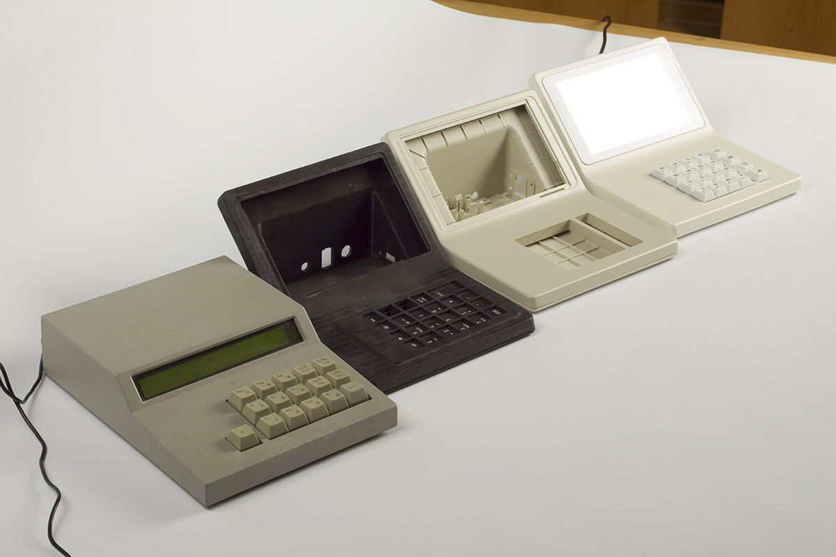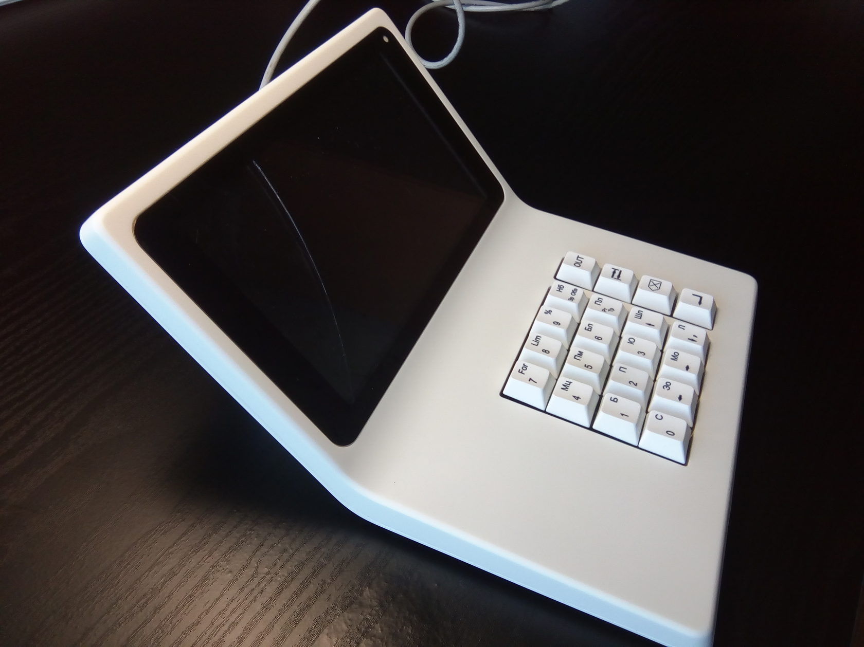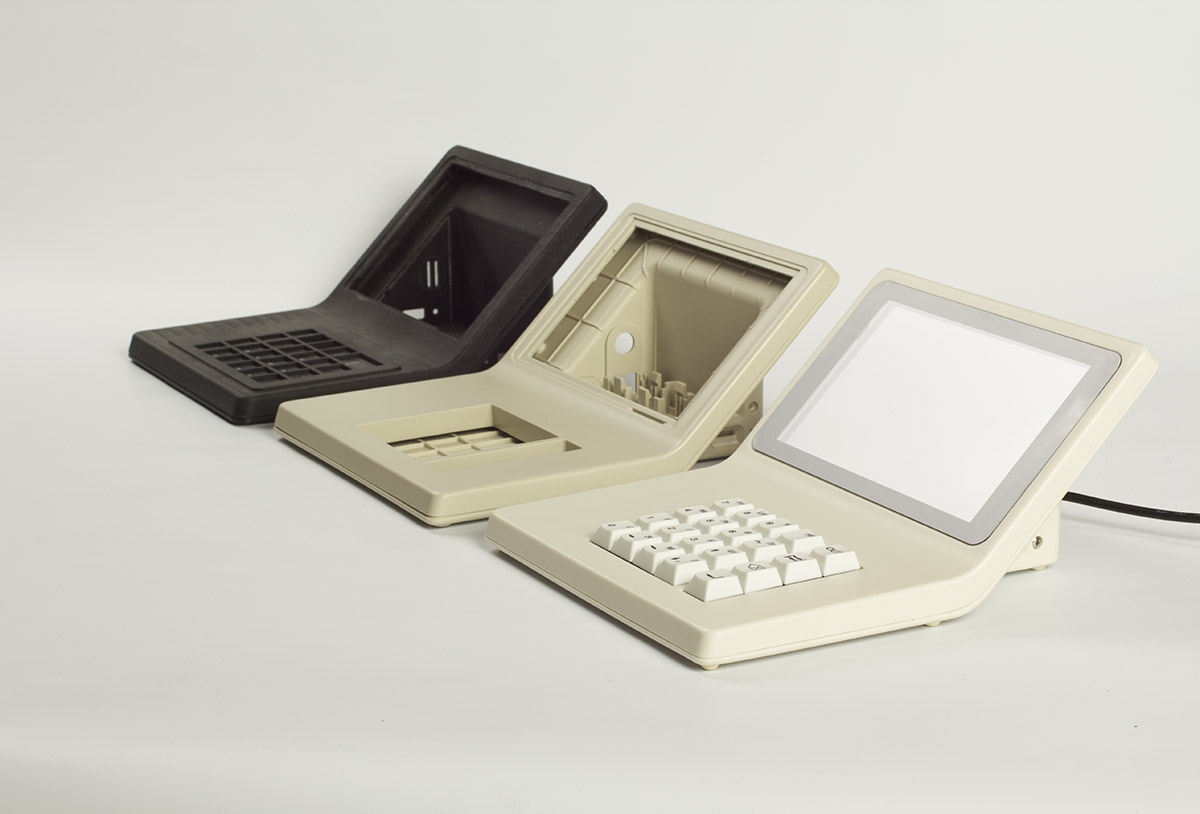 В новый корпус вместо дисплея ставится готовый планшет с диагональю дисплея 7 дюймов. Плюс модули Wi-Fi и USB, динамик, клавиатура (её нам нужно разработать или предложить готовое решение), плата. К ним — готовый блок питания. Корпус состоит из двух половинок, верхней и нижней. Желательно (насколько возможно) сохранить эргономику старой версии, — по крайней мере, высоту клавиатуры.