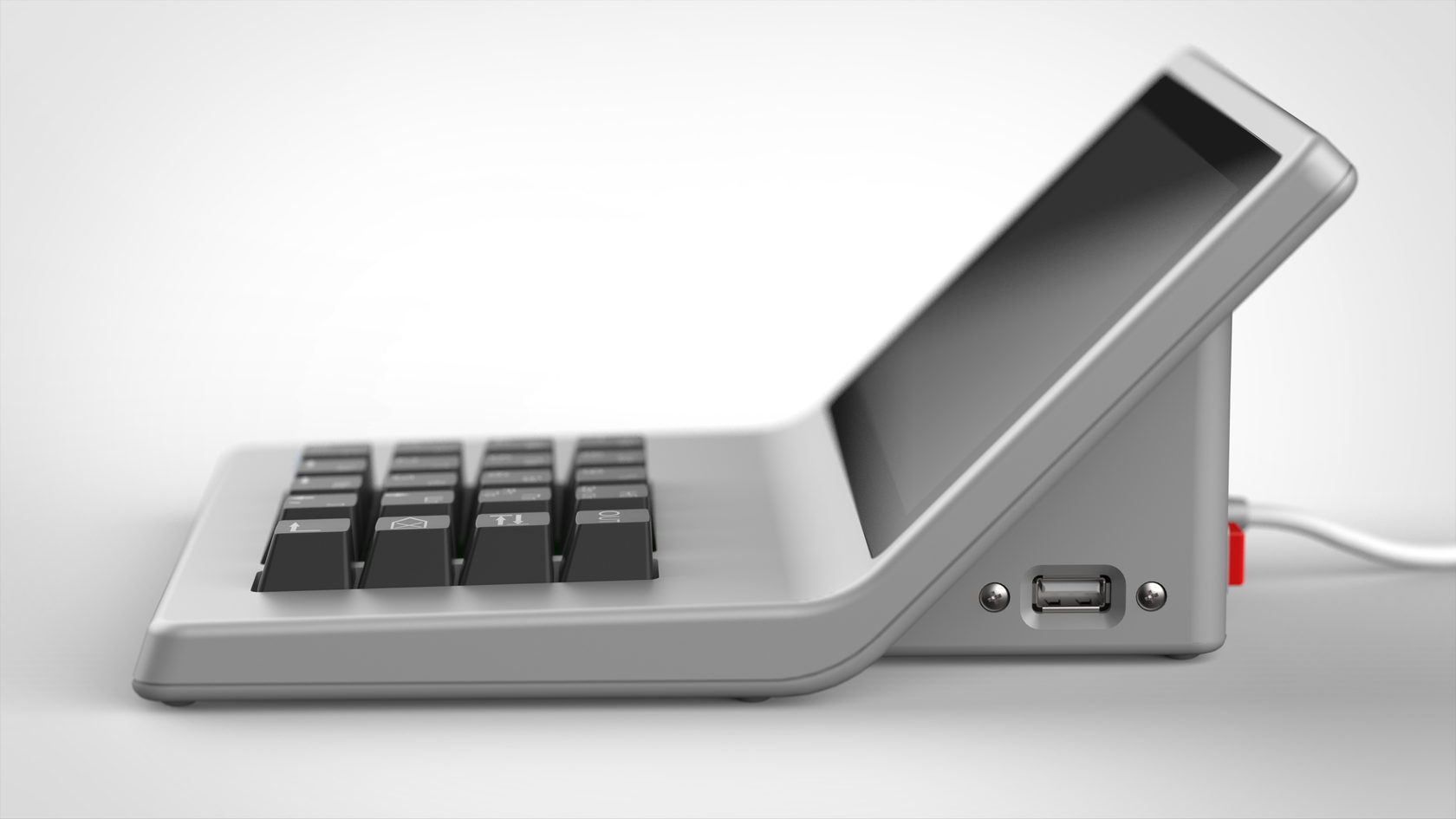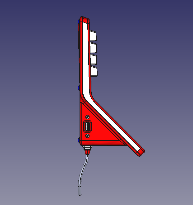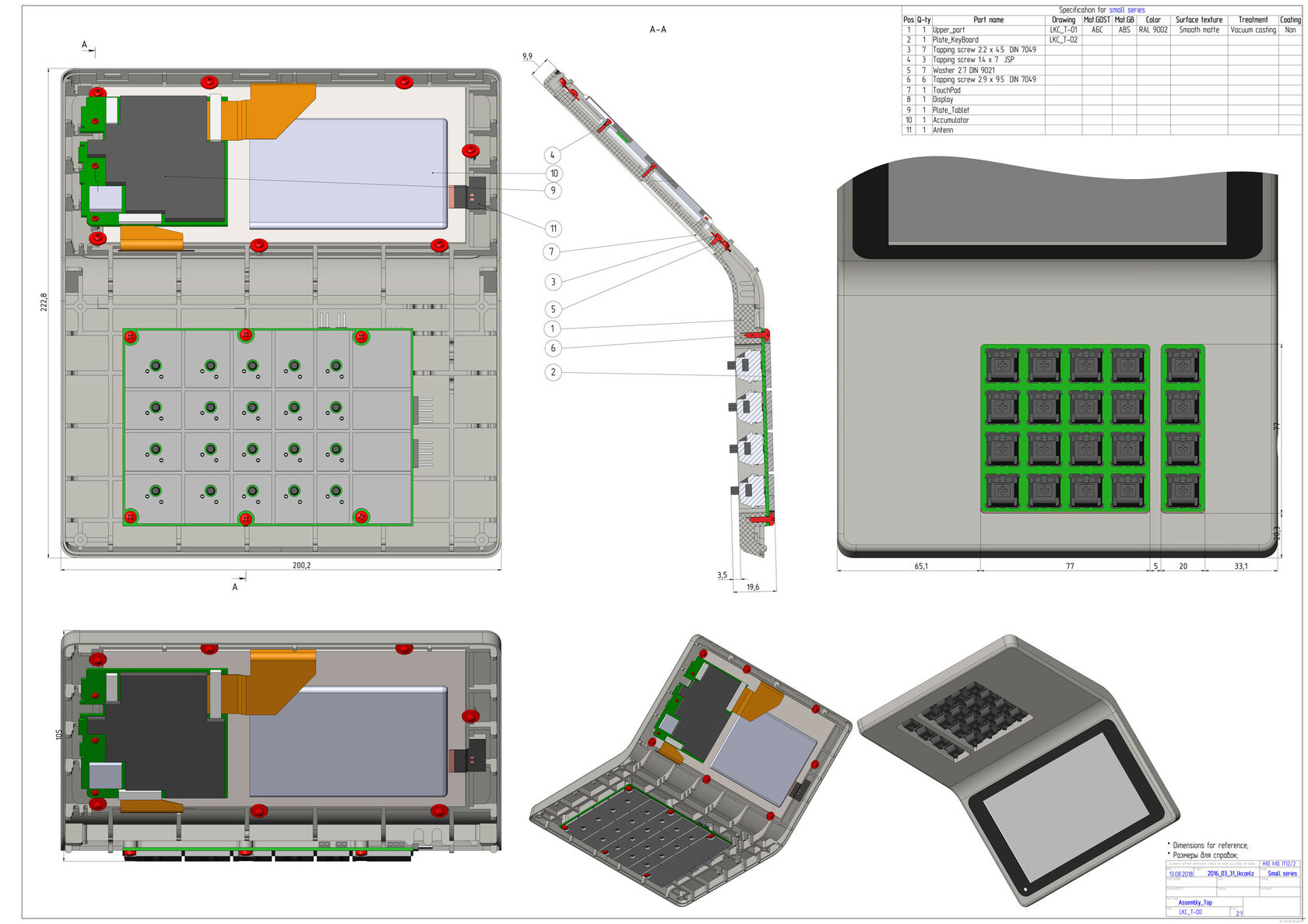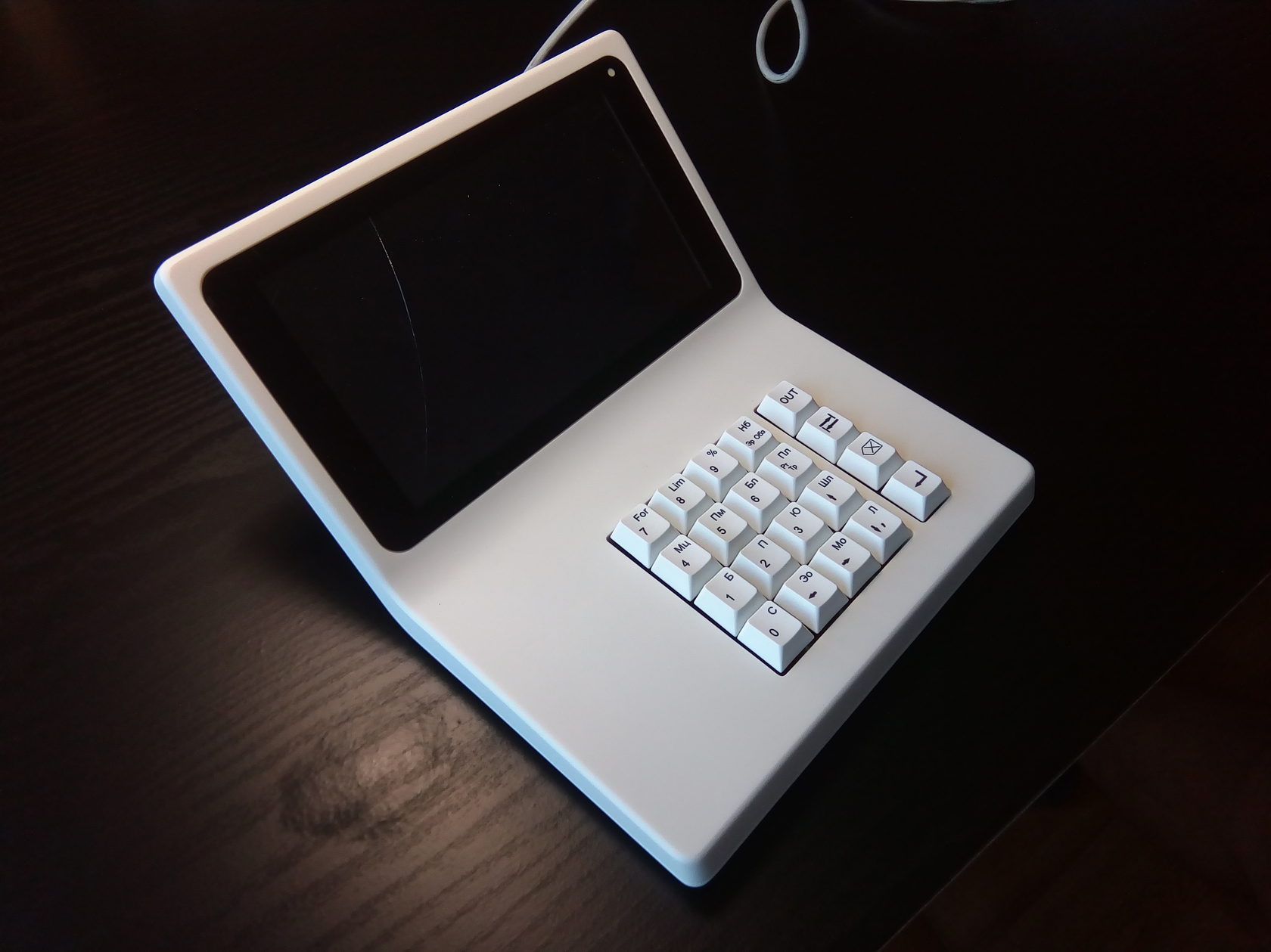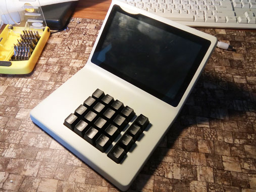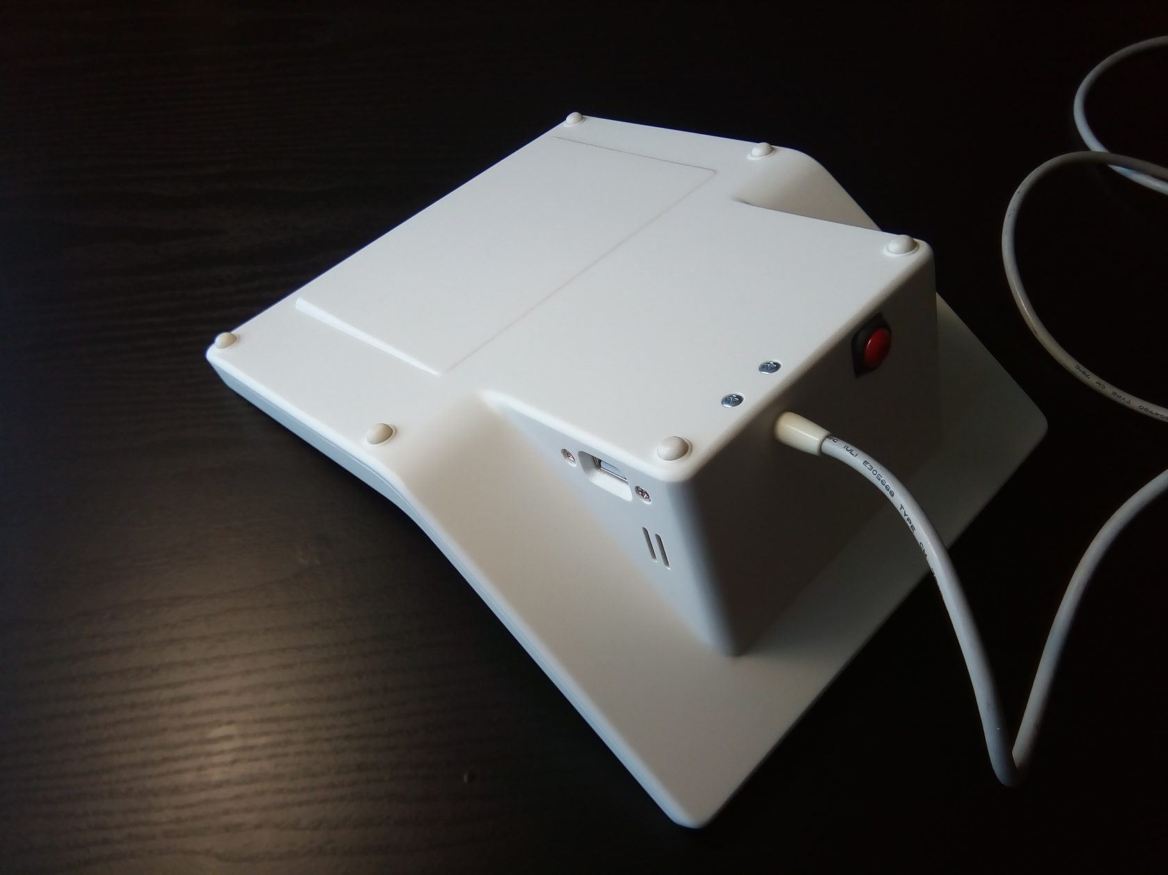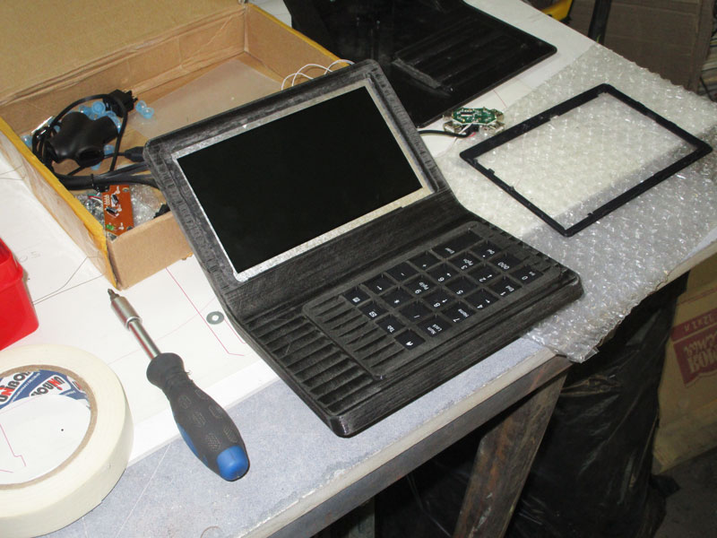 В новый корпус вместо дисплея ставится готовый планшет с диагональю дисплея 7 дюймов. Плюс модули Wi-Fi и USB, динамик, клавиатура (её нам нужно разработать или предложить готовое решение), плата. К ним — готовый блок питания. Корпус состоит из двух половинок, верхней и нижней. Желательно (насколько возможно) сохранить эргономику старой версии, — по крайней мере, высоту клавиатуры.