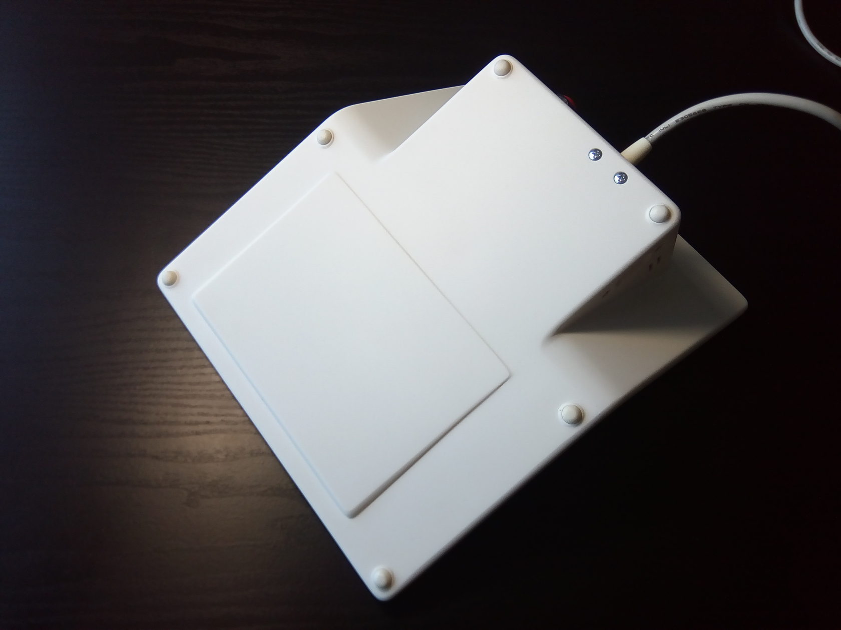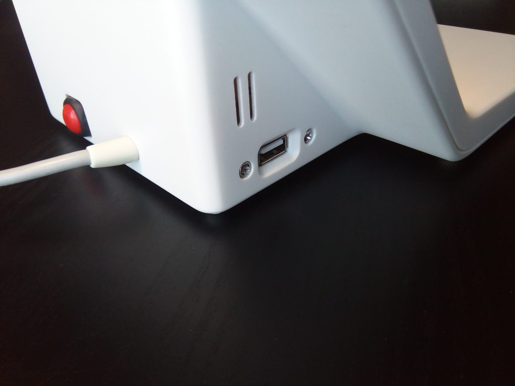 Ещё: один из двух USB-выходов почему-то работал как надо, а второй — нет; пришлось зафиксировать кабель питания и хорошо подумать насчёт цвета и фактуры корпуса. А для того, чтобы устройство крепко держалось на поверхности и не ездило во время работы туда-сюда, ему точно нужны были резиновые ножки.