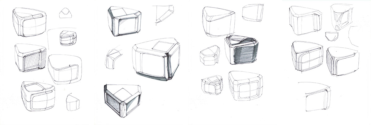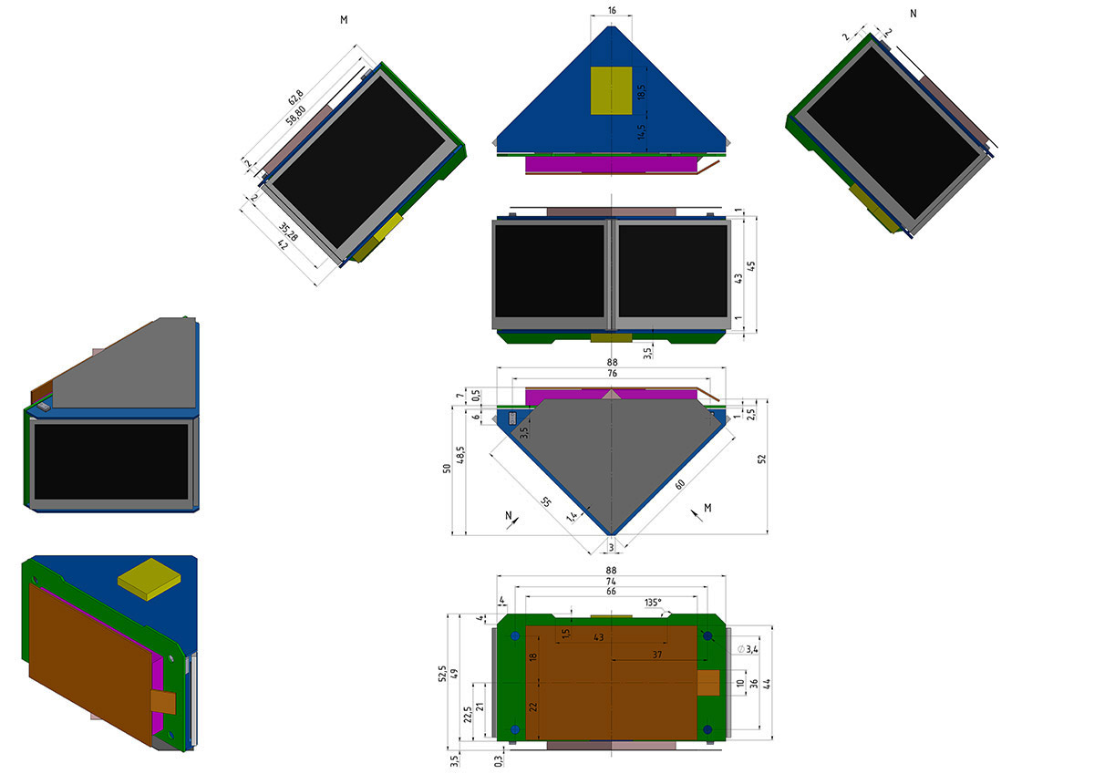 Корпус будет прозрачным со стороны боковых и верхних граней треугольника (там, где размещены экраны и солнечная панель) и непрозрачен на остальных гранях. Солнечная панель — чёрного или темно-синего цвета. Черновики: