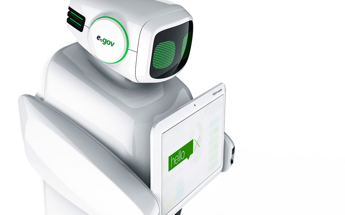 Помимо корпуса, робот (его назвали E-Gov) должен был состоять из системного блока, внешней антенны, сенсорного монитора, принтера формата А4, 2D-сканера штрих-кода, стереодинамиков, proximity-cенсора (для «обнаружения» посетителя), блока бесперебойного питания и модуля Led square matrix (он нужен, чтобы обеспечить анимацию «выражения лица» робота).