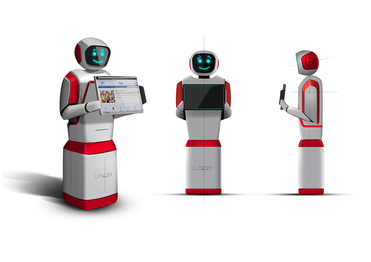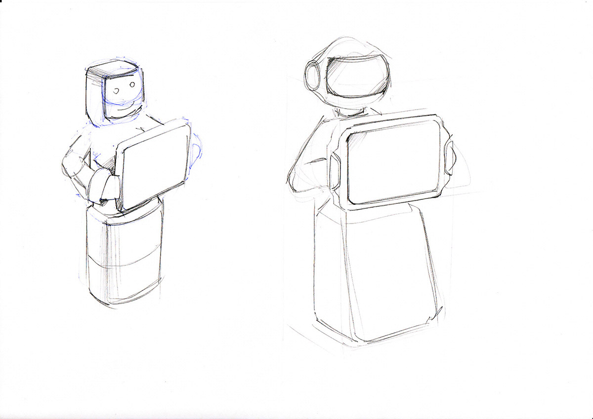 Все началось с разработки не дизайна, а компоновки. Большие ящики (тот же принтер с запасом бумаги) требовали много места, но в то же время робот должен был иметь какую-то антропоморфный вид, чтобы выглядеть более дружелюбно, чем все эти роботы-матрёшки.