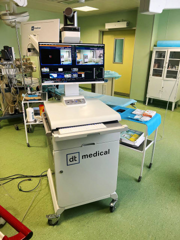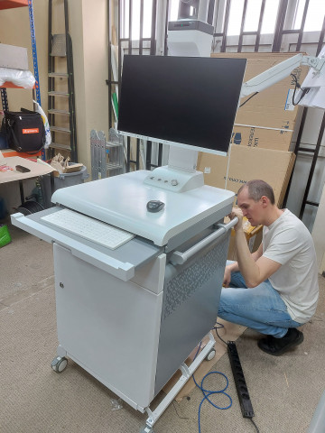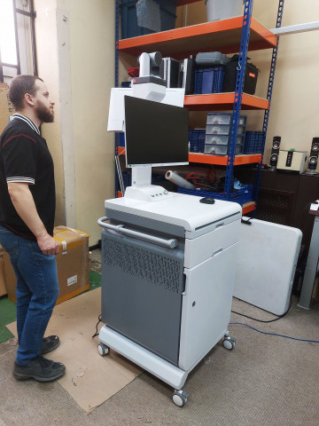 С помощью этой видеостойки обеспечивается прямая трансляция хирургических операций. На ней расположены не только два монитора с диагональю 24 дюйма, но также масса другого серверного оборудования, бесперебойник, камера, аудиомодуль и еще много чего. Видеостойку завозят в операционную (она перемещается на колесиках), устанавливают, усаживают за один монитор инженера — и все, можно начинать трансляцию. Люди, которые наблюдают за трансляцией, видят и слышат все, происходящее в операционной, а у хирургов и медперсонала под ногами не мешаются никакие кабели.