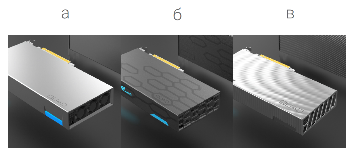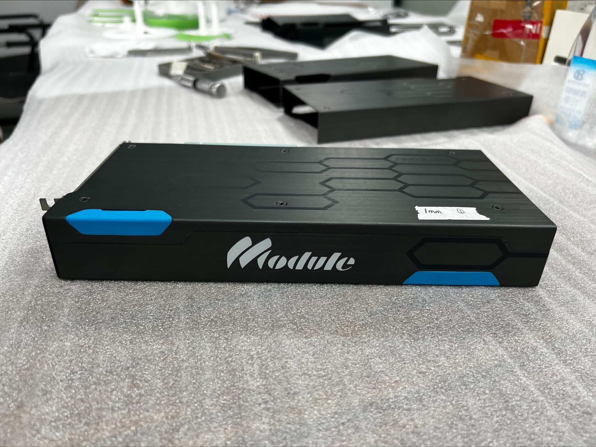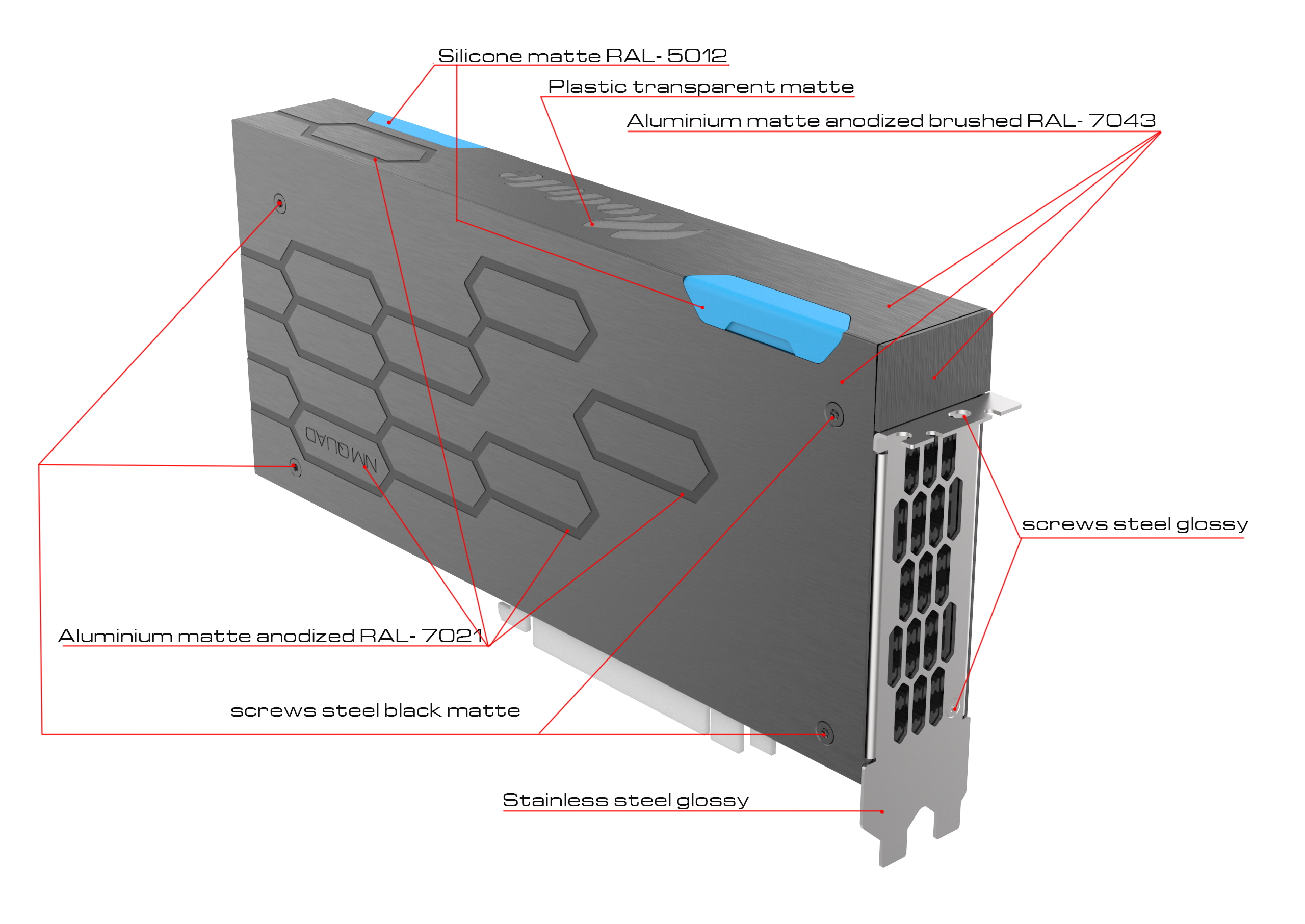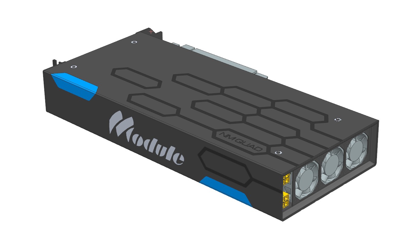 Модуль состоит двух плат, между которыми размещен радиатор (на торец радиатора будут устанавливаться три вентилятора), и элементов корпуса: панели PCIe, П-образного теплоотводящего кожуха из алюминиевого сплава со вставкой в виде логотипа производителя, задней пластины из такого же сплава, где будет информационный шильдик, декоративной задней панели (прикрывающей вентиляторы) и силиконовых заглушек краевых разъёмов.