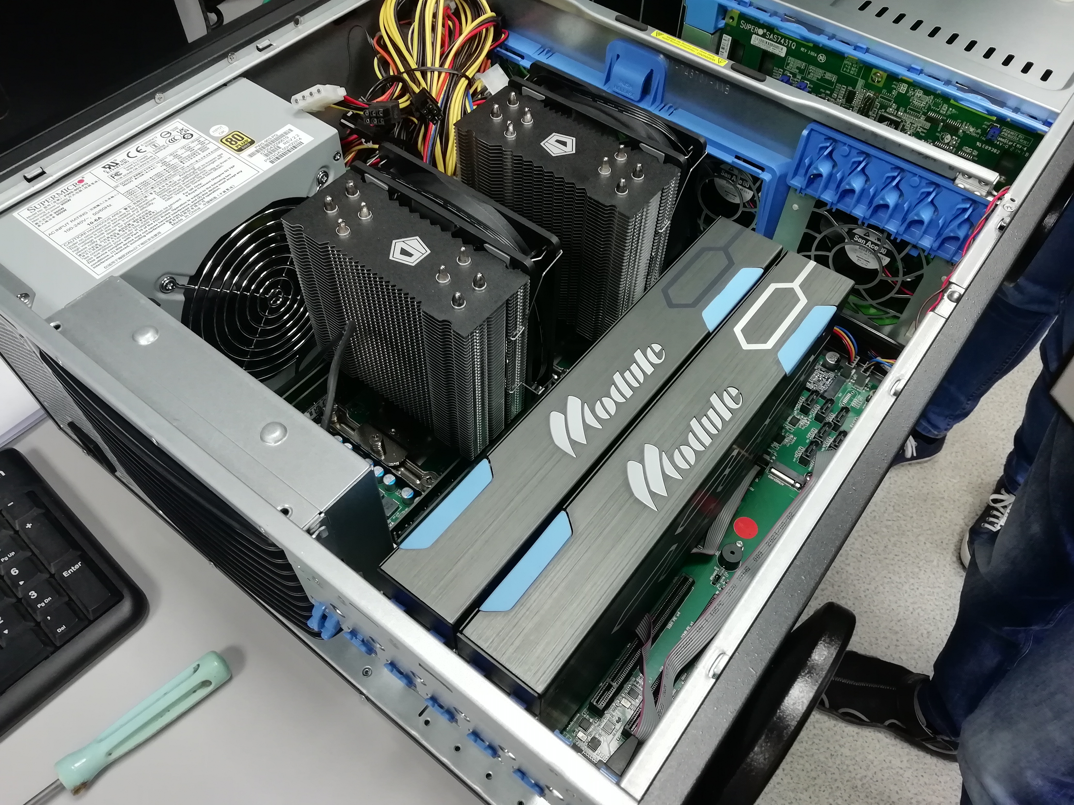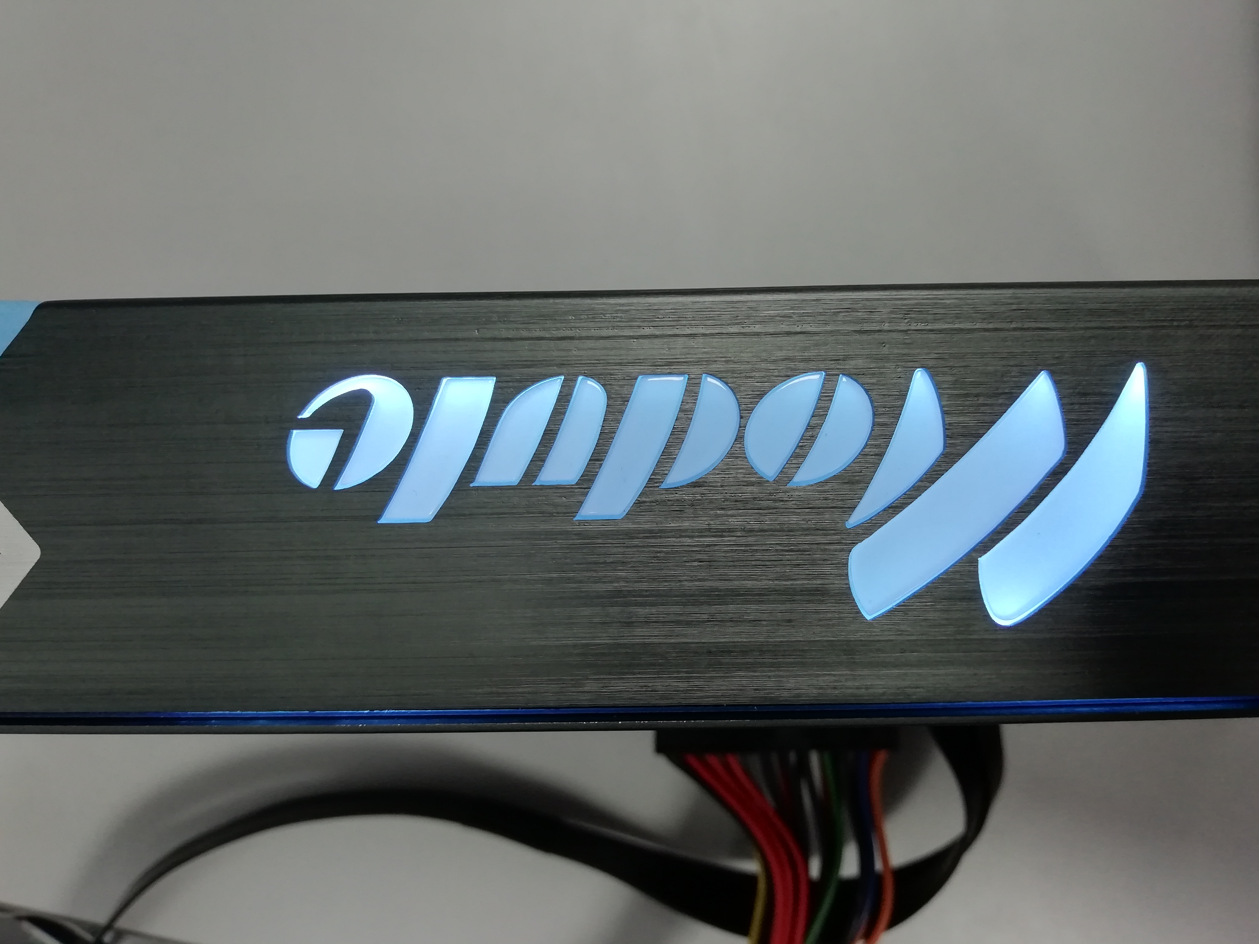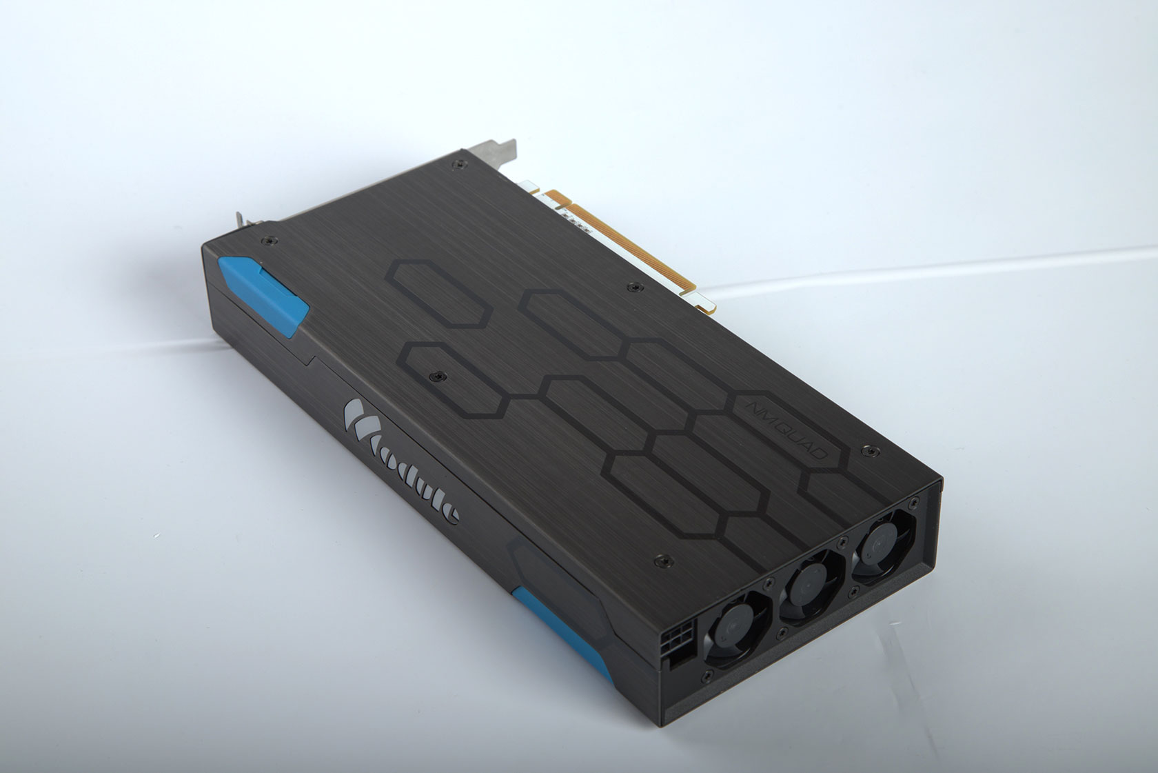 Модуль состоит двух плат, между которыми размещен радиатор (на торец радиатора будут устанавливаться три вентилятора), и элементов корпуса: панели PCIe, П-образного теплоотводящего кожуха из алюминиевого сплава со вставкой в виде логотипа производителя, задней пластины из такого же сплава, где будет информационный шильдик, декоративной задней панели (прикрывающей вентиляторы) и силиконовых заглушек краевых разъёмов.