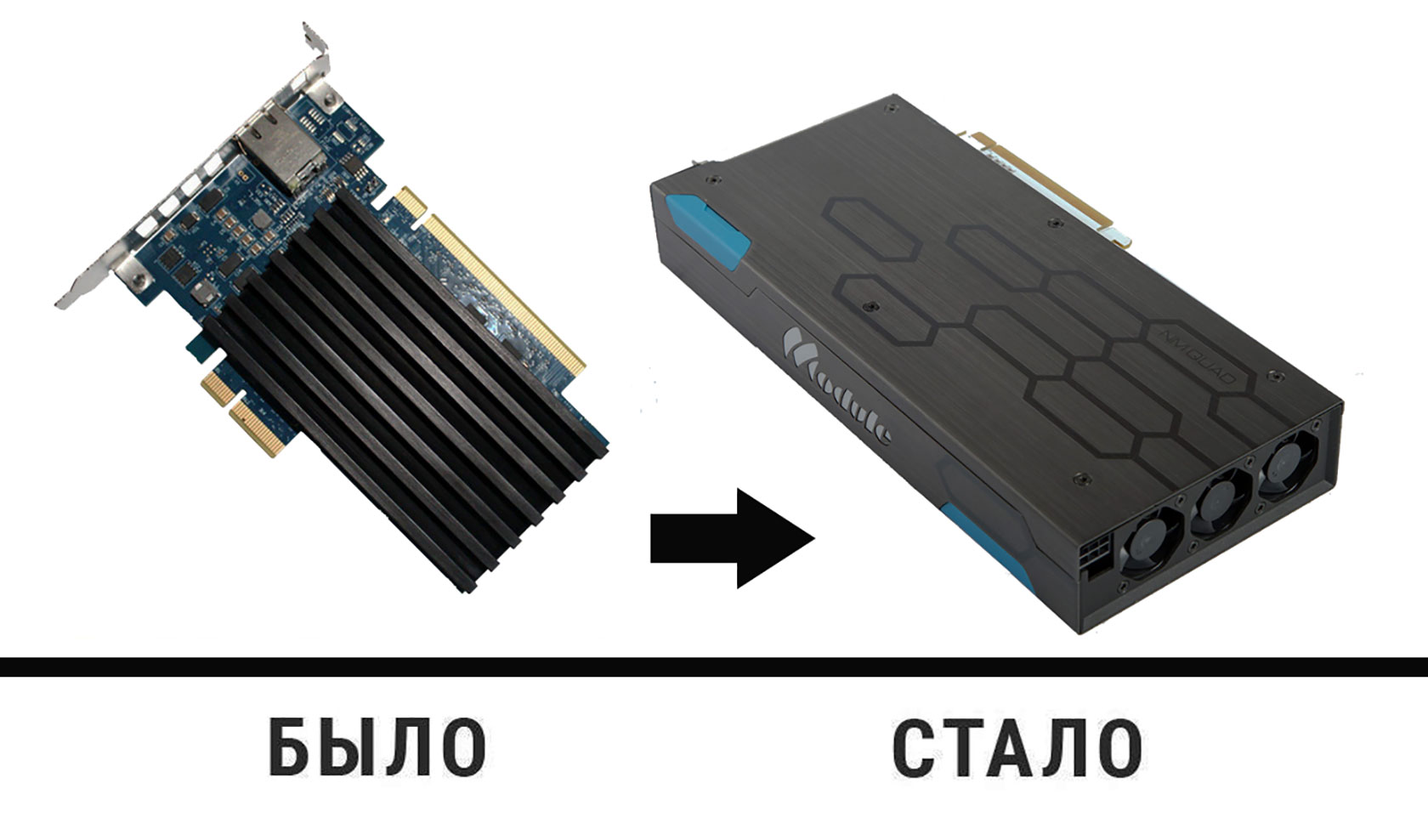 Но все в прошлом. Наше устройство — двухслотовый модуль PCIe. Габариты в целом определяются стандартом PCIe, элементы корпуса на тыльной стороне платы с разъёмом не должны превышать 2,5 мм вместе с крепежом. Вот модель: