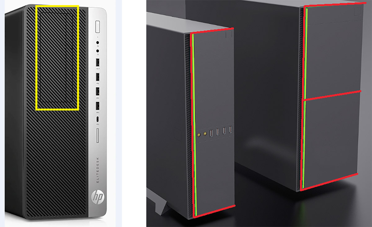 Но нужны правки — сделать два варианта кнопок, с логотипом и без; проработать светодиодную подсветку вокруг них, и самое главное — предусмотреть внешние отсеки для возможной установки дополнительных устройств (те же USB-разъёмы) и сделать дверцу, их закрывающую (пример, как делать не надо — слева) как это у HP (явно видно что отсек). Размеры таких дверей на рисунке выделены красным; дверца фиксируется на магнит.