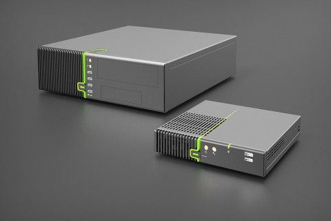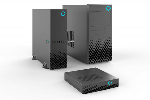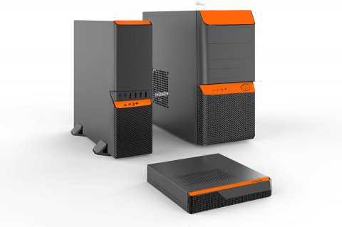 Первый — корпус объемом 1 л для ультракомпактного офисного ПК. Корпус может крепиться и на заднюю стенку монитора (лицевая панель смотрит вбок), и под столешницей. Можно и не закреплять, а поставить его горизонтально на стол или вертикально — на подставку.