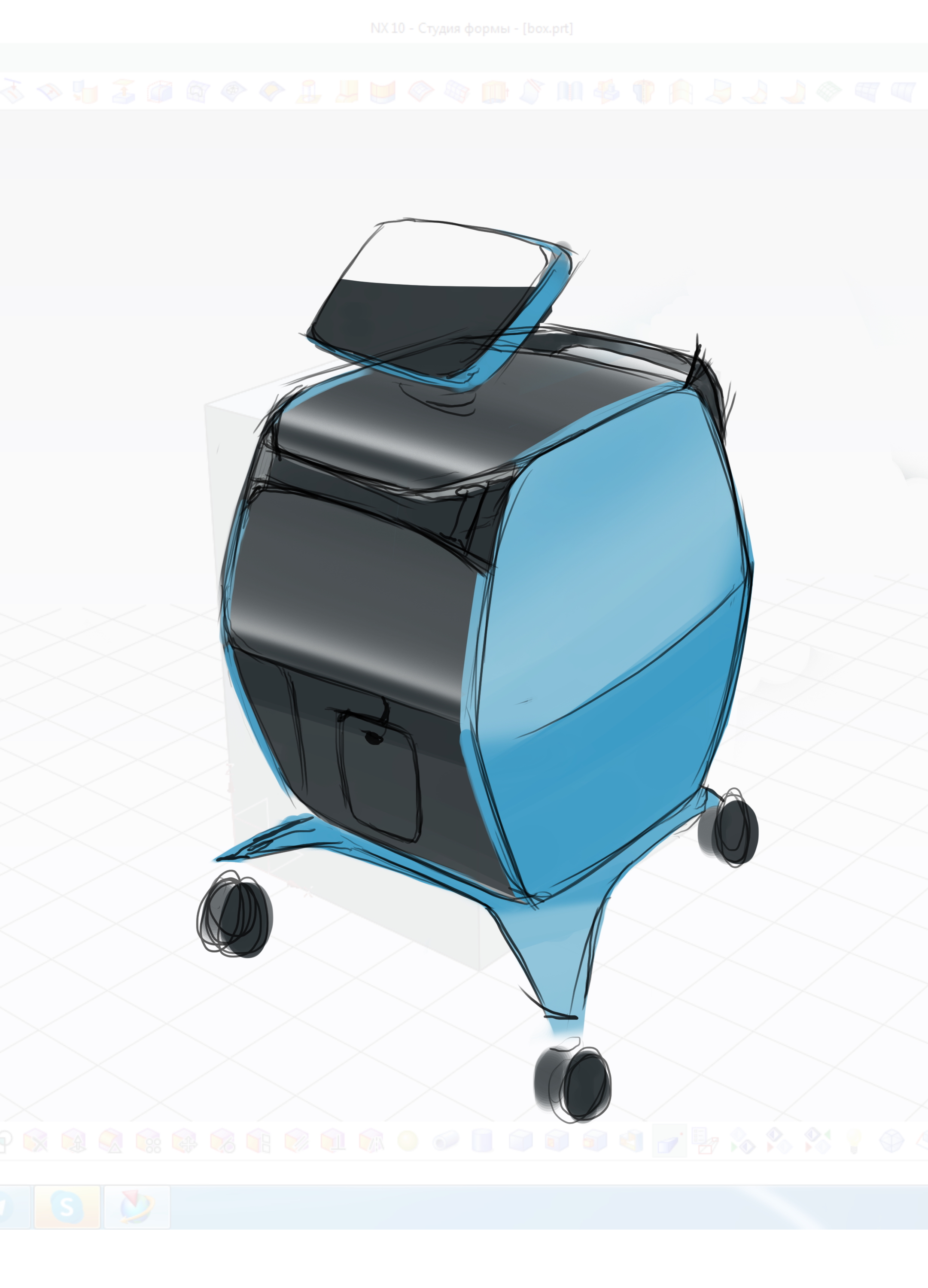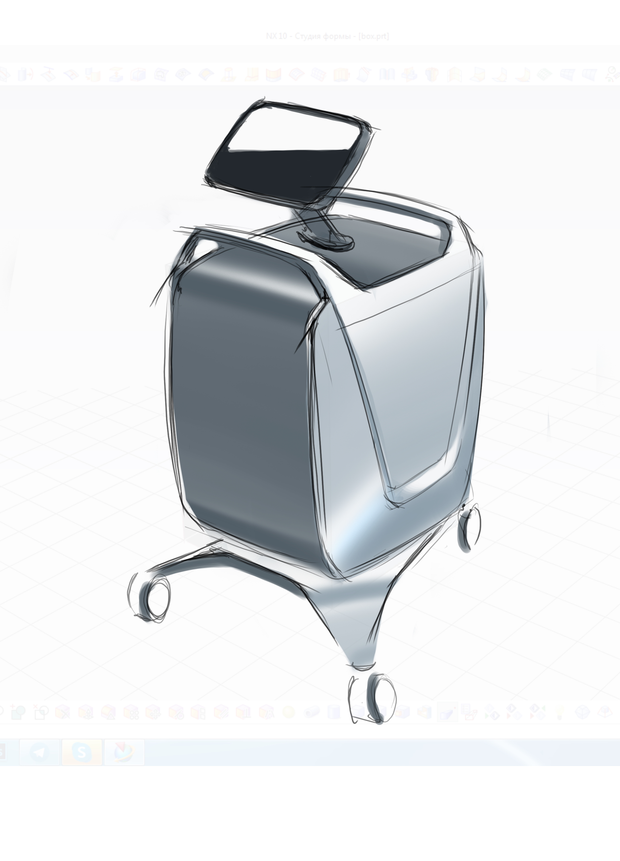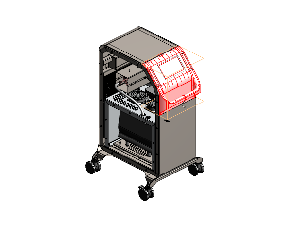 Делаем напольный корпус аппарата для косметической процедуры — жидкостного пилинга. Он работает как краскопульт с компрессором: последний подает под давлением воздух через пневмомагистрали в специальную насадку. Ею, собственно, и проводят процедуру; сам аппарат в это время стоит на полу рядом с врачом и управляется при помощи педали и дисплея.
