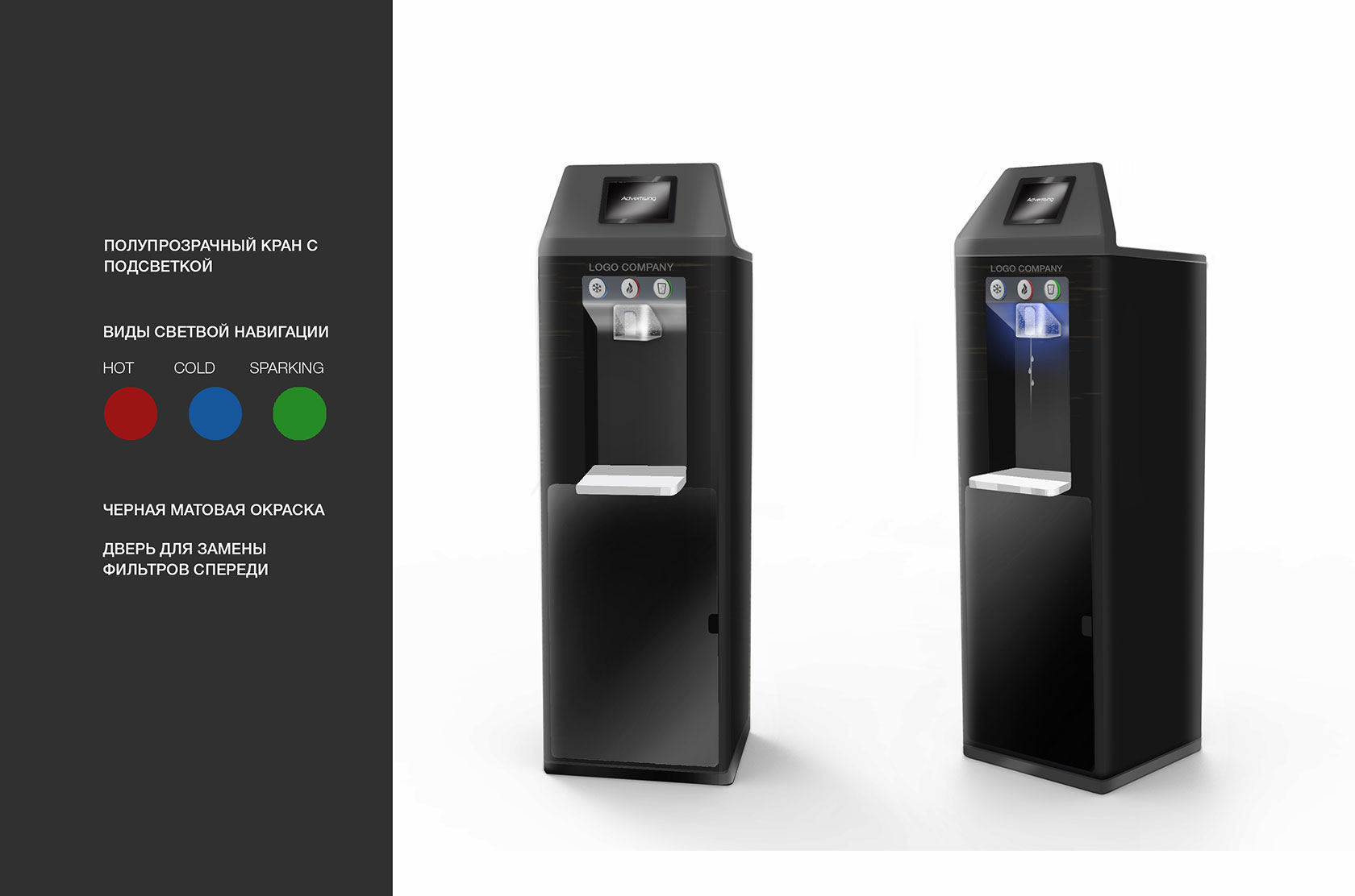 Функционал пурифайера такой же, как и у обычного кулера: он обеспечивает нагрев или охлаждение фильтрованной воды. Но, в отличие от кулера, где источник воды — только готовые ёмкости наподобие двадцатилитровых бутылок, пурифайер подключается напрямую к водопроводу. Делаем дизайн новой модели пурифайера.