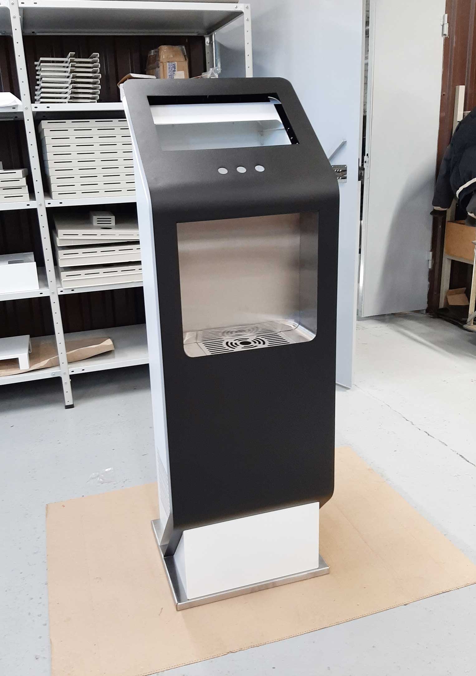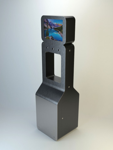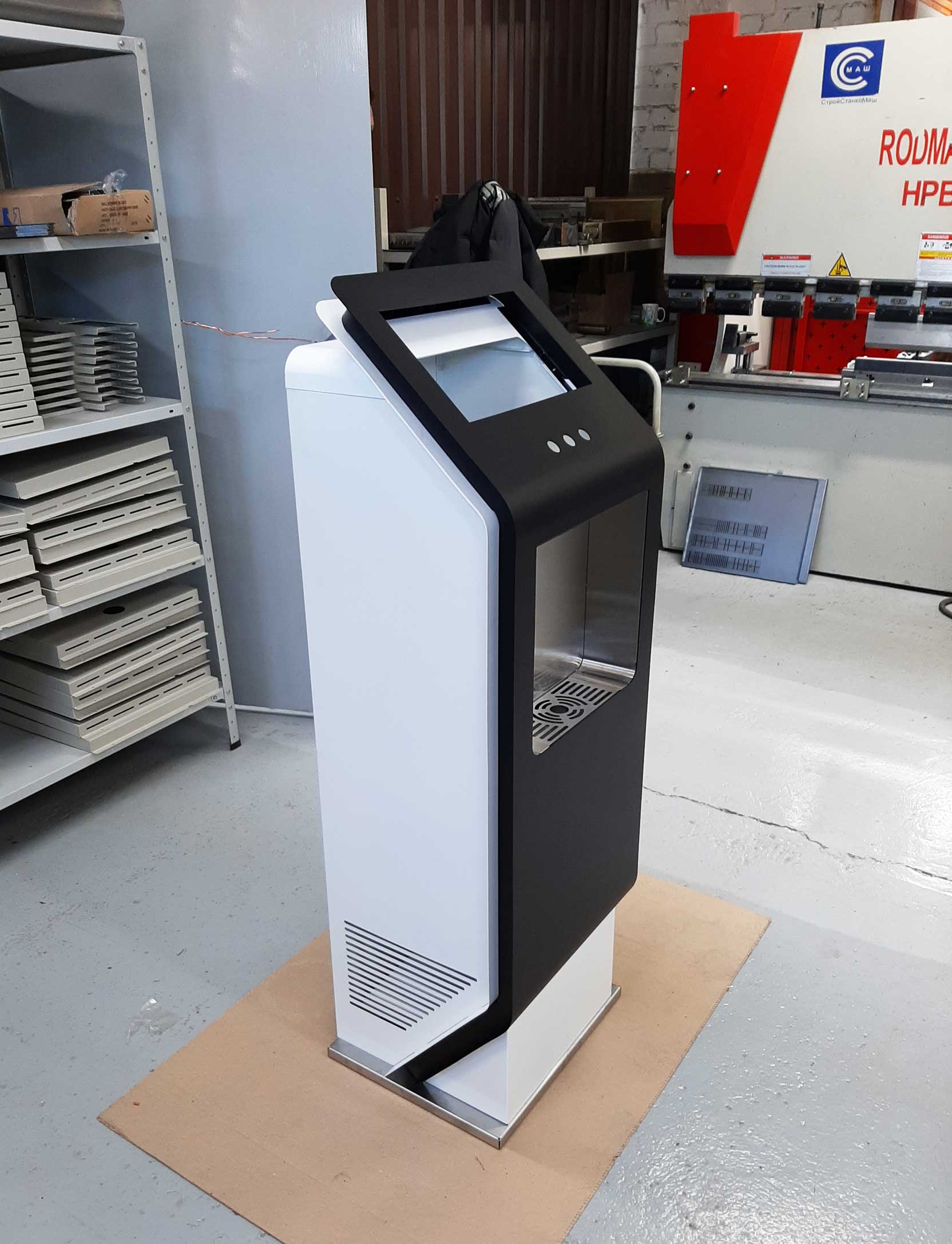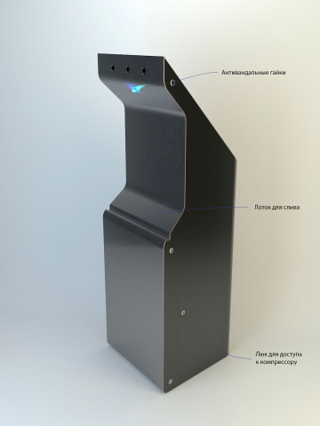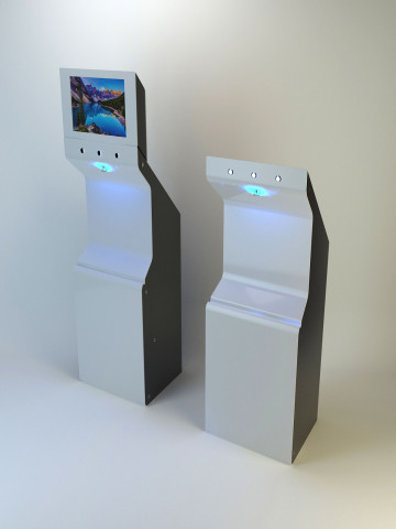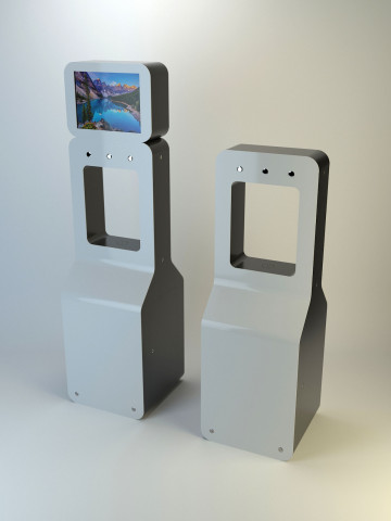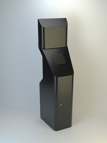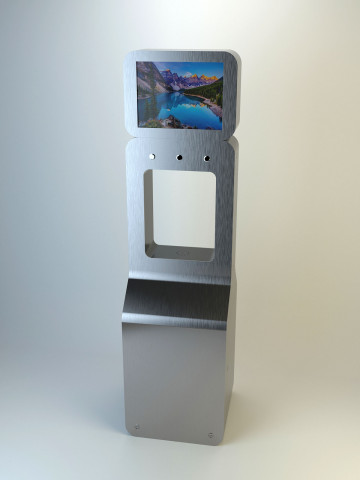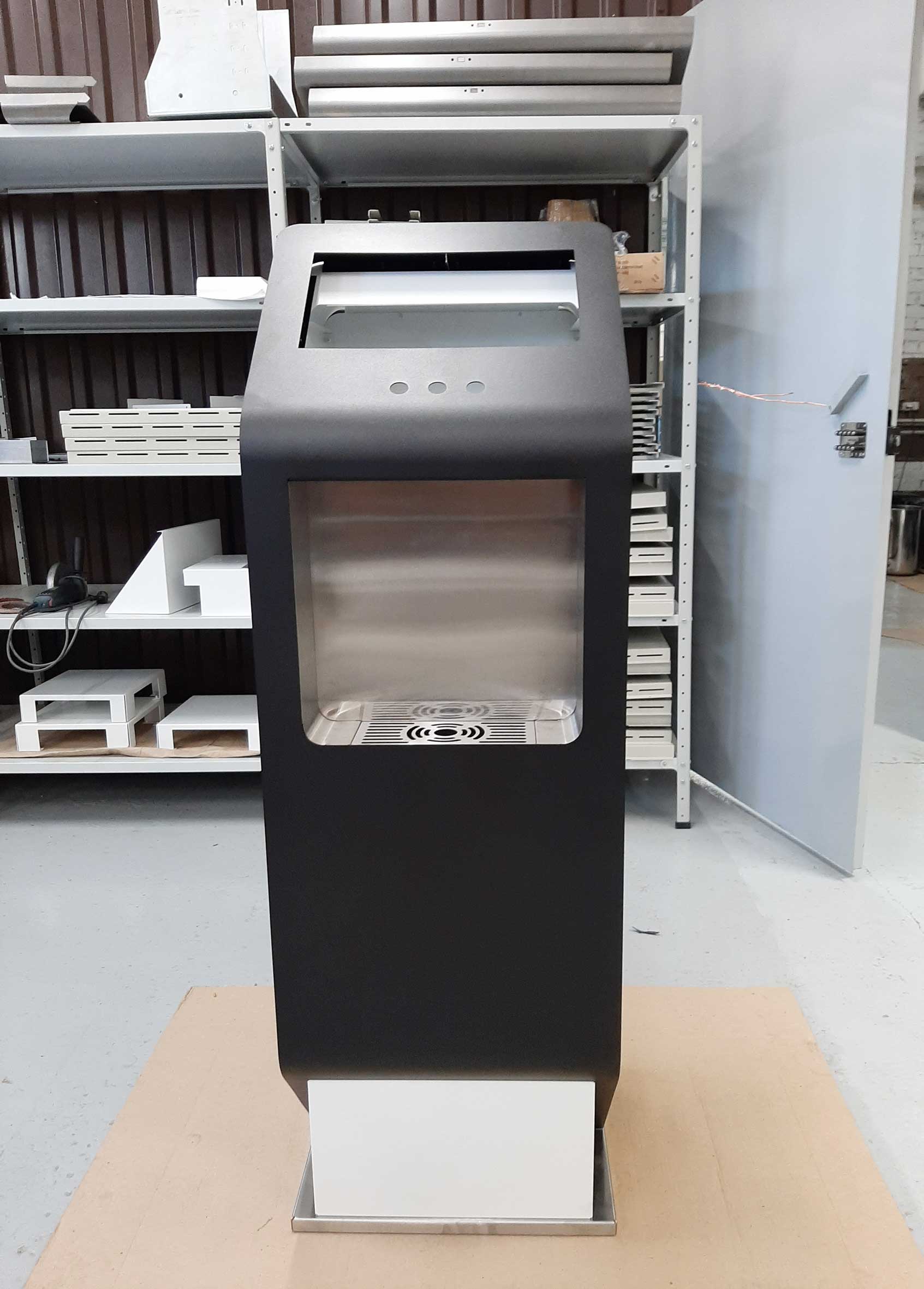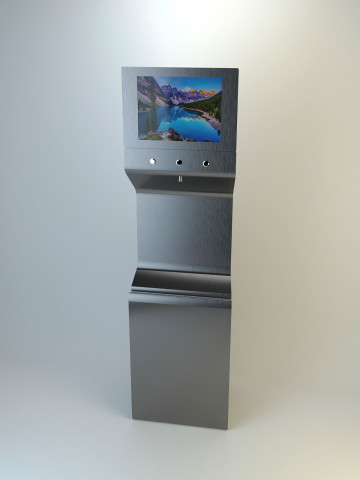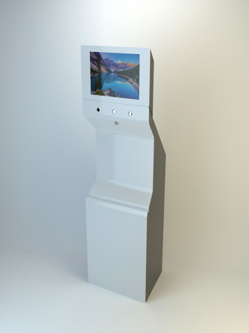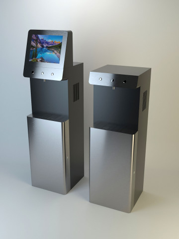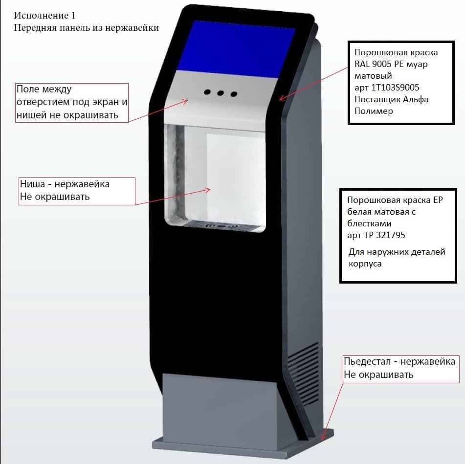 Состав устройства: напольный металлический корпус, защищённый от несанкционированного доступа; опционально — надстройка для установки рекламного монитора, внутреннее наполнение (схема — ниже).