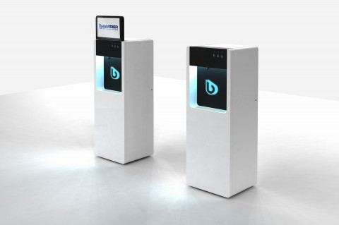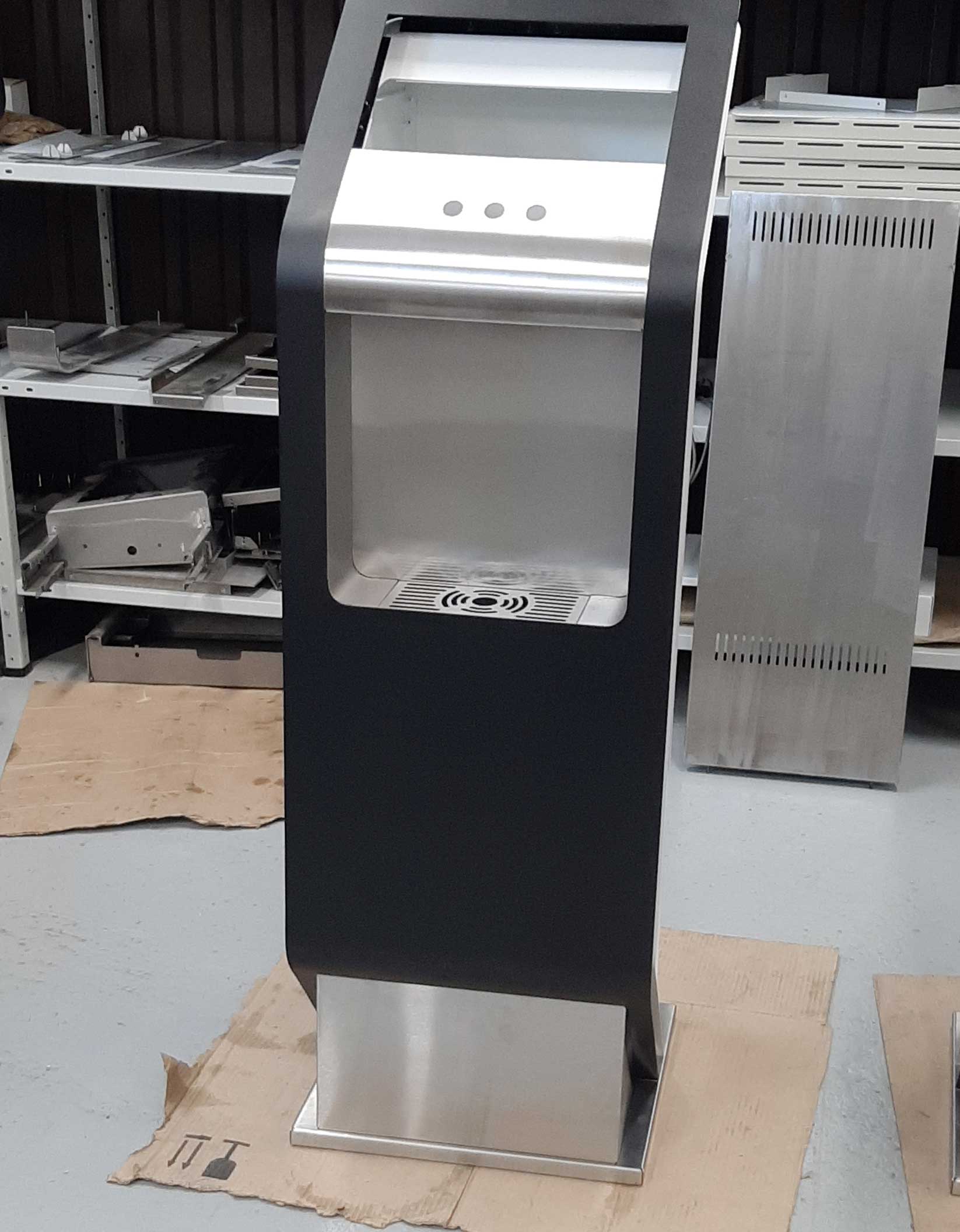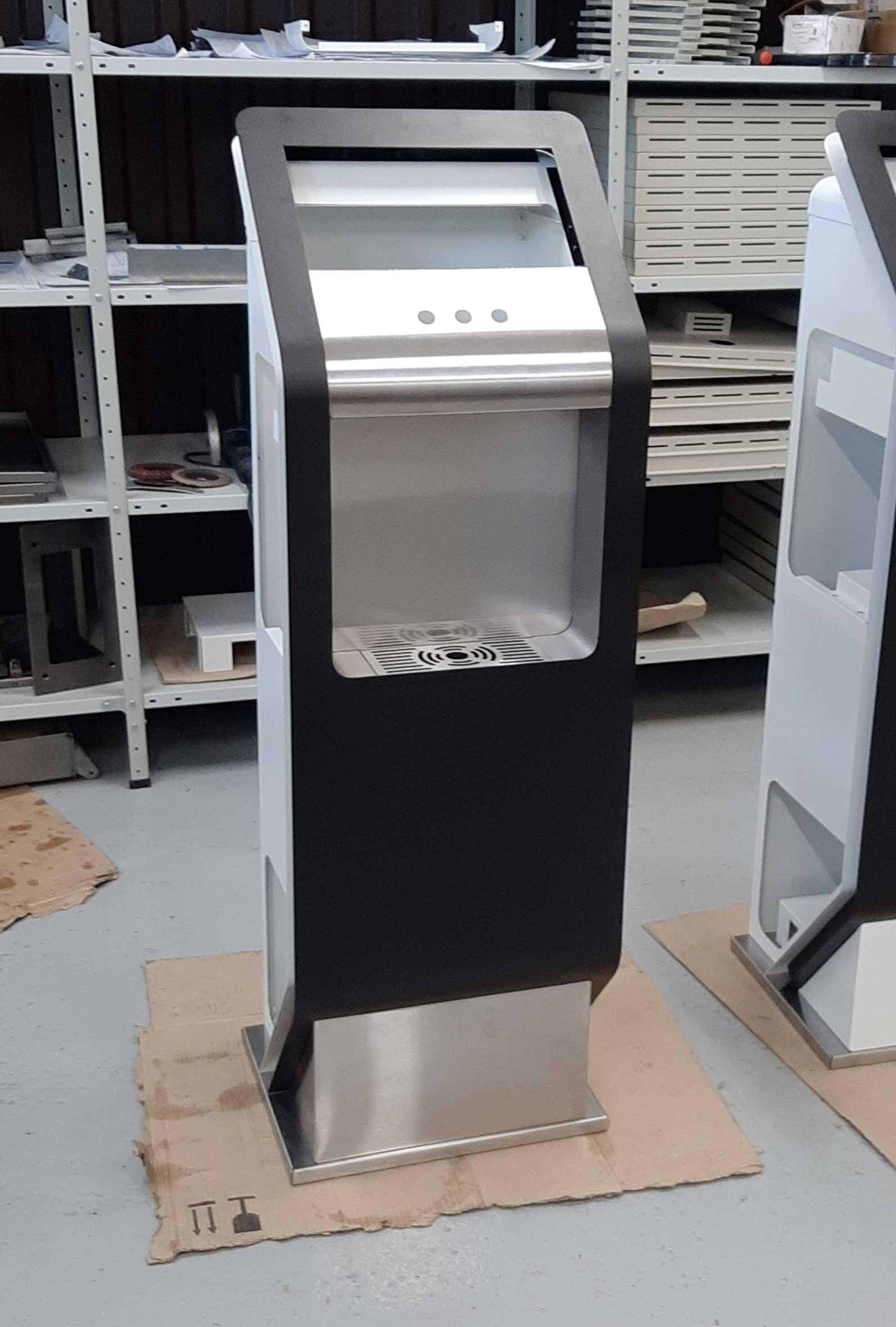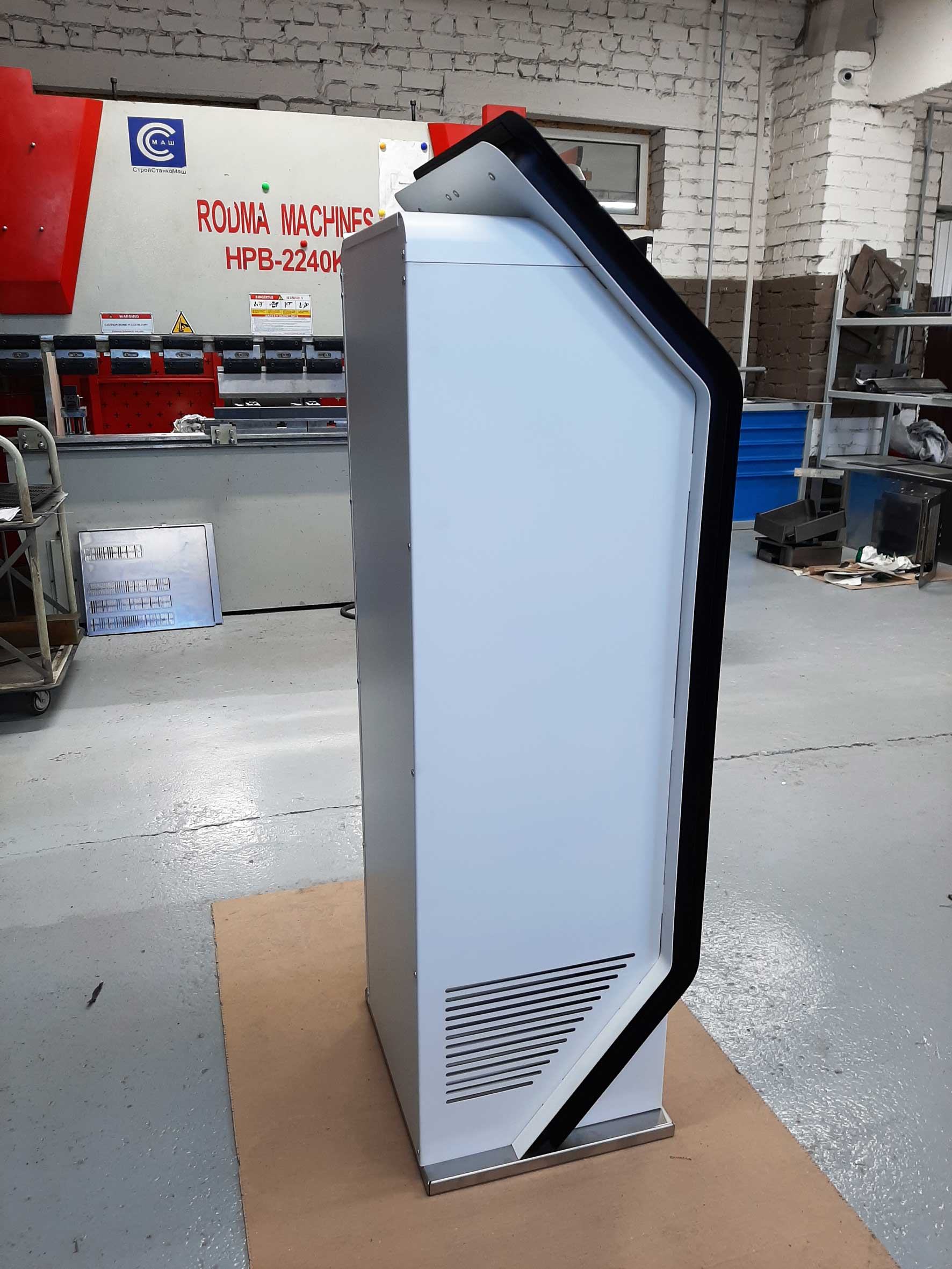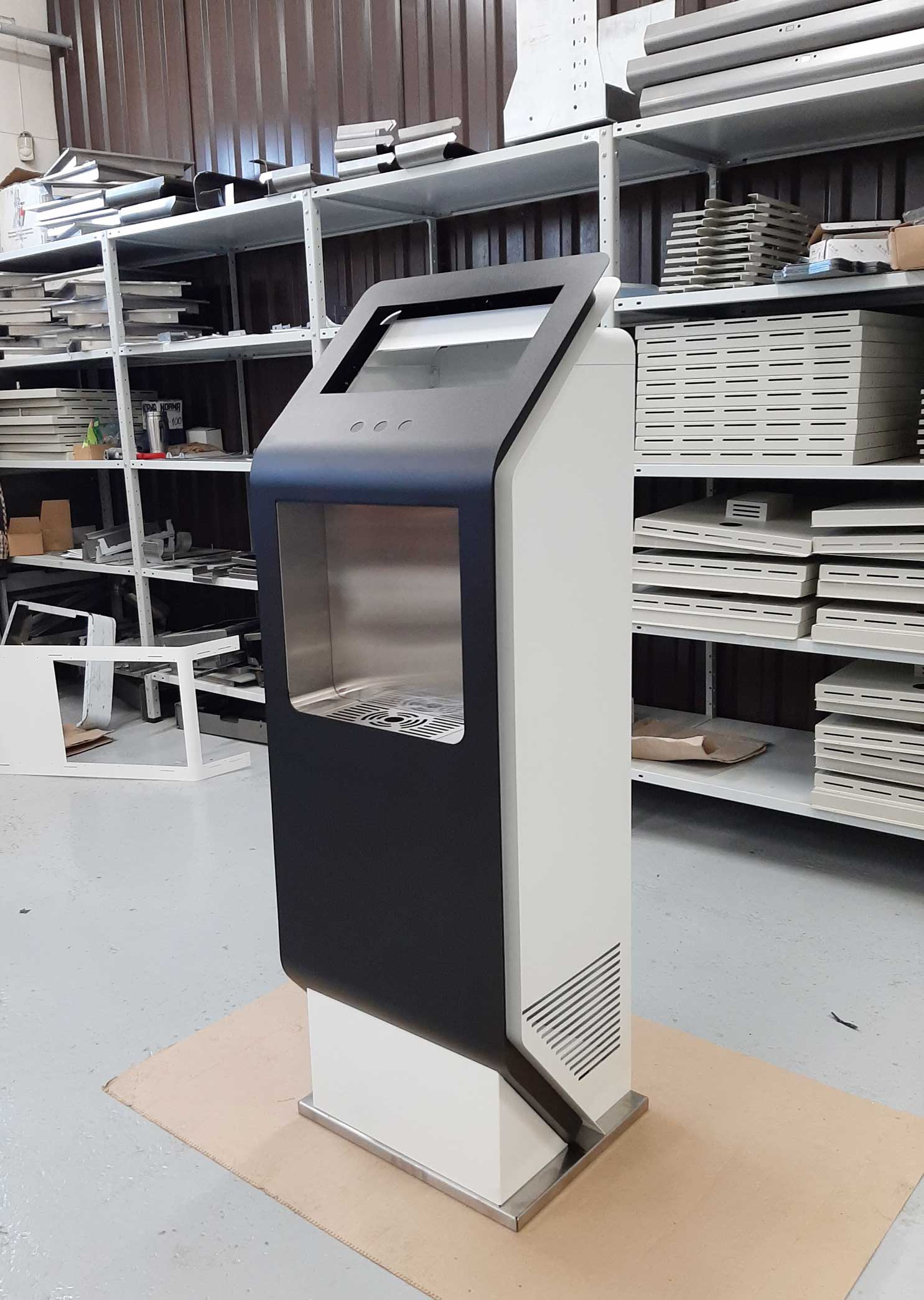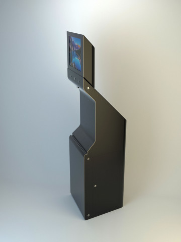 Состав устройства: напольный металлический корпус, защищённый от несанкционированного доступа; опционально — надстройка для установки рекламного монитора, внутреннее наполнение (схема — ниже).