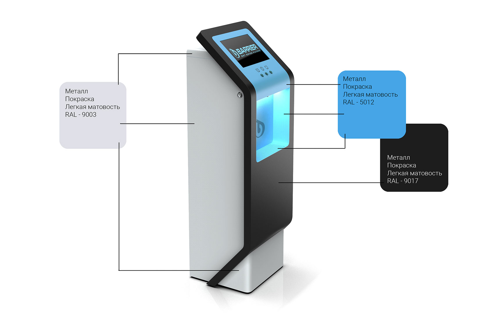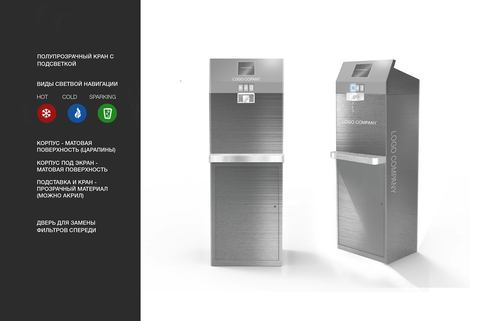 И стандартное требование: на корпусе пурифайера должно быть место для размещения названия компании, названия модели, логотипа производителя и подписей к элементам управления
