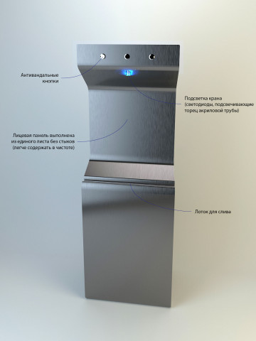 В новой модели нужно предусмотреть подсветку места установки наполняемой емкости в момент налива. Также должна быть возможность наполнения бутылок для воды с узким горлом — чтобы наполняющему было видно кран, и он мог пристроить бутылку так, чтобы вода не разбрызгивалась.