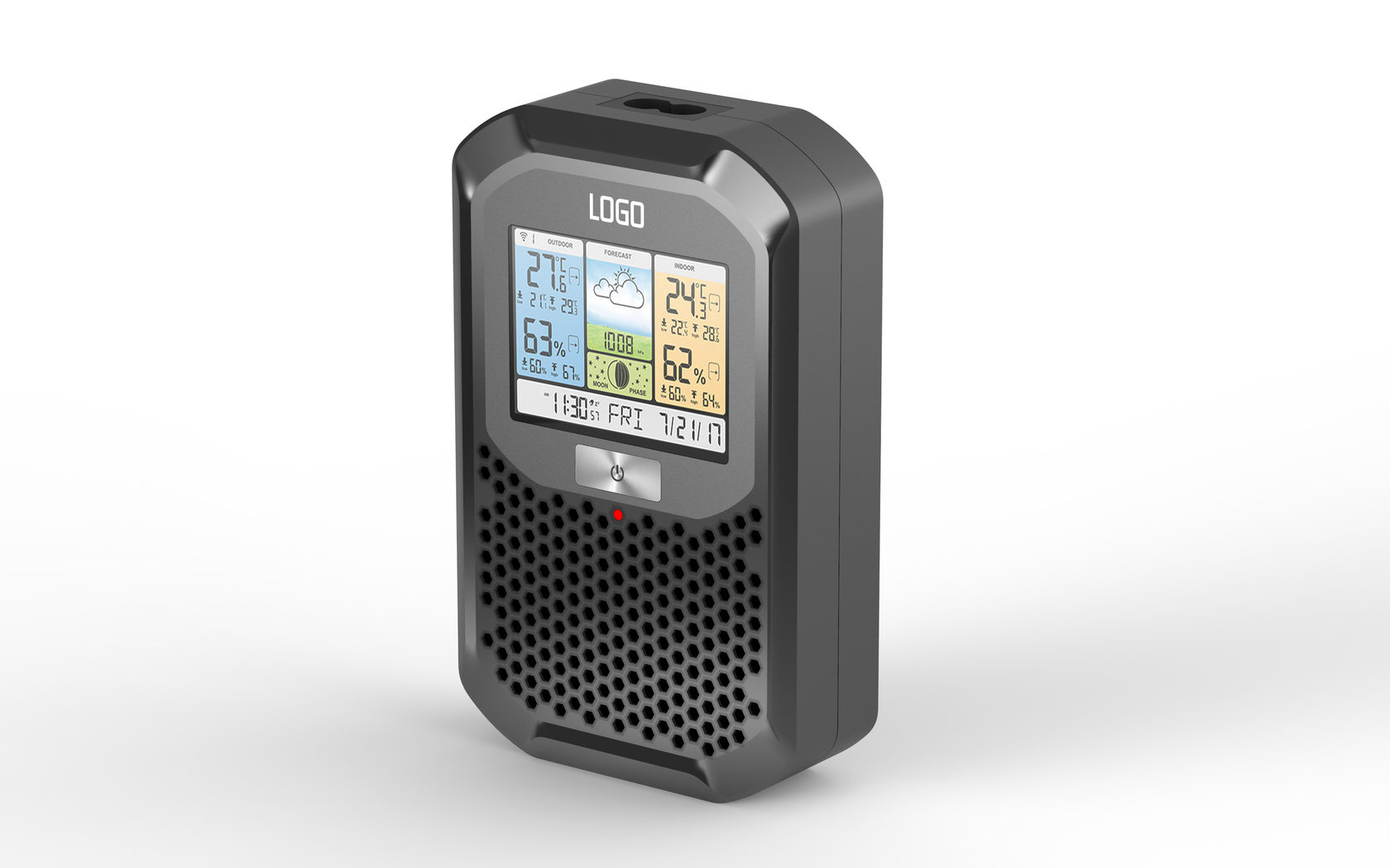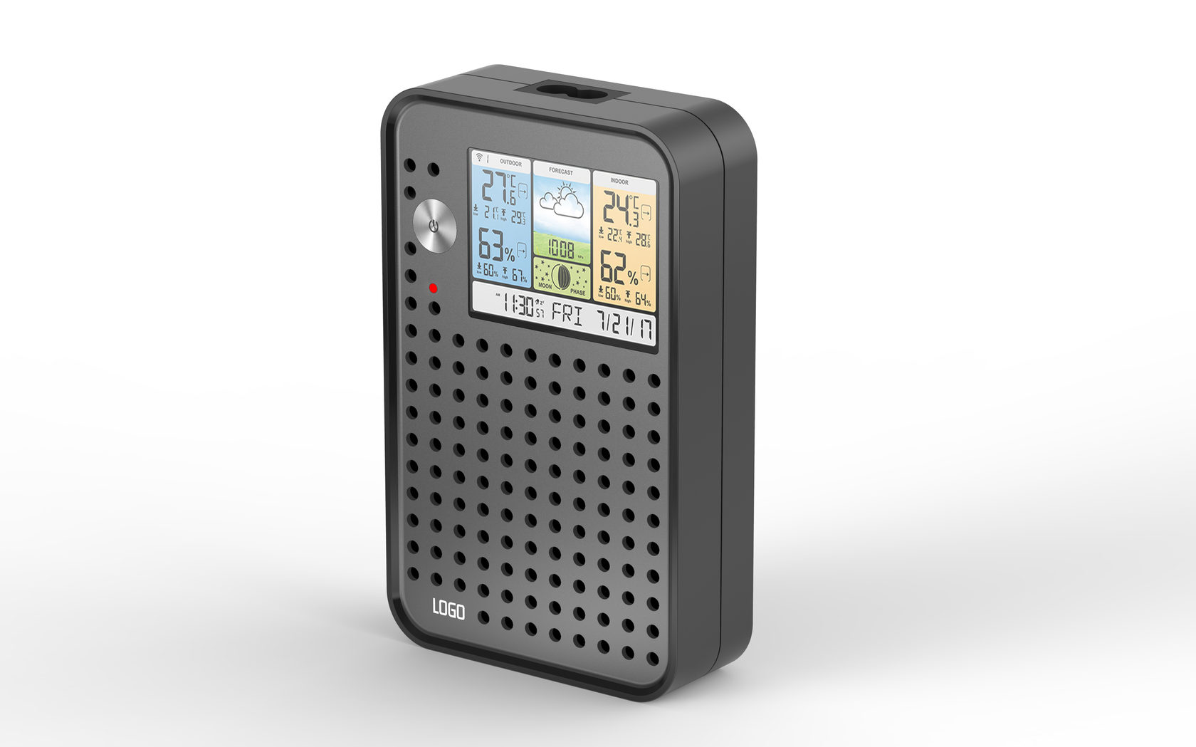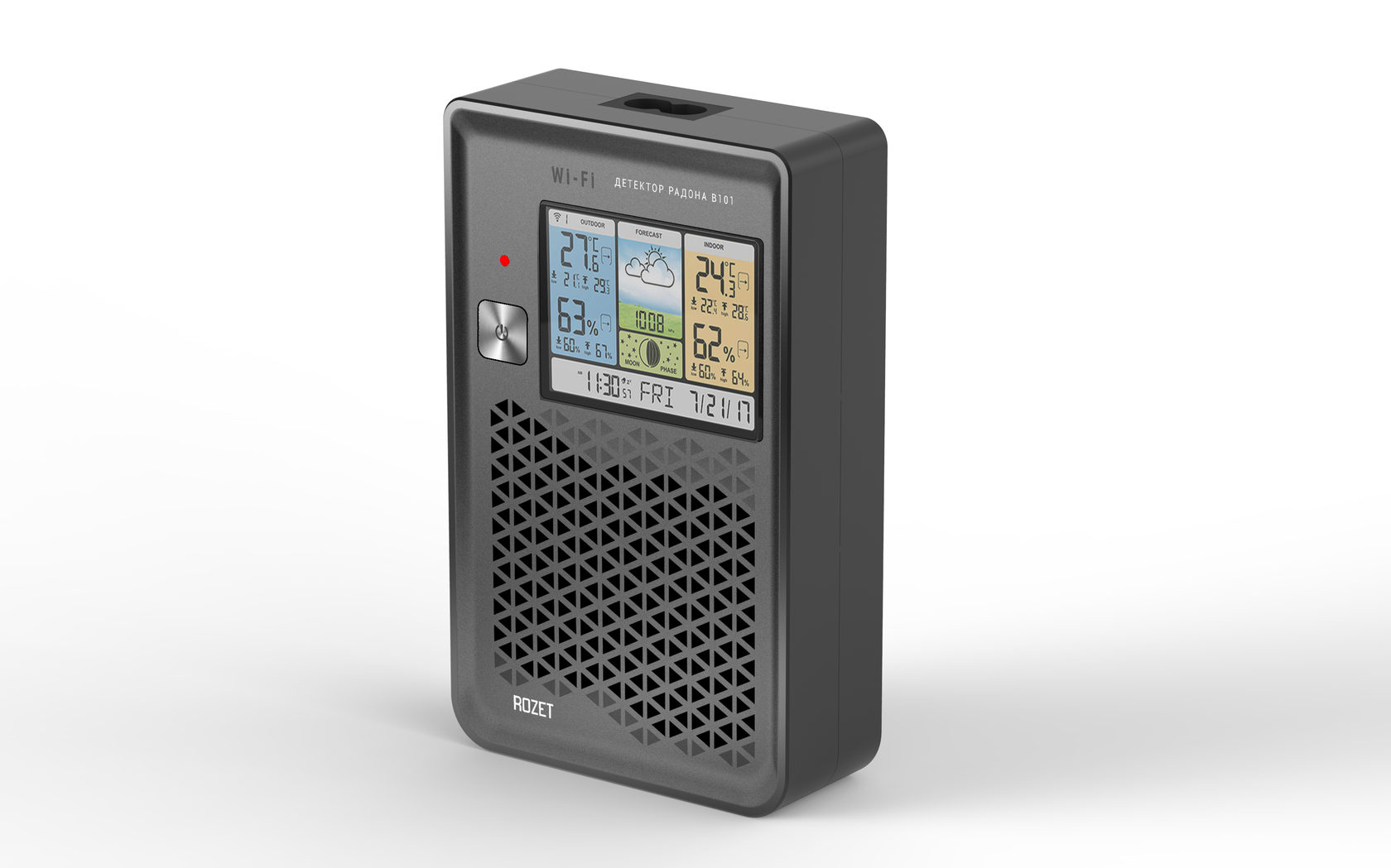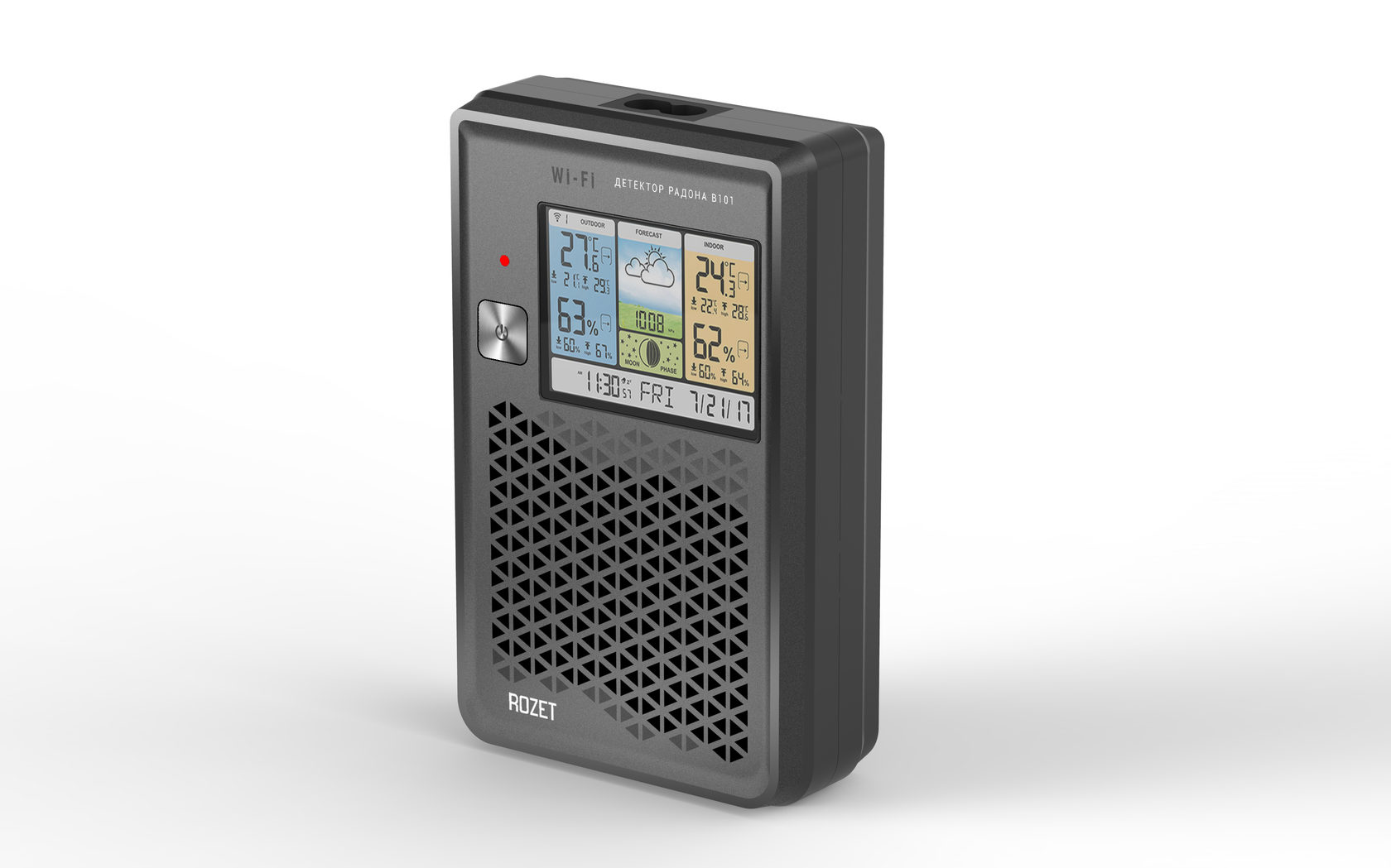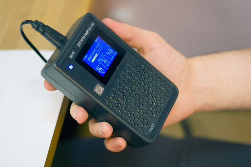 Детектор радона — экомонитор для помещений. Раз в минуту он определяет уровень радона и продуктов его распада в воздухе. Модификации экомонитора могут также измерять температуру, влажность, атмосферное давление и прочие показатели.
