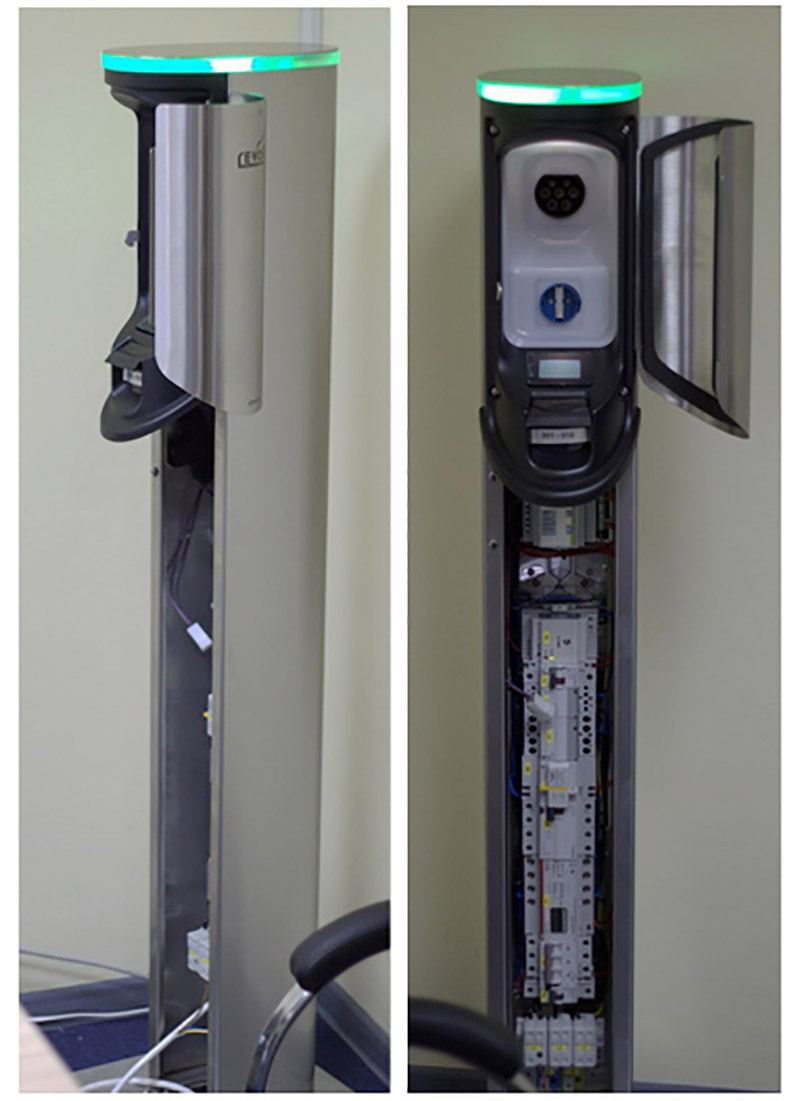 Вторая зона — «клиентская»; с закрытым антивандальным стеклом сенсорным дисплеем и двумя видами разъёмов для подключения кабелей (Mode 3, Type 2 — Mennekes и Schuko), считывателем для RFID-карт, GPRS-модемом и световым индикатором, показывающим процесс зарядки.