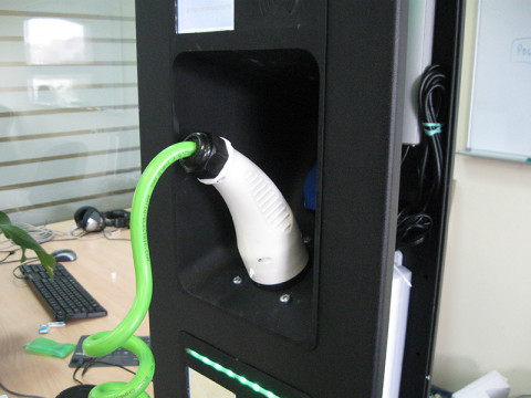 Чтобы «зарядиться» на такой станции, автовладелец сначала должен авторизоваться — для этого он подносит свою карту к RFID-считывателю. И только после этого откроется дверца, закрывающая розетки. Затем можно подключить к розетке свой кабель, закрыть дверцу и вернуться часов через 8, когда зарядка завершится. Чтобы отсоединиться, придётся снова авторизовываться.