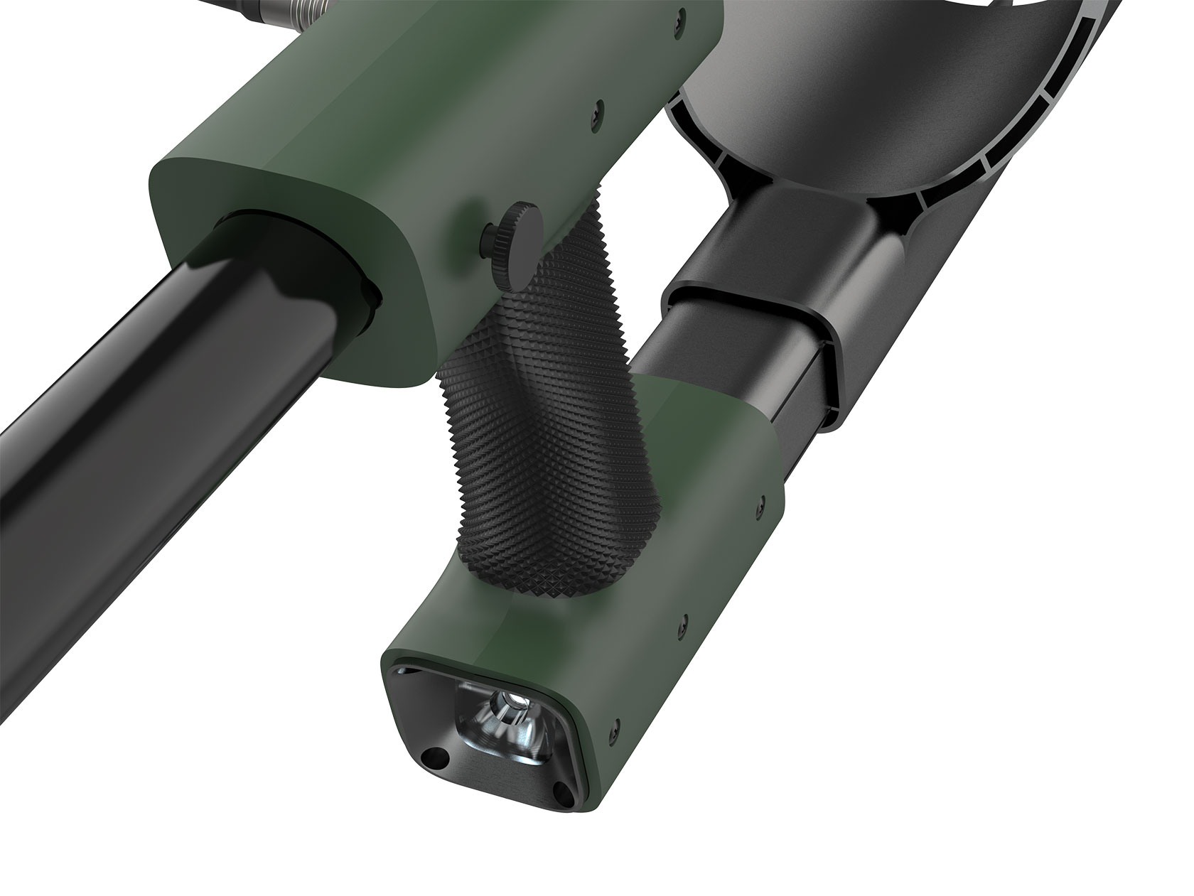 Здесь поможет штанга с рукояткой. Последняя будет удерживать сразу несколько элементов — навесной блок детектирования, пульт управления и аккумулятор. Внутри штанги размещены кабели.
