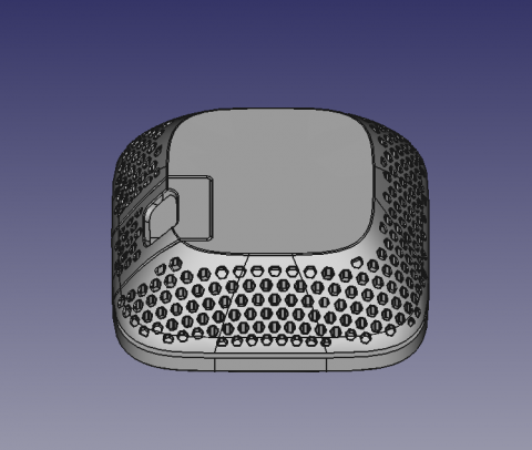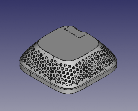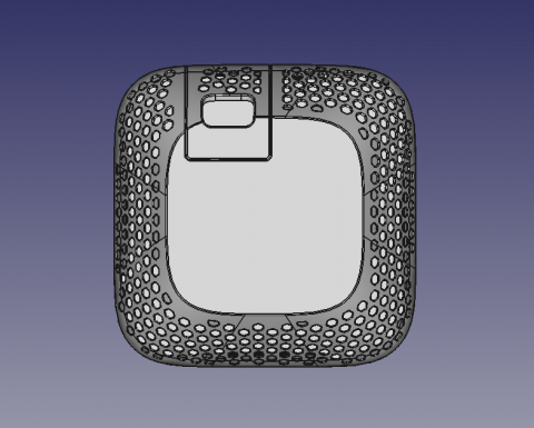 | Что нужно сделать? Задачи | 1. Устройство — бытовое, формат — «Умный дом», надо сделать «модно-молодежно». Но в то же время солидно. Это массовый бытовой продукт низкого ценового сегмента. Следовательно, необходимо минимальное количество деталей, закладных элементов, точек сборки и крепежа и пр. — для удешевления производства. 2. Обязательна перфорация на боковых стенках корпуса. Желательно — на лицевой панели корпуса, для свободной циркуляции воздуха, чтобы обойтись без вентиляторов. 3. Корпус состоит из двух частей. Нужно, чтобы стык между частями был заметен по минимуму. 4. Внутри корпуса есть приёмо-передающее устройство, экранирование антенны которого крайне нежелательно. 5. IP30 или IP40. 6. Должна быть звуковая сигнализация на 85 Дб, а также светодиод для индикации состояния работы. 7. Предусмотреть внутреннюю кнопку «Тест» с нажатием спицей/скрепкой на тыльной стороне корпуса. 8. Устройству нужен отделяемый кронштейн для крепления на стену. |