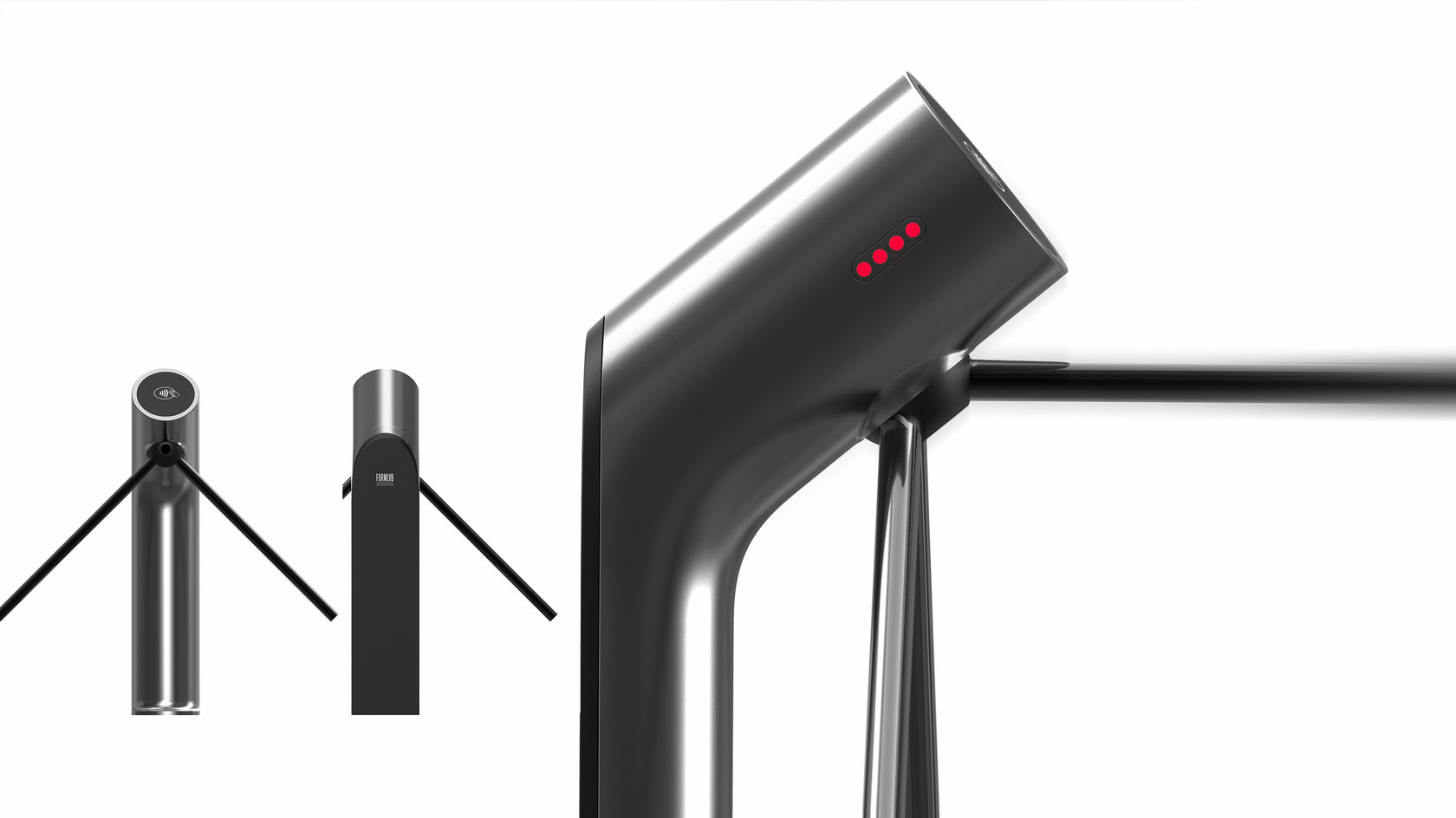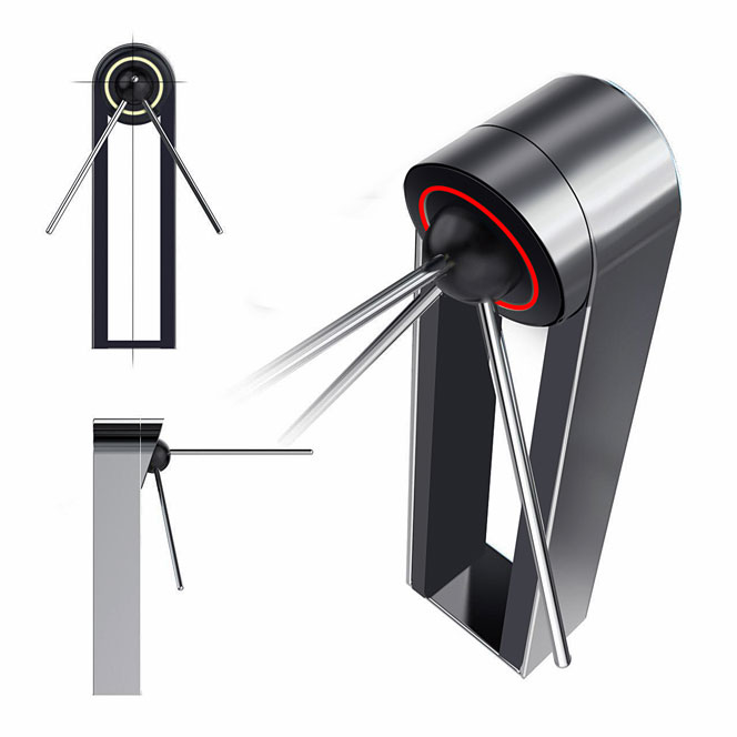 Знакомый всем турникет: простой, железный, унылый — с угловатыми формами. Используется для обеспечения пропускного режима. Конструкция проста: в стойке сосредоточена вся электроника, верхняя часть — картридер и механическая часть, опускающиеся и поднимающиеся металлические планки (тренога). Есть пульт управления.